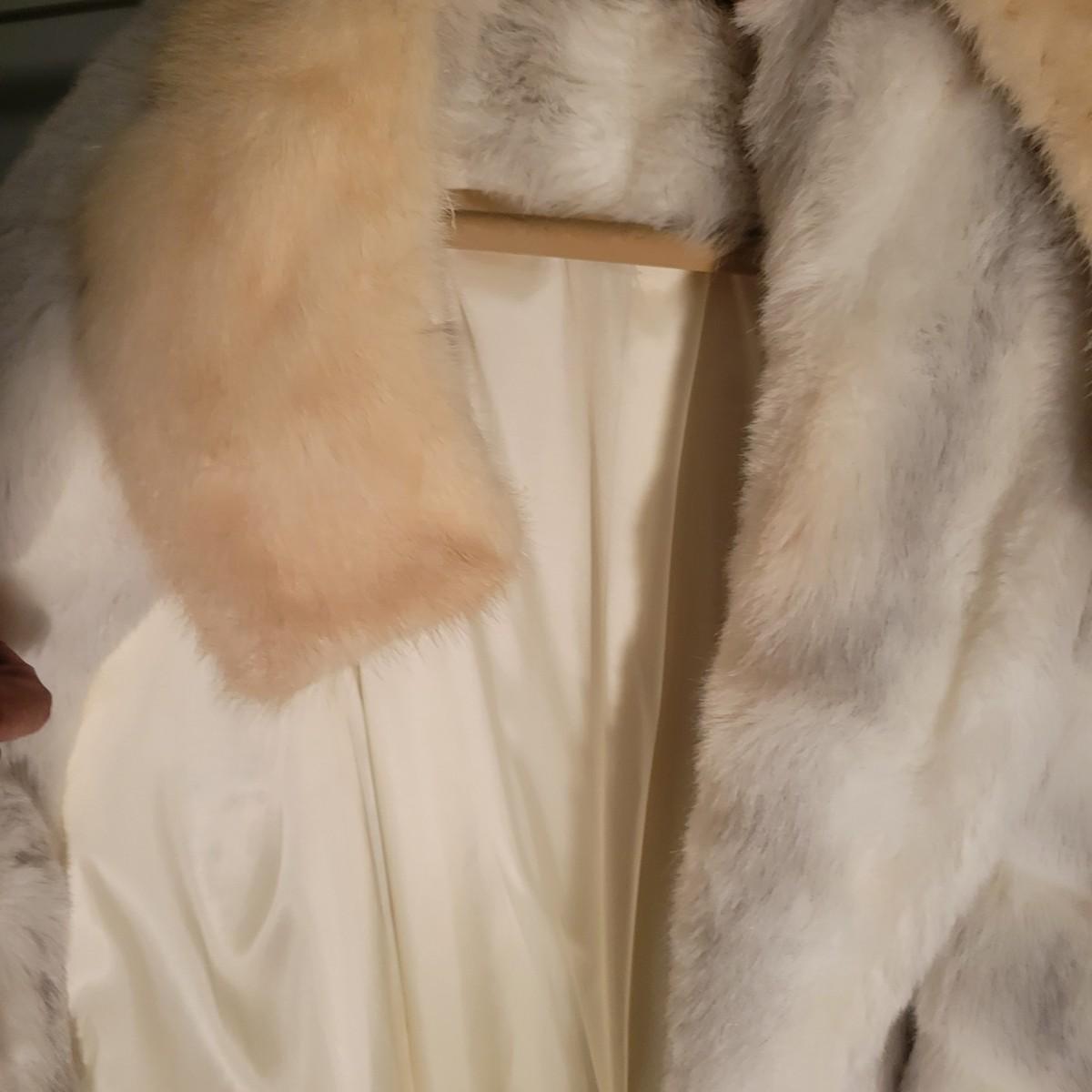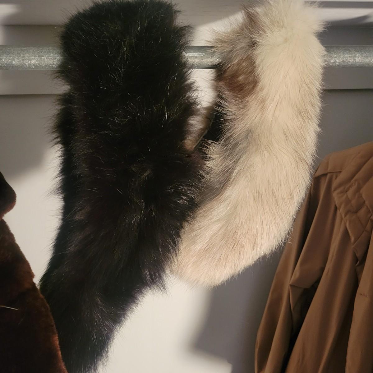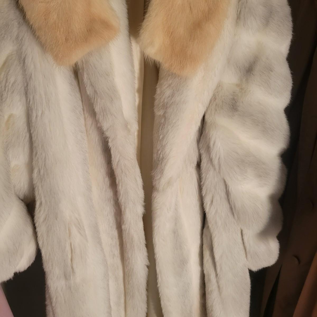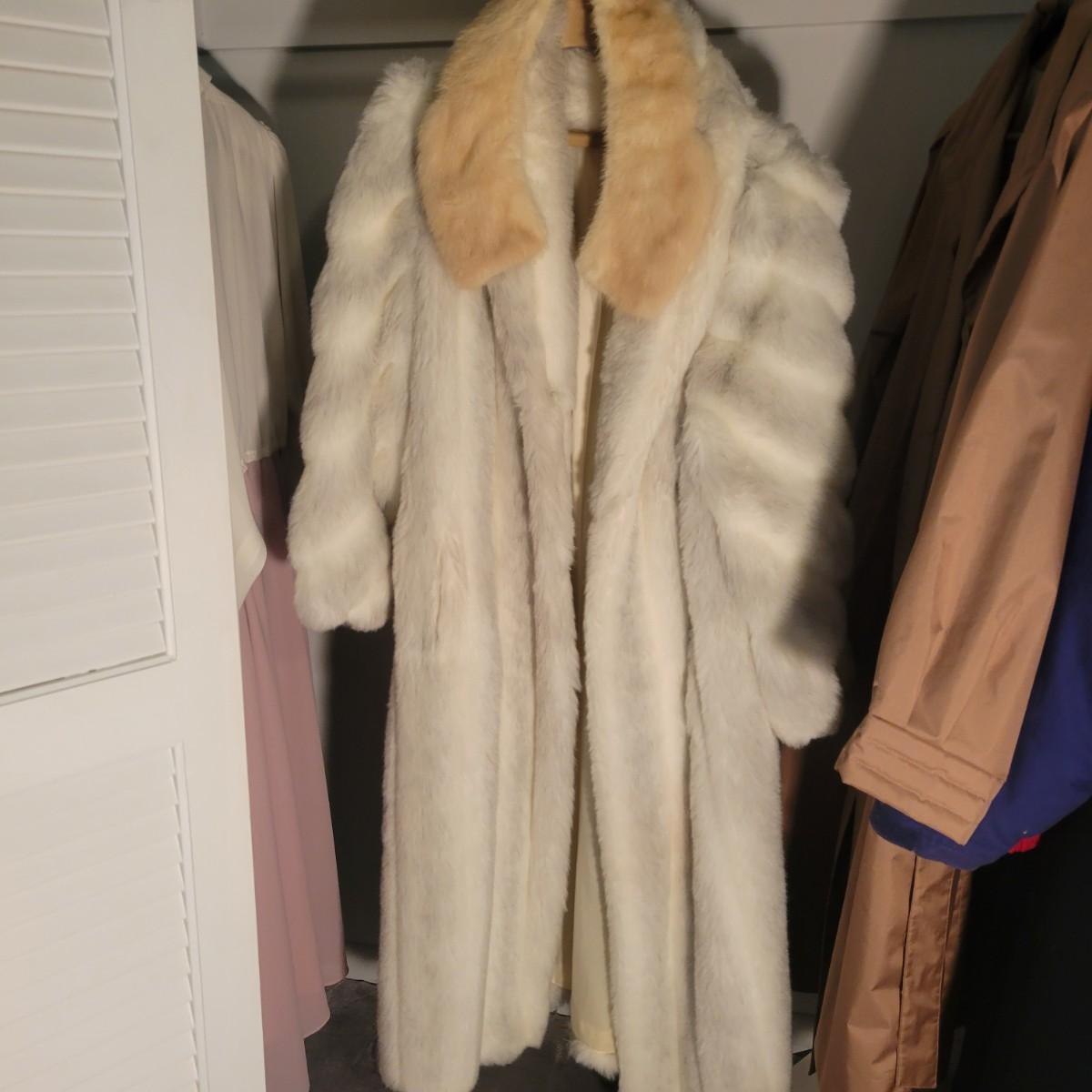 A pair of women's faux fur coats in excellent condition. Also included is three real fur neck wraps. Neither coat has tags or sizes. White coat measures 20" at the shoulder and is 50" in length. Brown jacket measures 19" at the shoulders and 28" in length. Shipping available