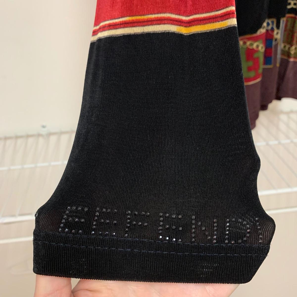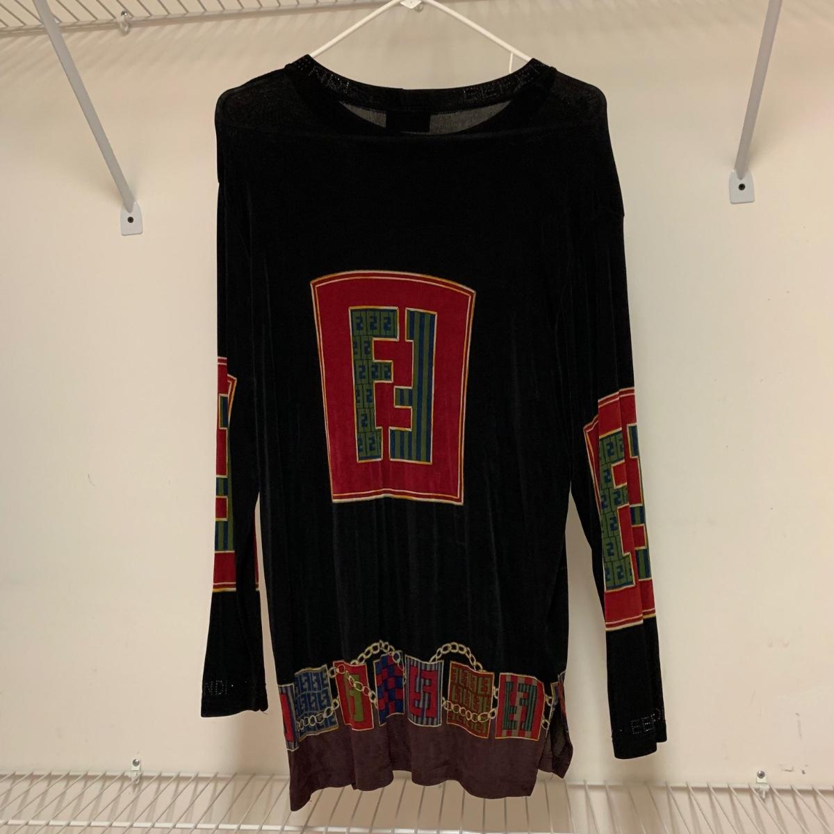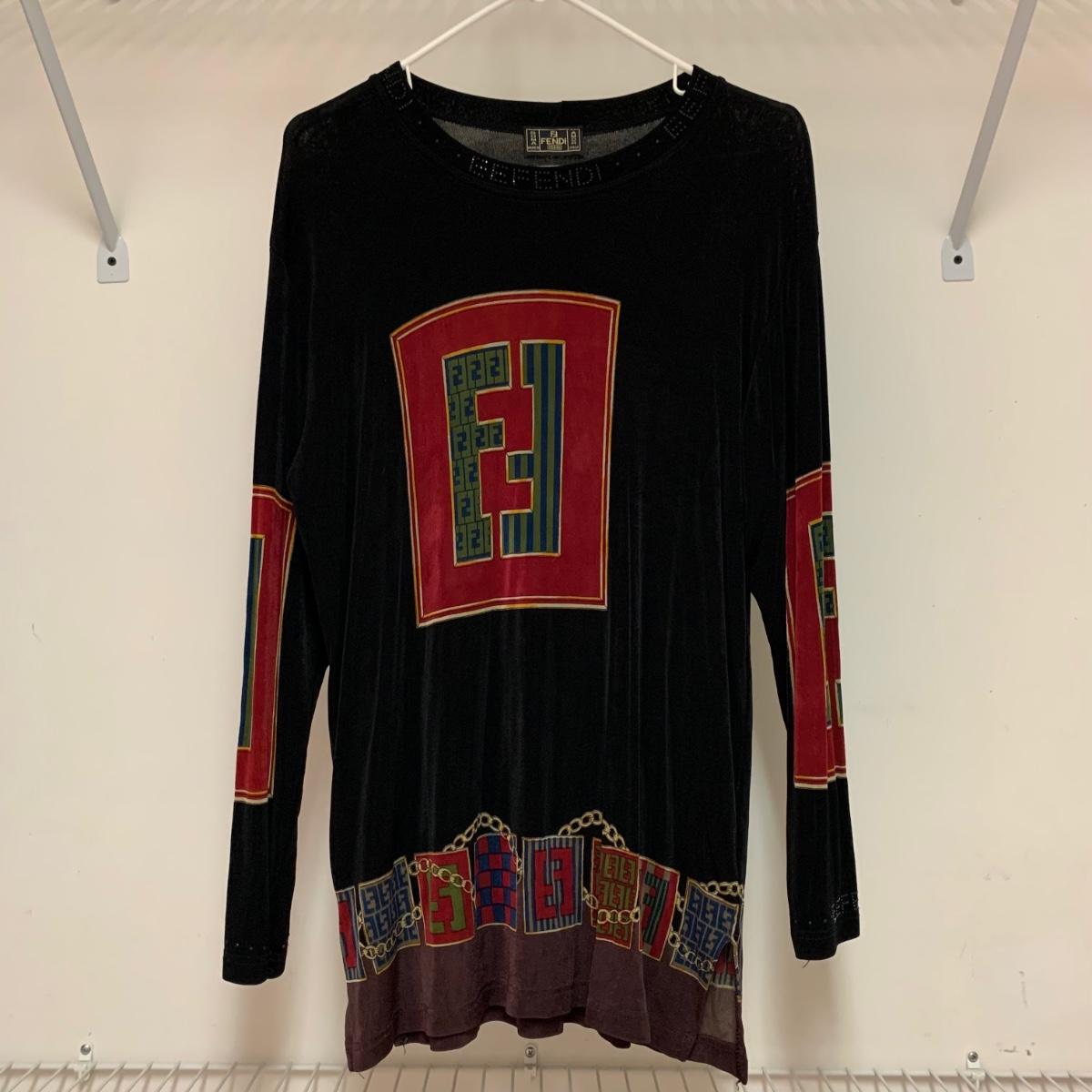 Women’s top from Italian fashion brand Fendi. There is no tag present to indicate size or fabric constitution. It seems to fit well as a medium to large, though it could probably work on a size Small to XL. The top is 31” long. Laid flat it is 20” across at the bust, but can stretch up to about 30” across. It is quite stretchy and lightweight and feels like a synthetic fabric. There is a deodorant mark that should wash off, see photos.
