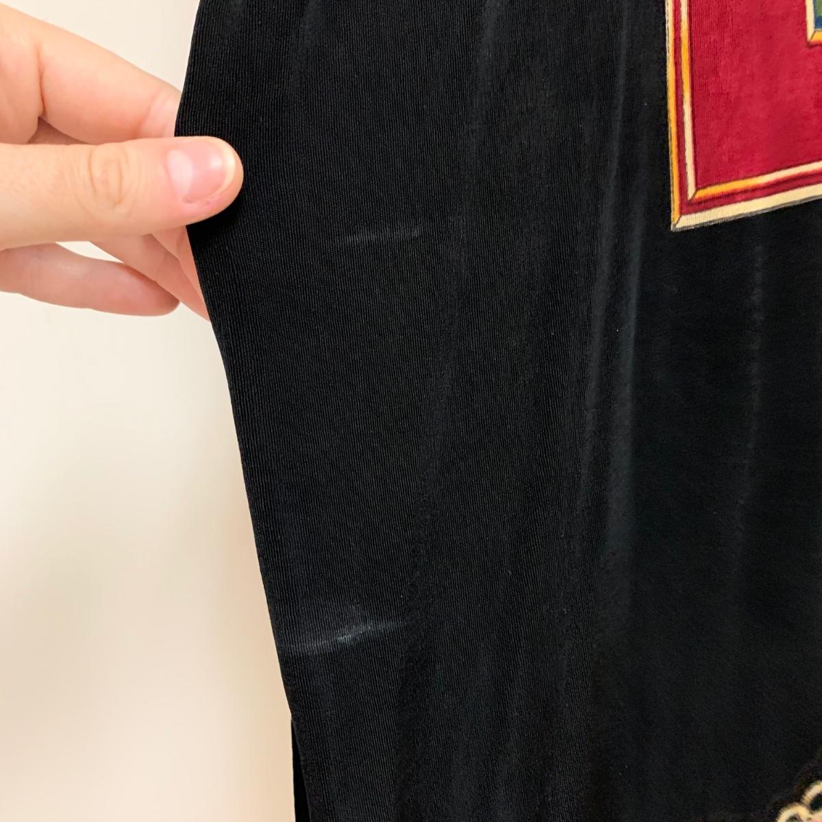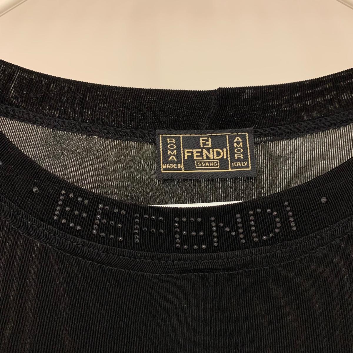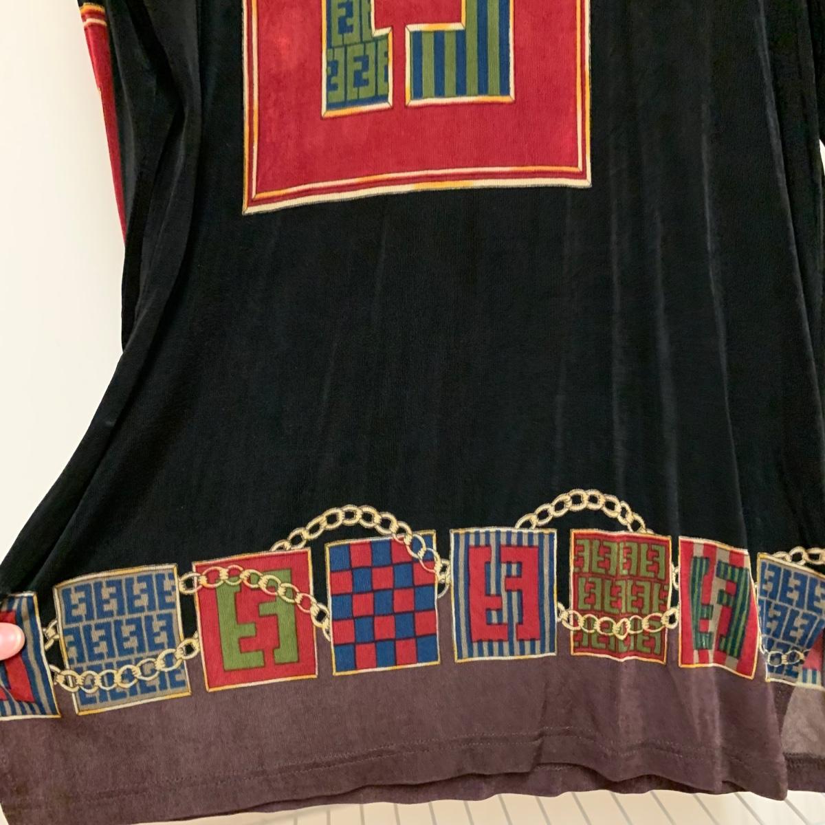 Women’s top from Italian fashion brand Fendi. There is no tag present to indicate size or fabric constitution. It seems to fit well as a medium to large, though it could probably work on a size Small to XL. The top is 31” long. Laid flat it is 20” across at the bust, but can stretch up to about 30” across. It is quite stretchy and lightweight and feels like a synthetic fabric. There is a deodorant mark that should wash off, see photos.