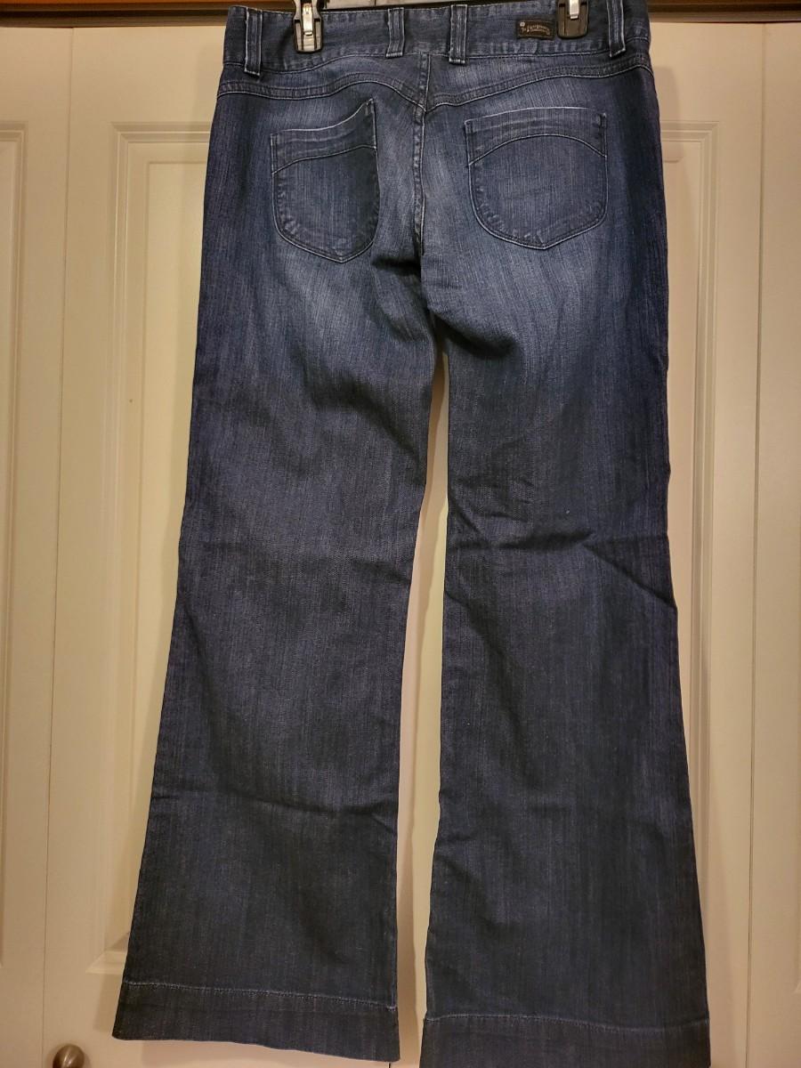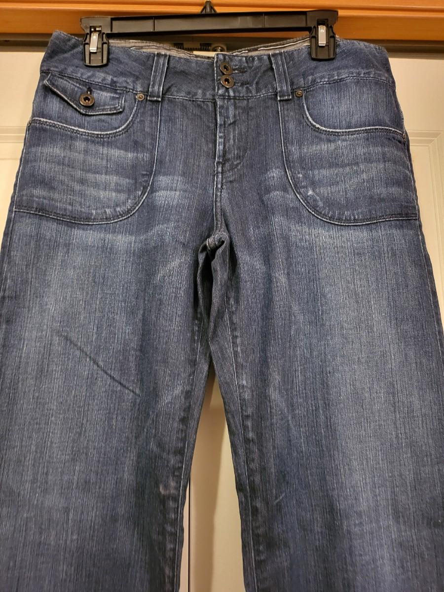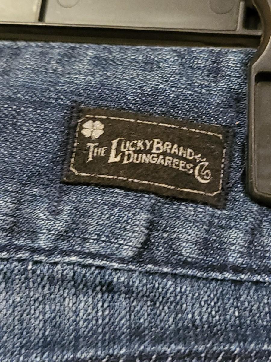 The Lucky Brand Dungarees Co, Women's size 12. Waist 31". Inseam 32" blue jeans. Bottom flair is 11.25" wide. Excellent condition.