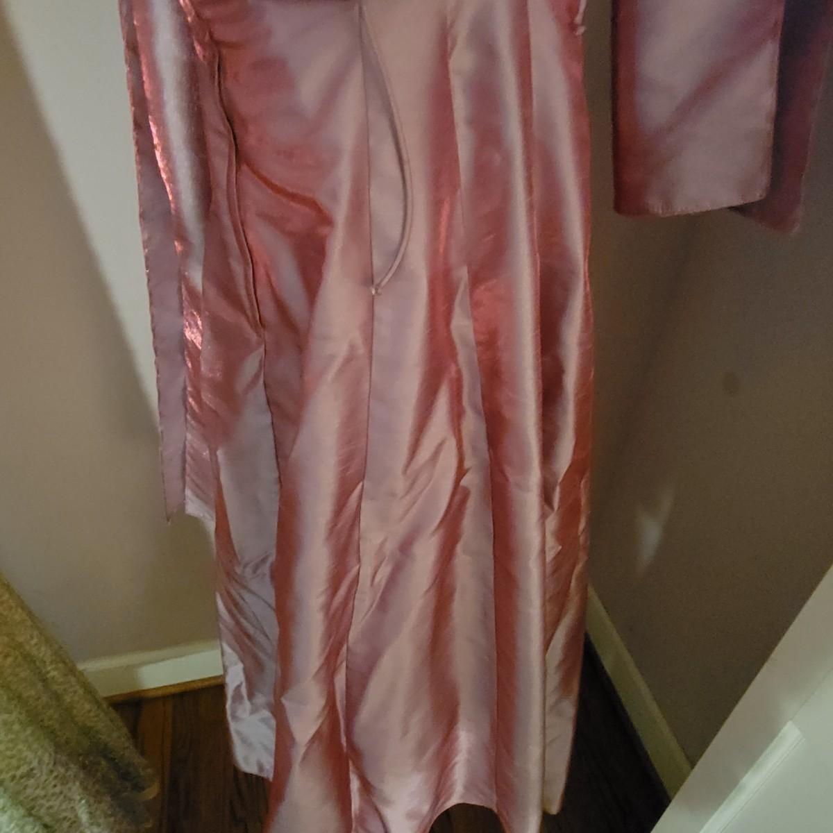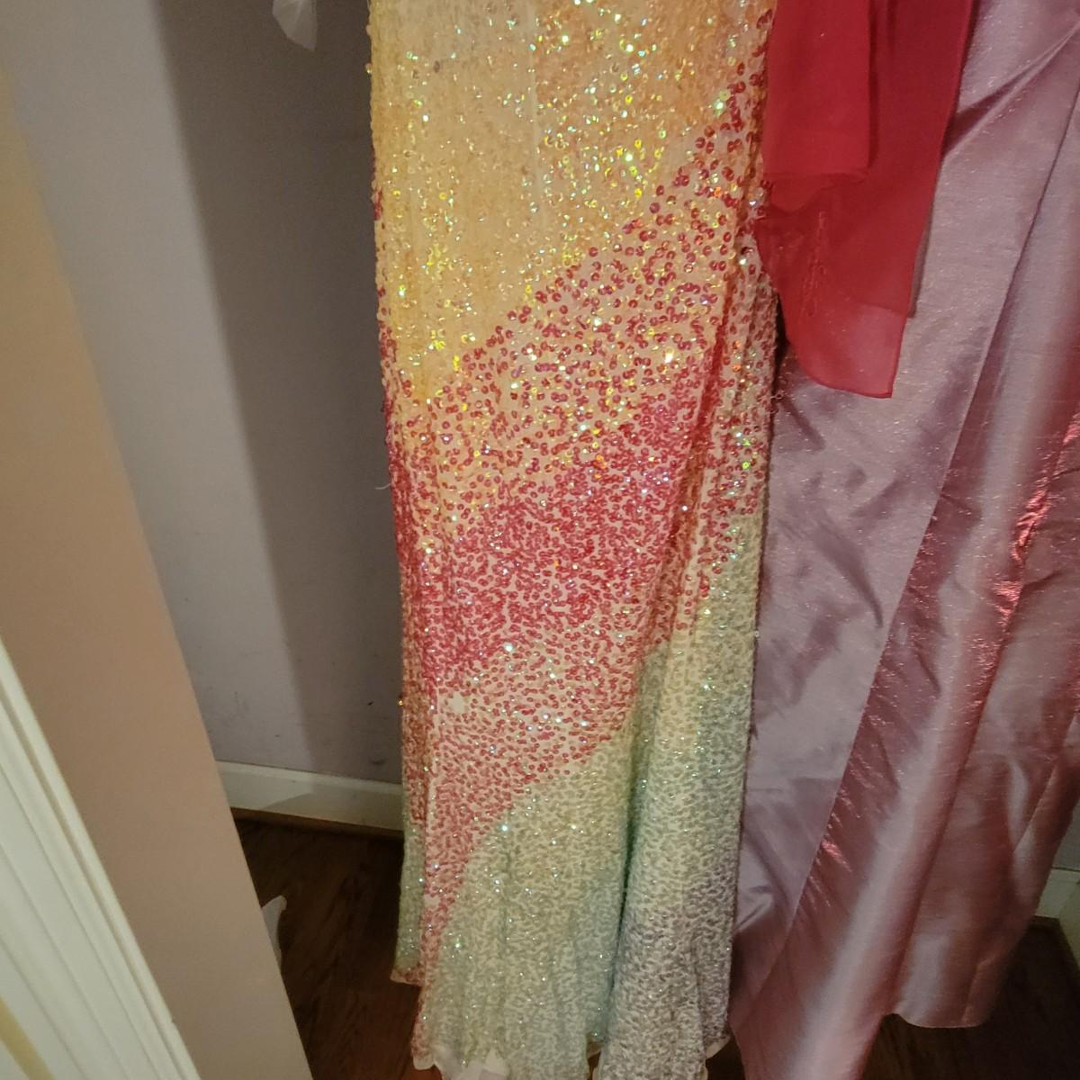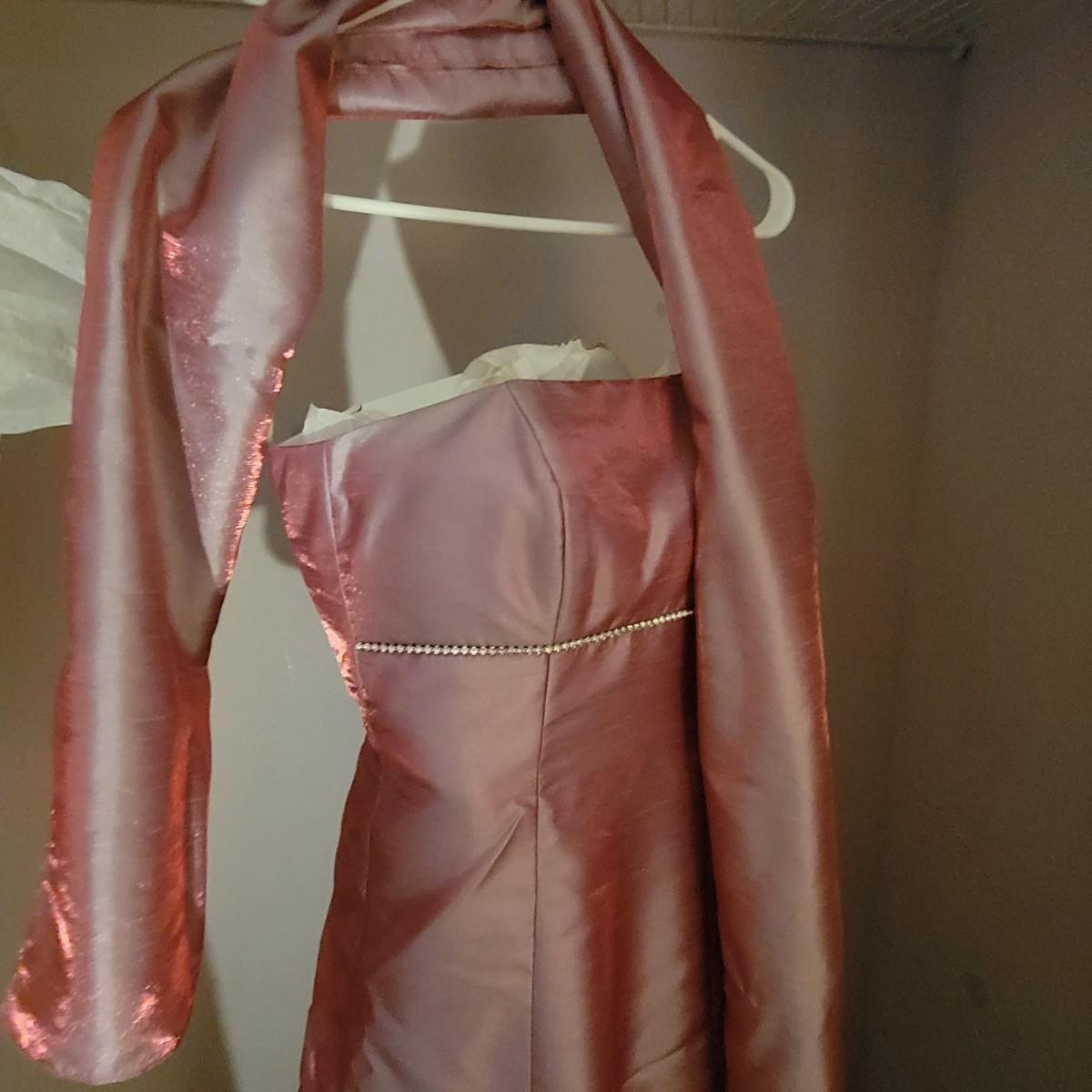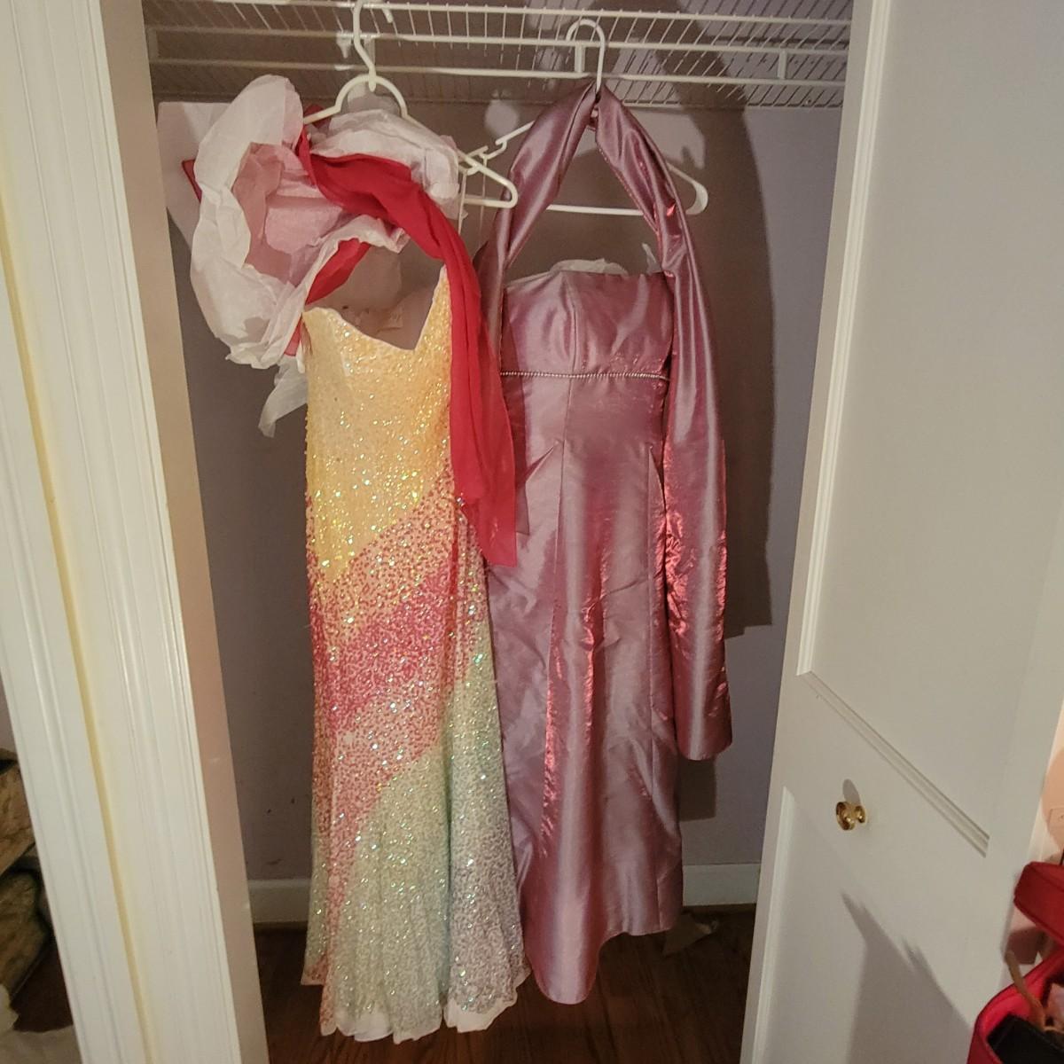 Two woman's full length formal dresses sized 3/4. One is multi colored with sequins and a thin fabric wrap with detail on the ends. Made by Tiffany Designs. The other is dusty pink with a metallic sheen and a matching wrap. Made by Jump Apparel Co.