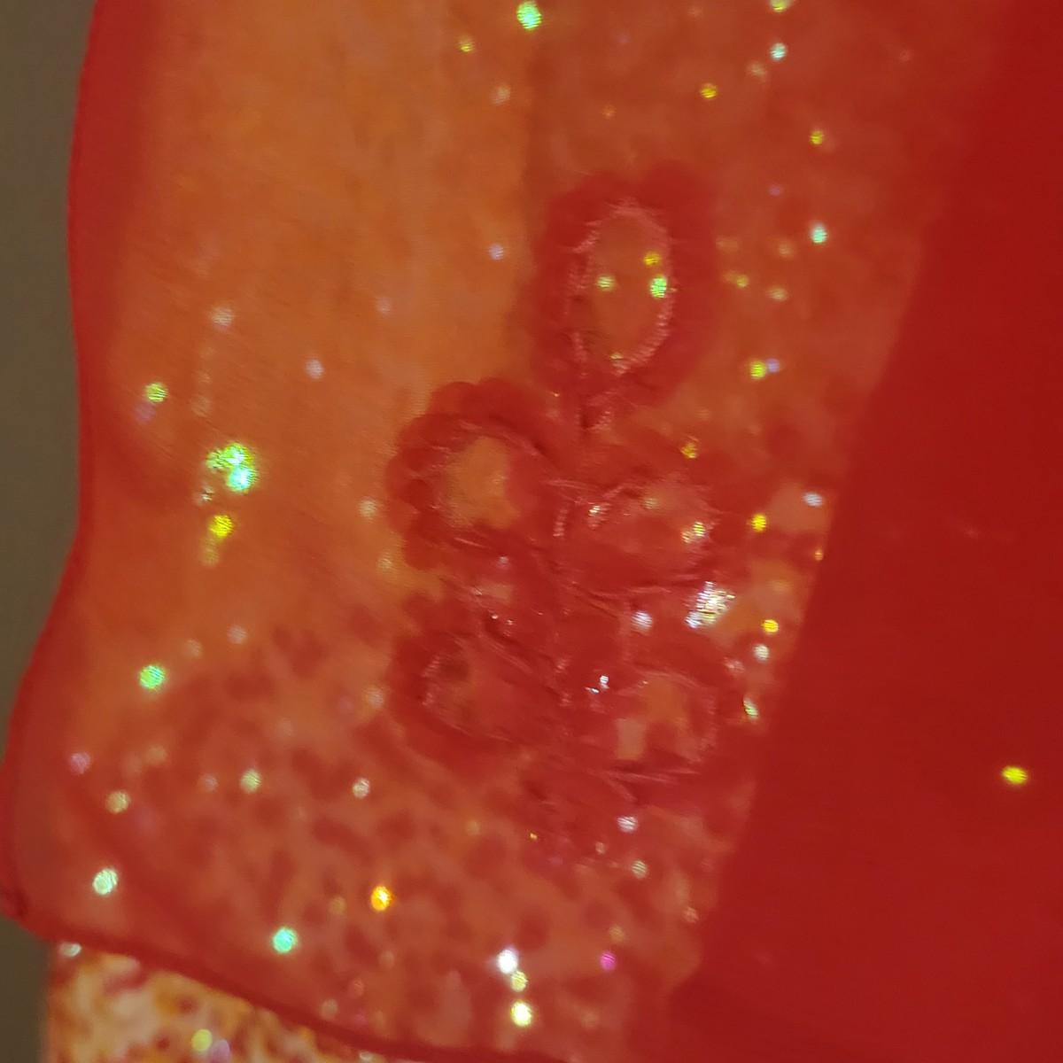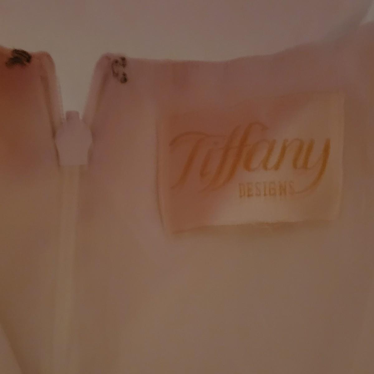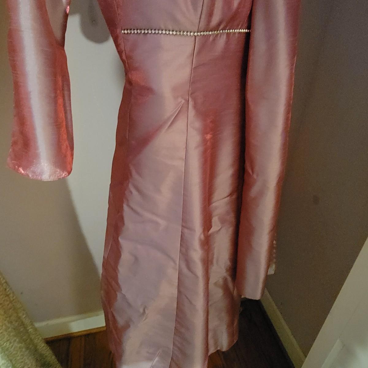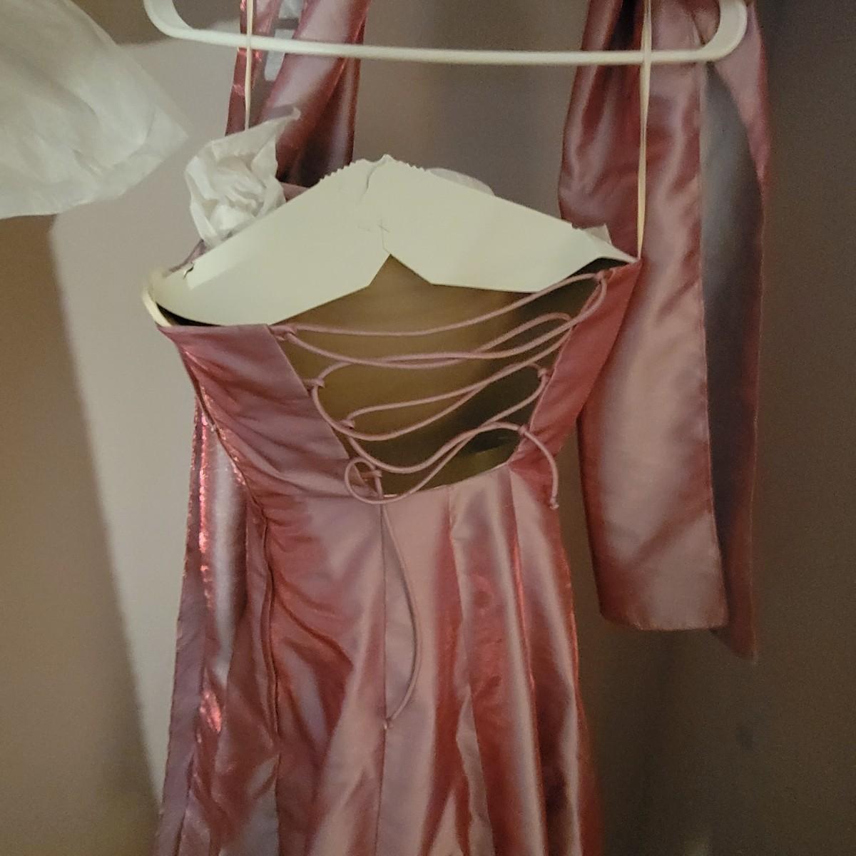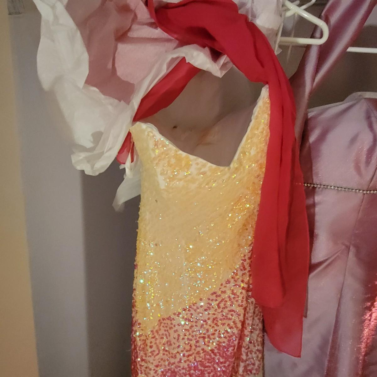Two woman's full length formal dresses sized 3/4. One is multi colored with sequins and a thin fabric wrap with detail on the ends. Made by Tiffany Designs. The other is dusty pink with a metallic sheen and a matching wrap. Made by Jump Apparel Co.