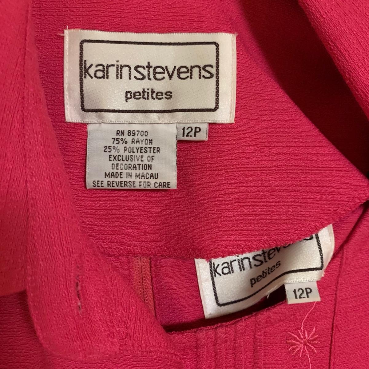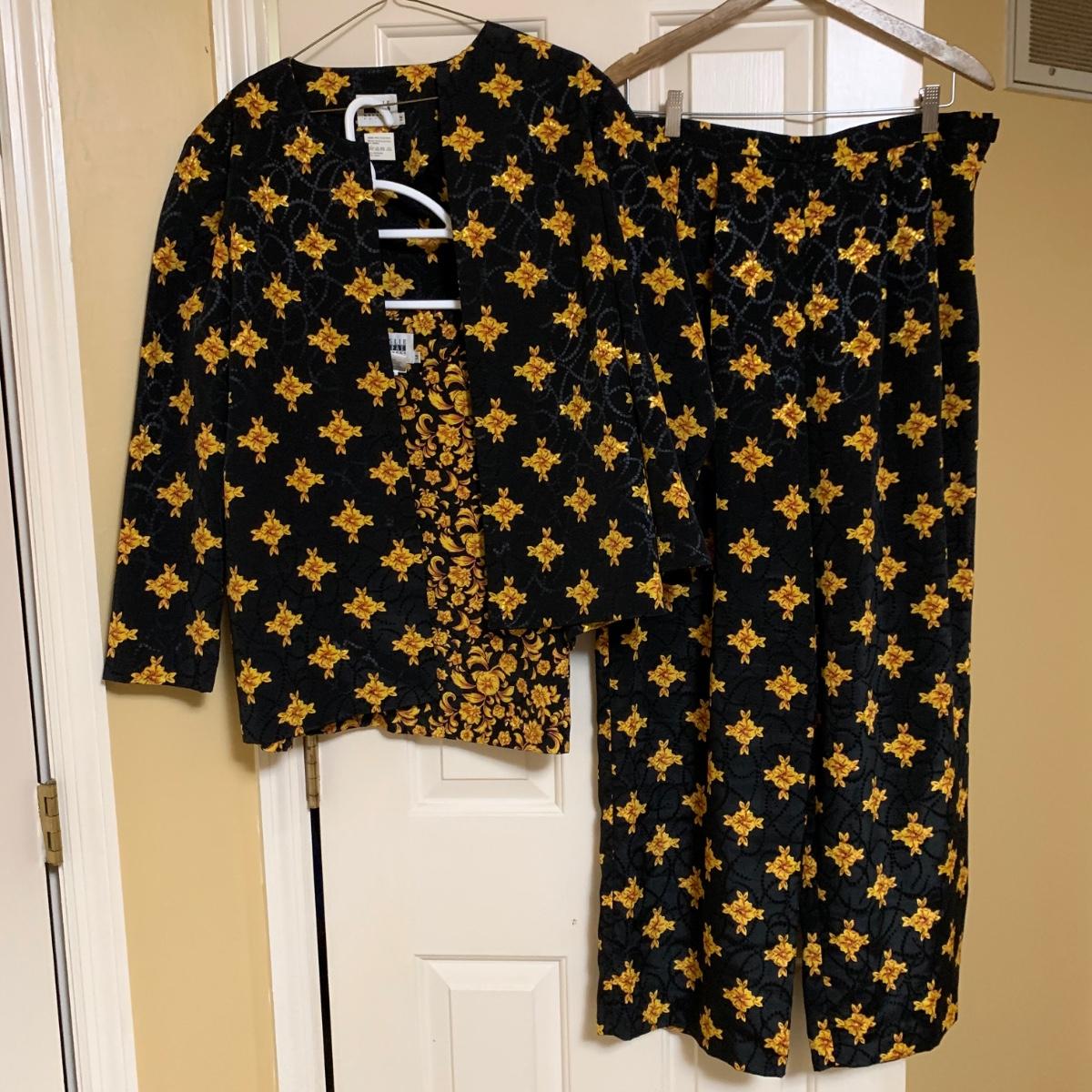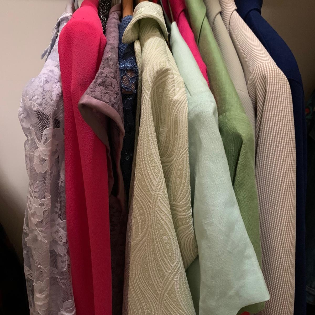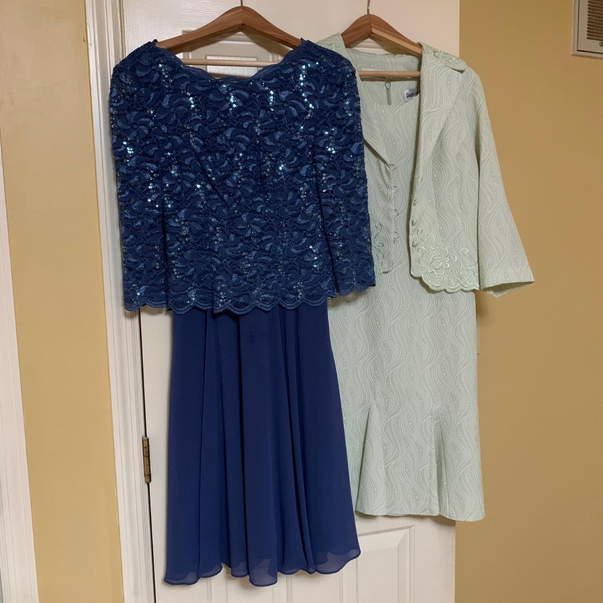 13 outfits plus one sparkly jacket. Sizes range from 10-14, mostly petite. There are two elegant dresses, six jacket with dress or skirt sets, and three jacket with pants sets. Brands include Talbots, Patra, Danny & Nicole, Karin Stevens, Evan-Picone, & more. The long purple dress needs some repairs. Any other blemishes are noted in the pictures. Wood hangers are not included.