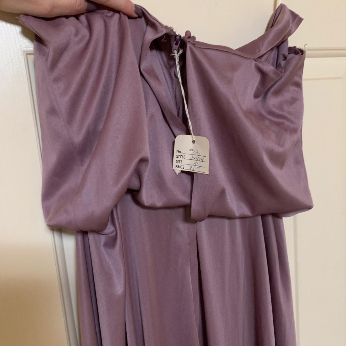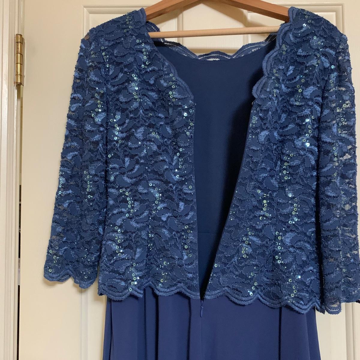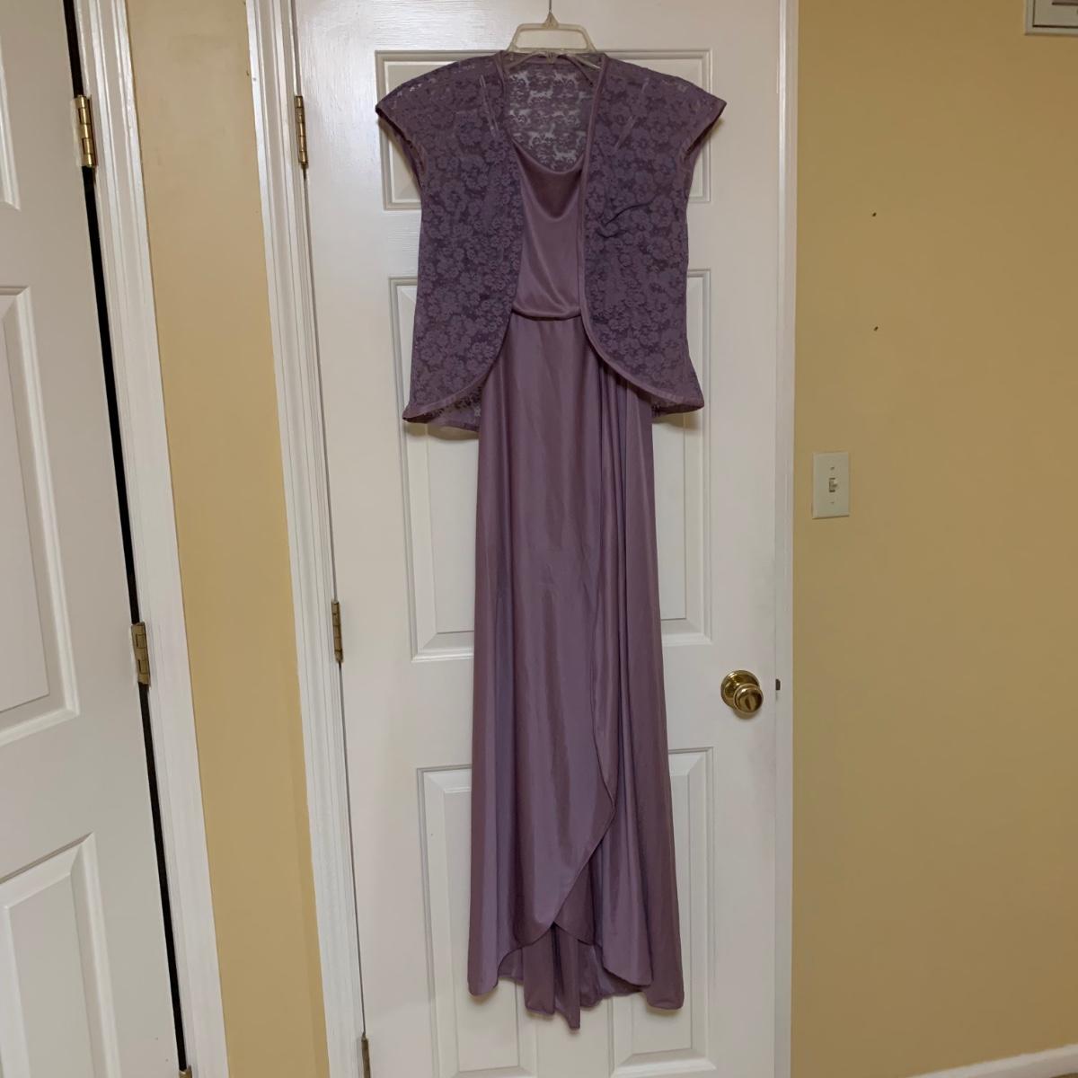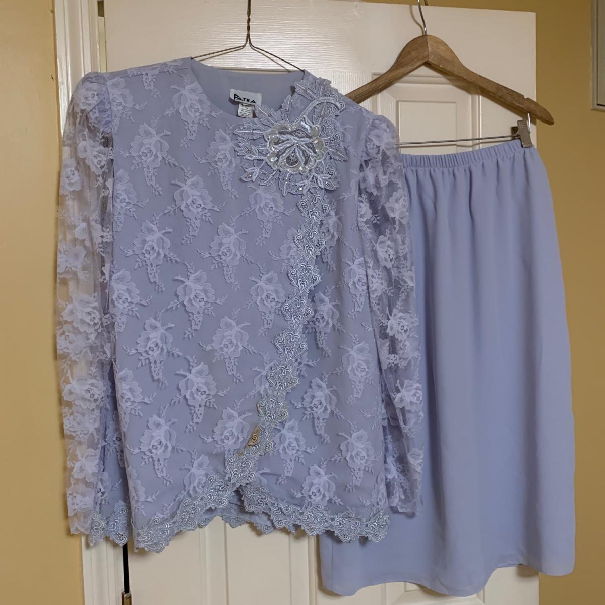 13 outfits plus one sparkly jacket. Sizes range from 10-14, mostly petite. There are two elegant dresses, six jacket with dress or skirt sets, and three jacket with pants sets. Brands include Talbots, Patra, Danny & Nicole, Karin Stevens, Evan-Picone, & more. The long purple dress needs some repairs. Any other blemishes are noted in the pictures. Wood hangers are not included.