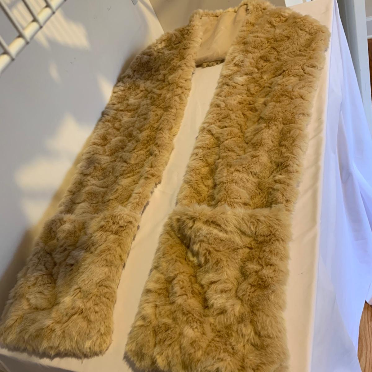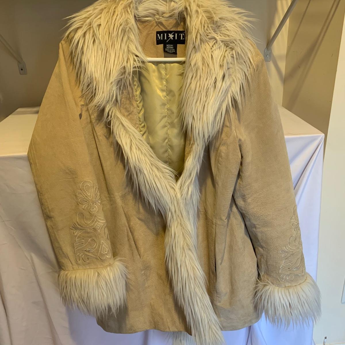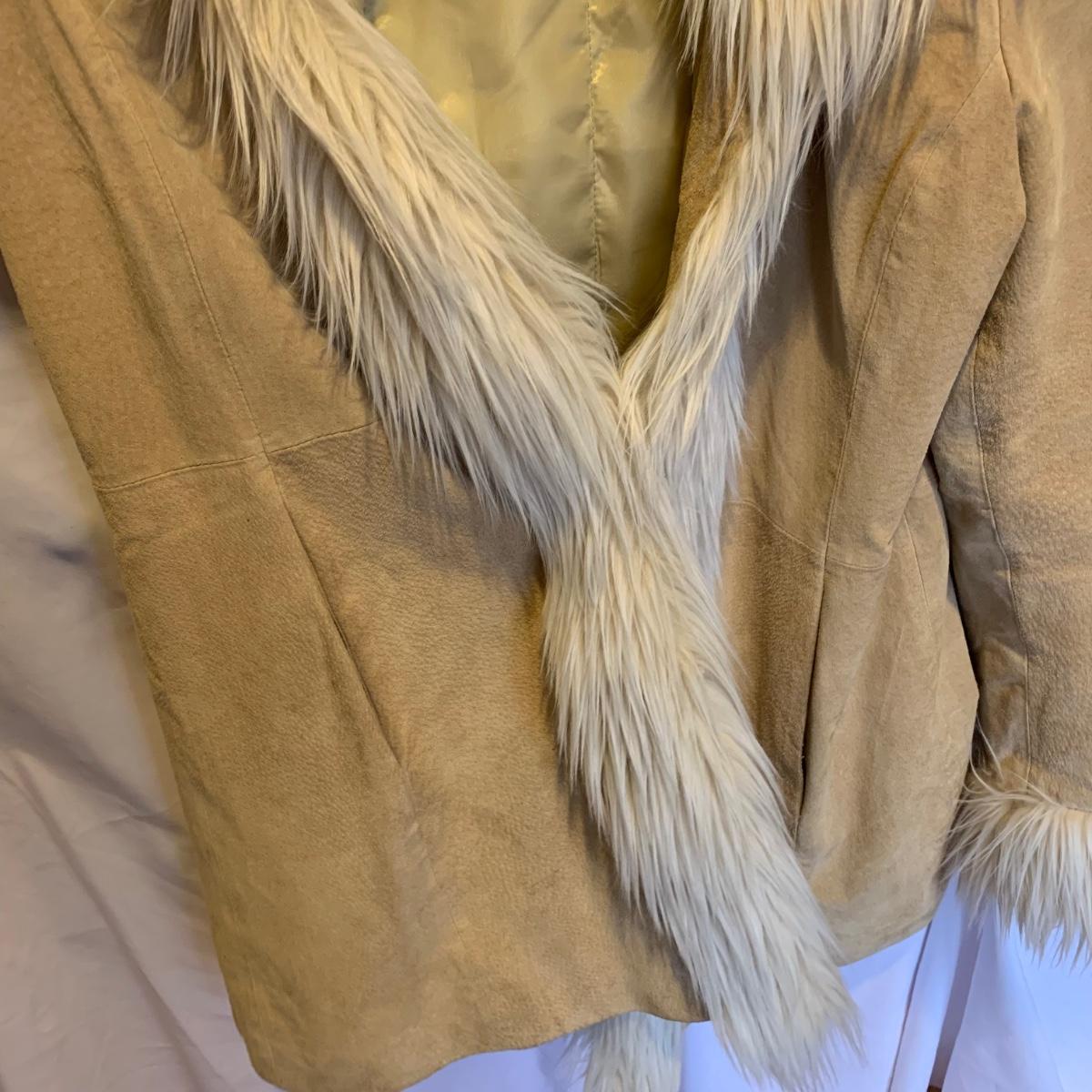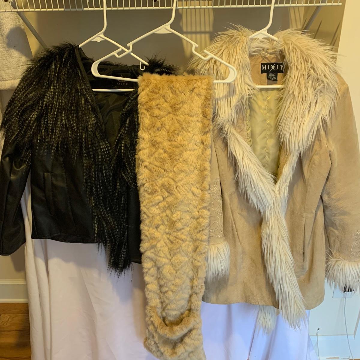 This lot includes two coats. The tan coat is lined with leather and fur (unsure whether it is real or not). The black coat does not appear to be real leather or fur and has a small stain on the sleeve (see photos). The lot also includes a faux fur scarf. The tan coat is the brand Mixit and is a size Medium. The black coat does not have a size tag but appears to be a size Medium and by the brand Qiye. Shipping available.