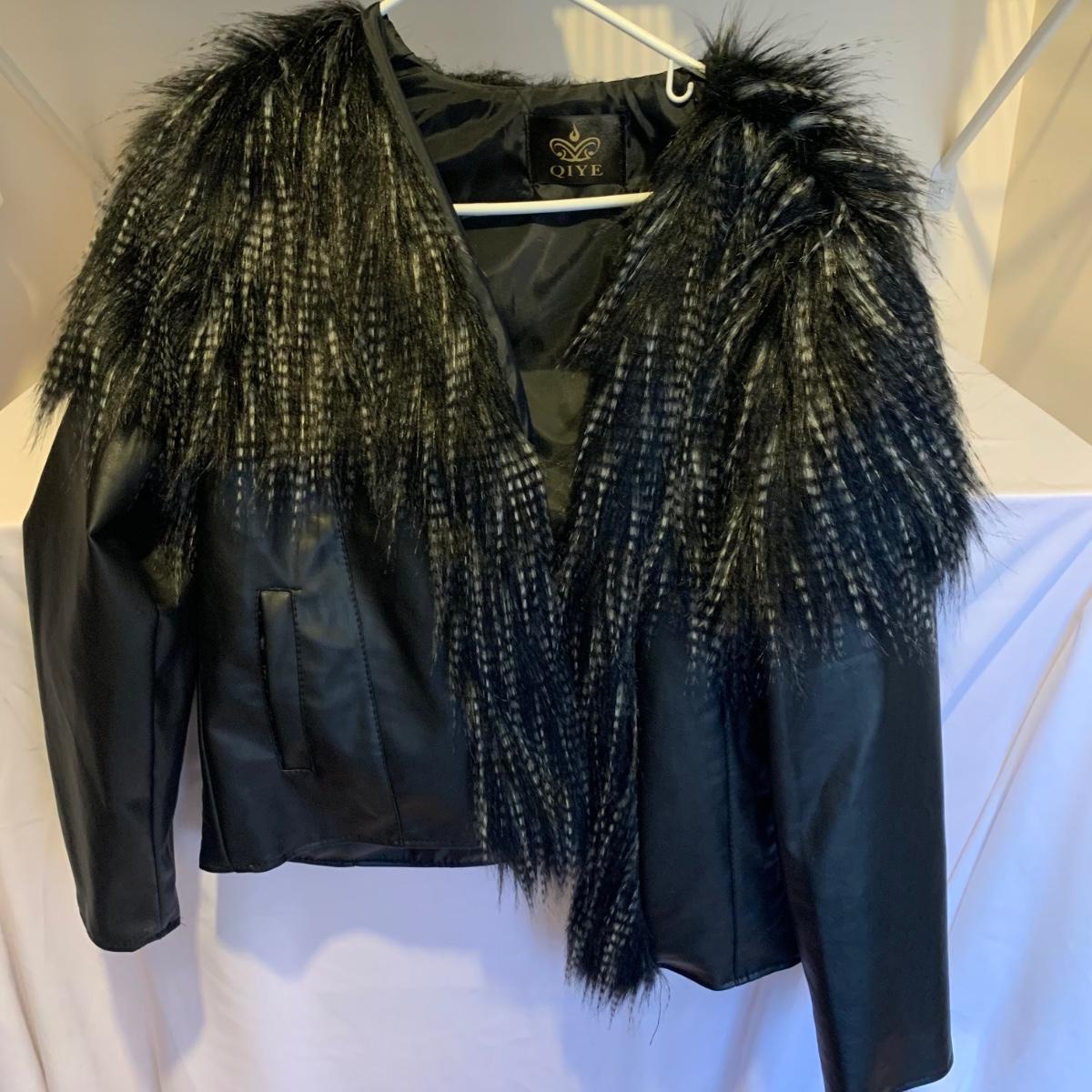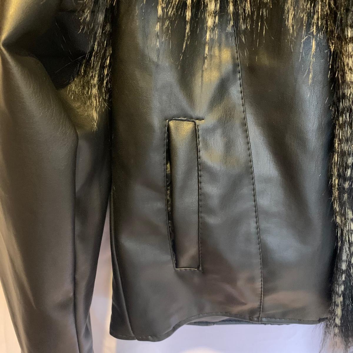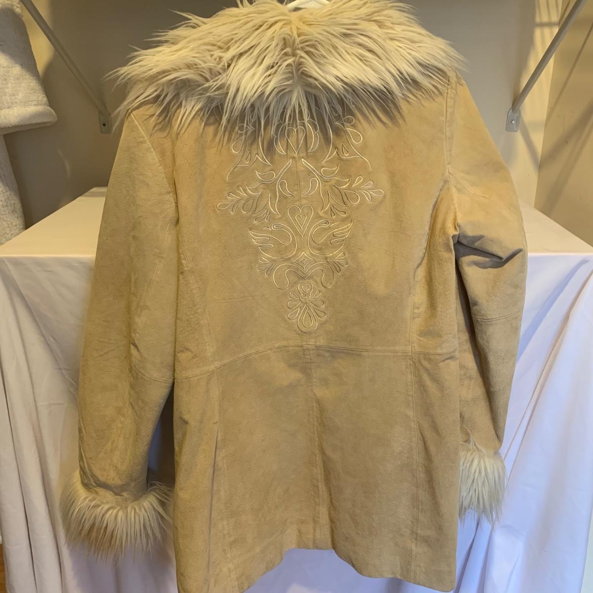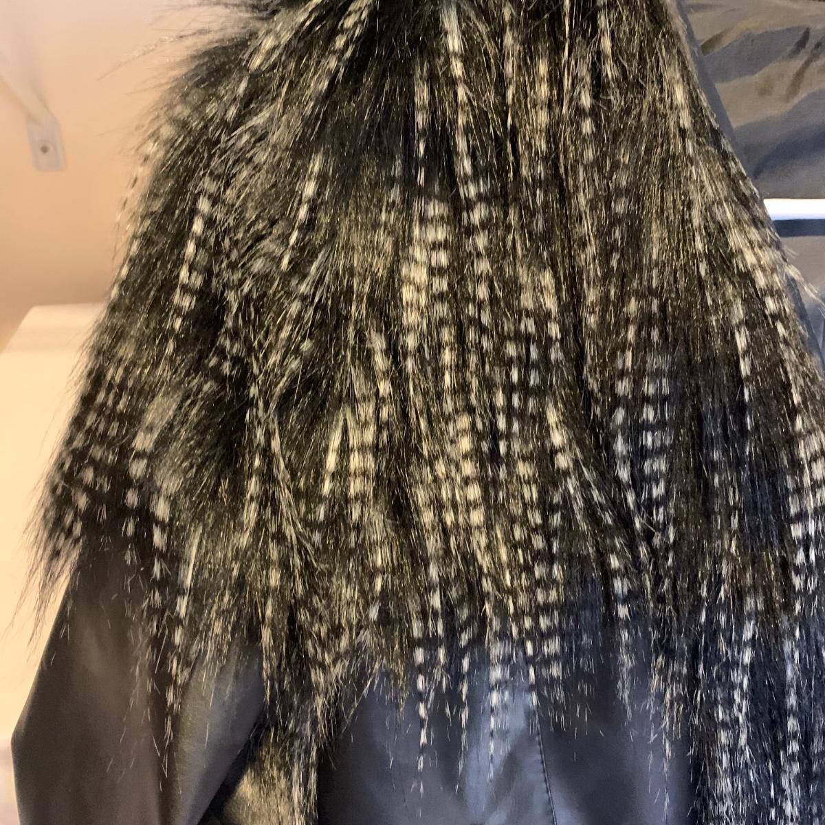 This lot includes two coats. The tan coat is lined with leather and fur (unsure whether it is real or not). The black coat does not appear to be real leather or fur and has a small stain on the sleeve (see photos). The lot also includes a faux fur scarf. The tan coat is the brand Mixit and is a size Medium. The black coat does not have a size tag but appears to be a size Medium and by the brand Qiye. Shipping available.