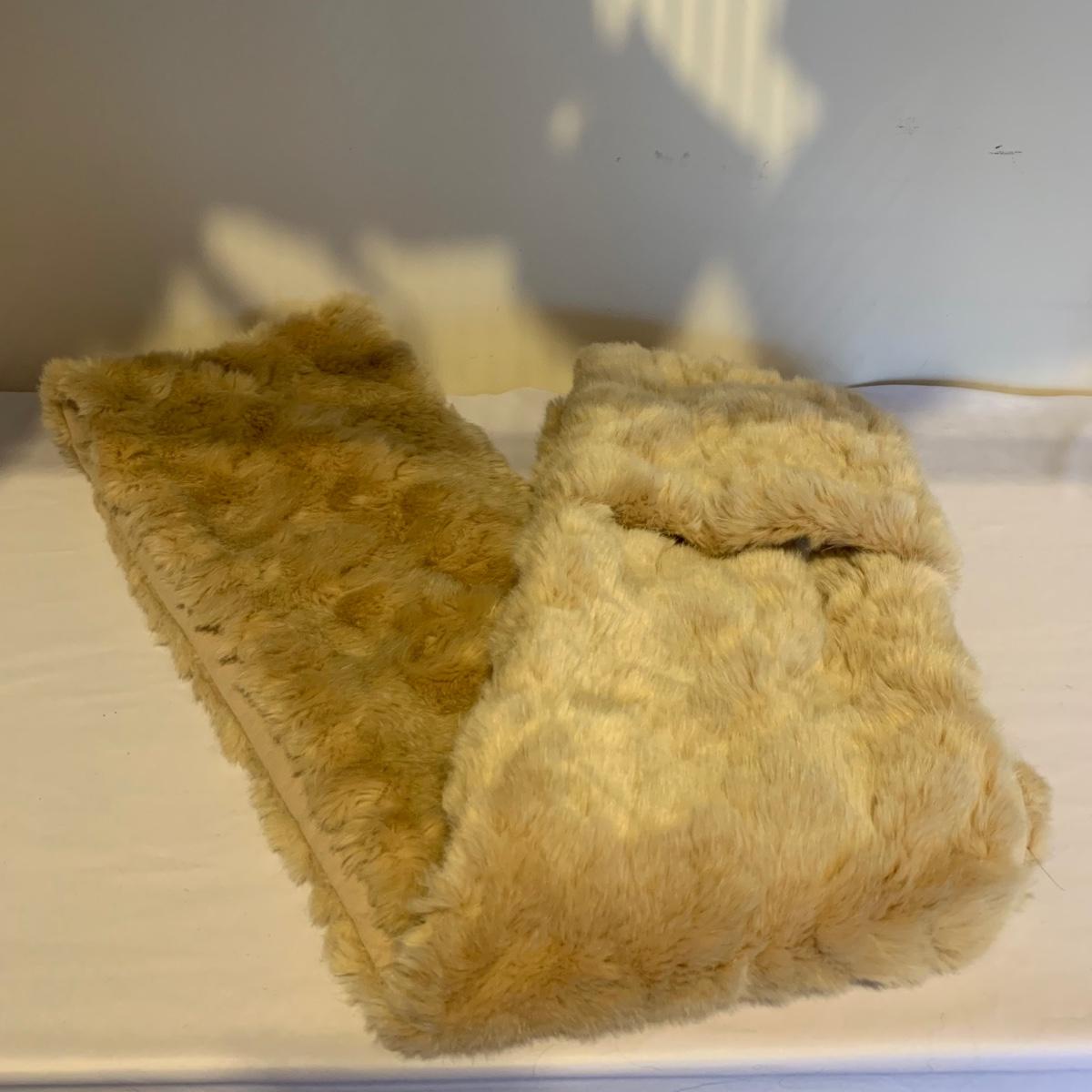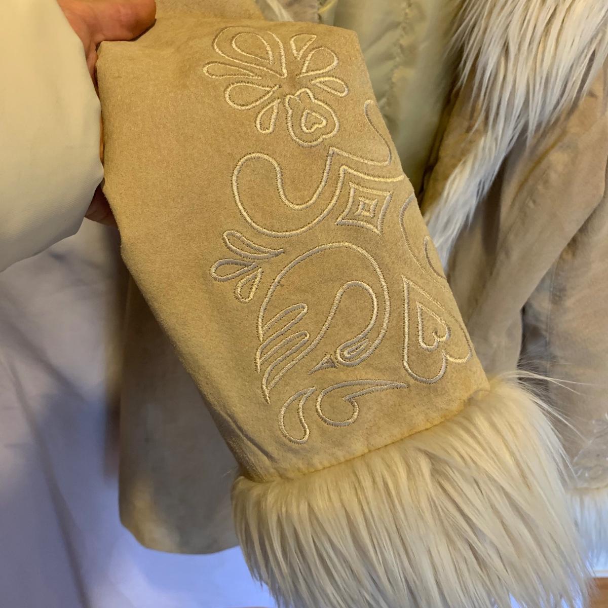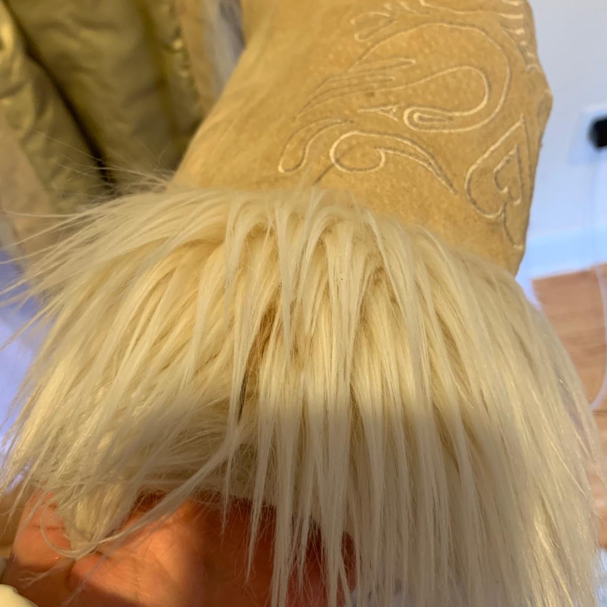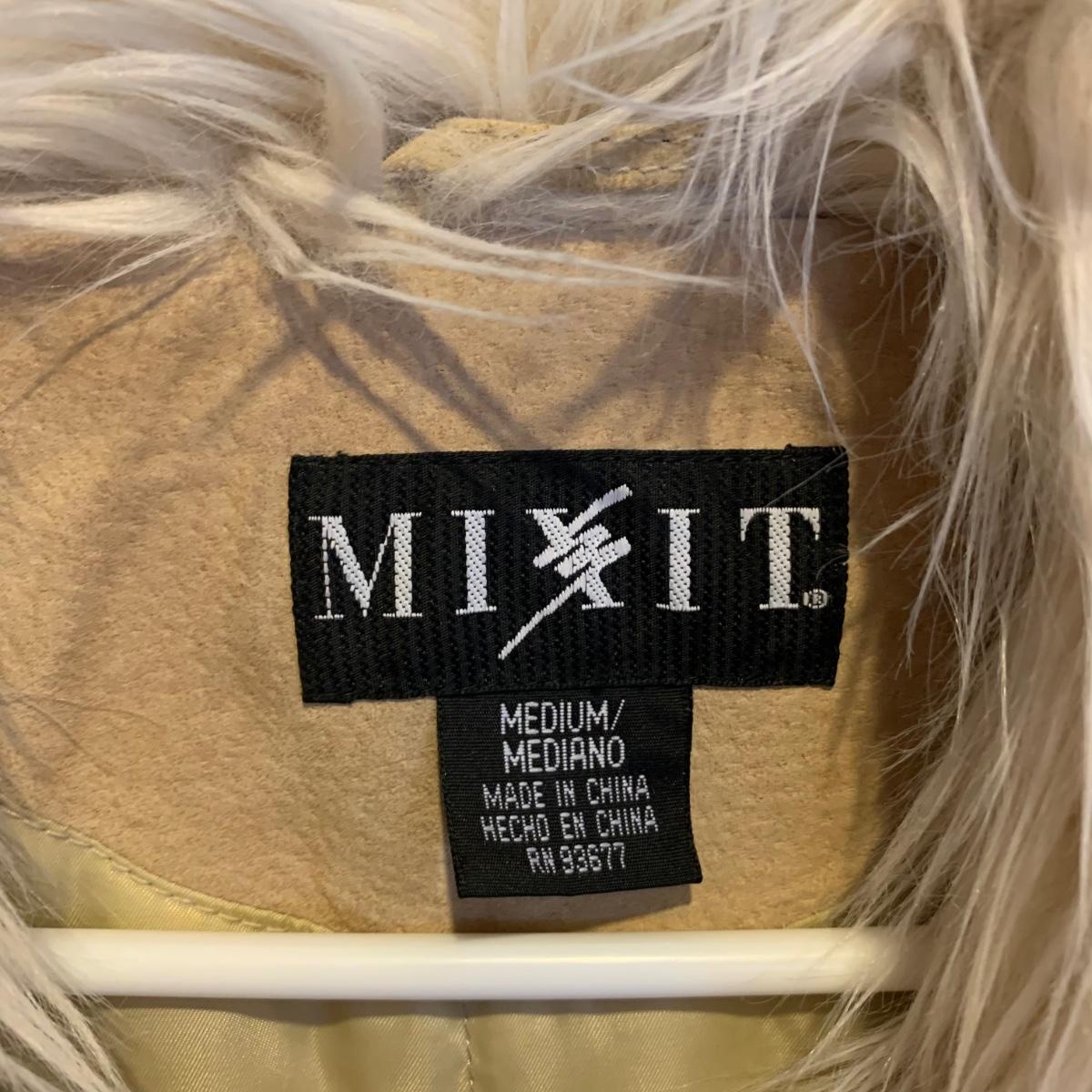 This lot includes two coats. The tan coat is lined with leather and fur (unsure whether it is real or not). The black coat does not appear to be real leather or fur and has a small stain on the sleeve (see photos). The lot also includes a faux fur scarf. The tan coat is the brand Mixit and is a size Medium. The black coat does not have a size tag but appears to be a size Medium and by the brand Qiye. Shipping available.