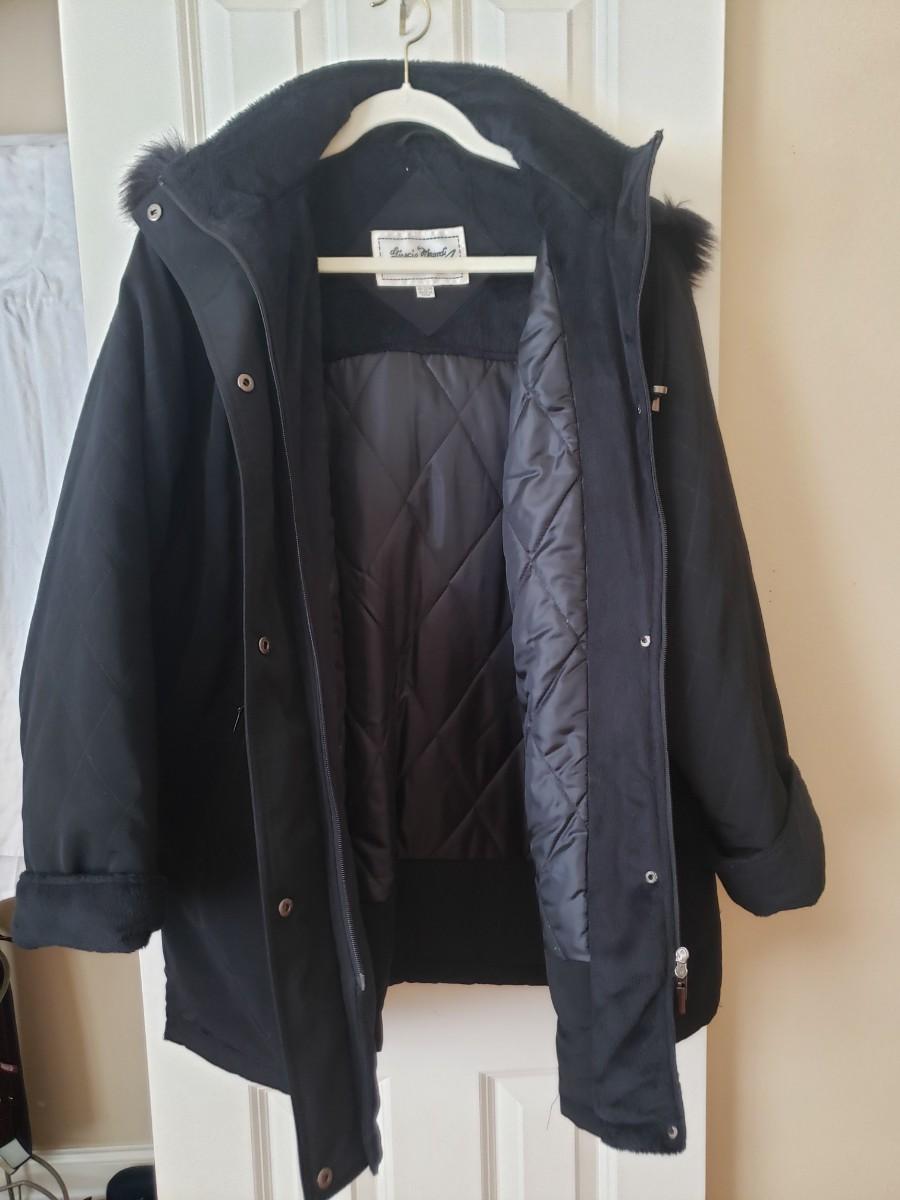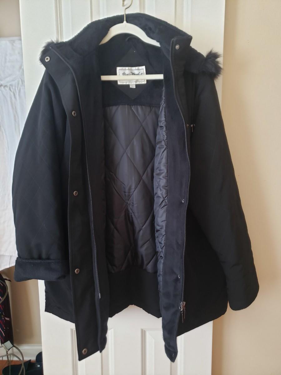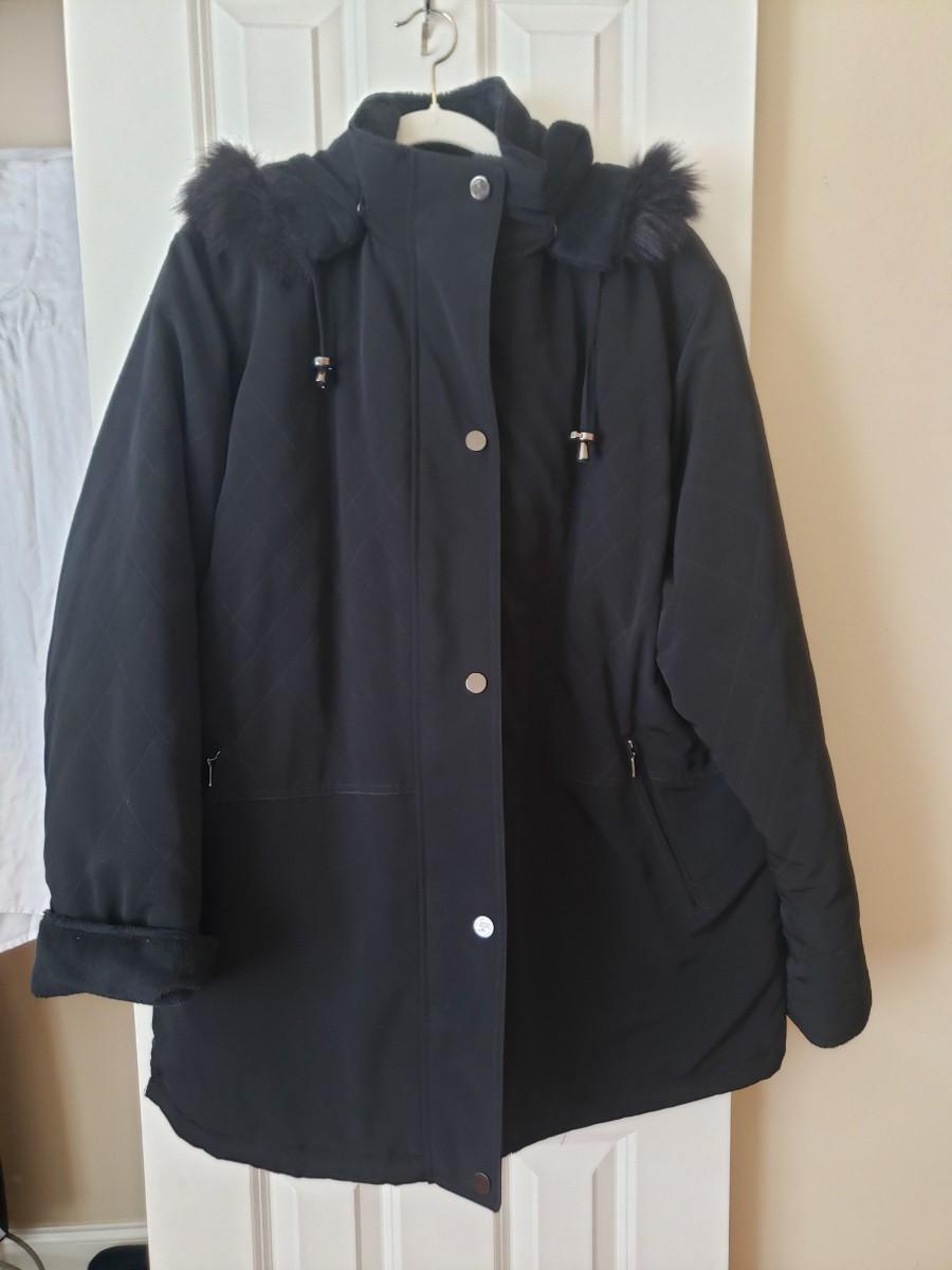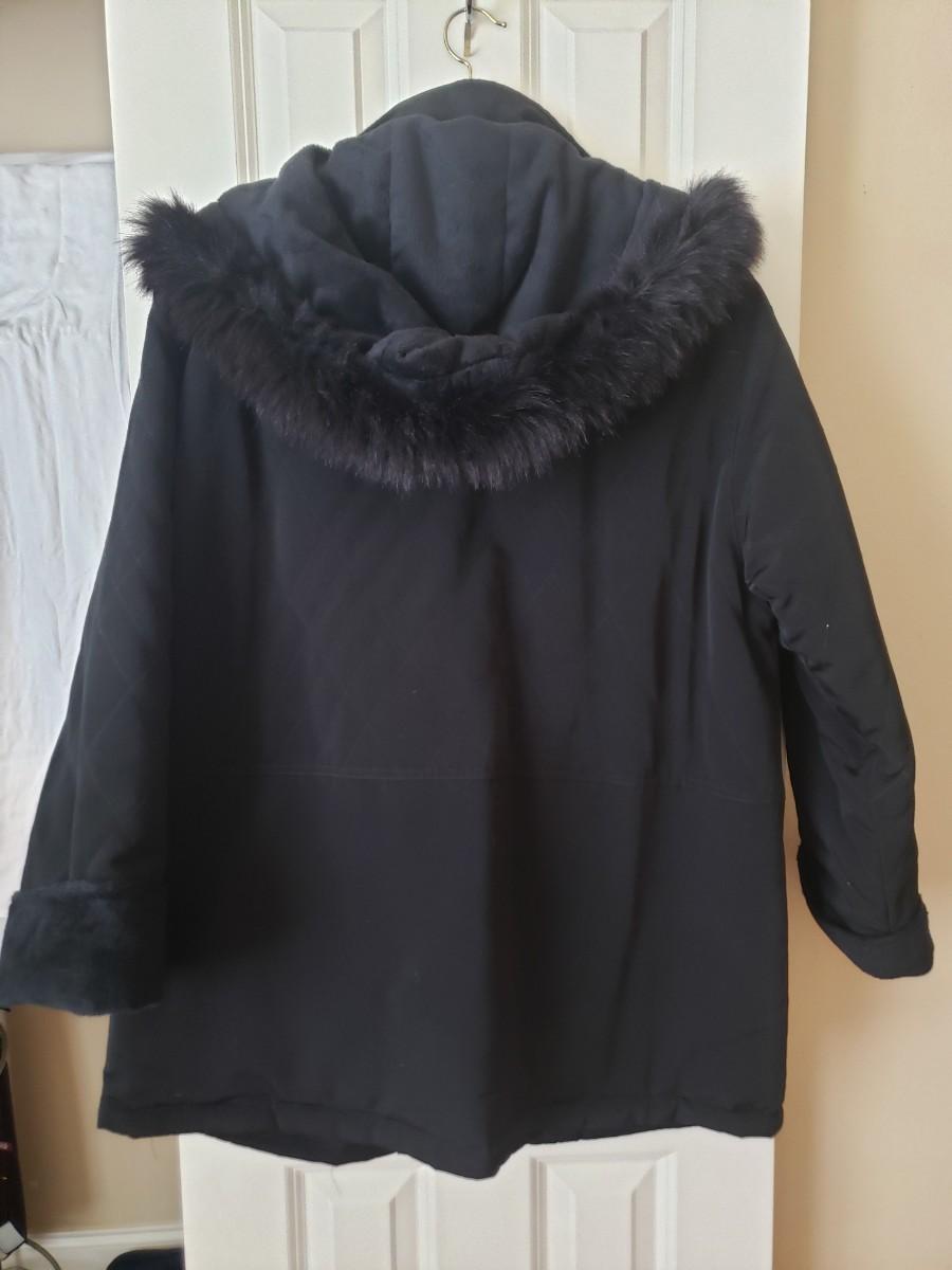 Women's black Georgia Morandi coat. Size 16/20W. Faux fur detachable hood. Zip & snap front closure.