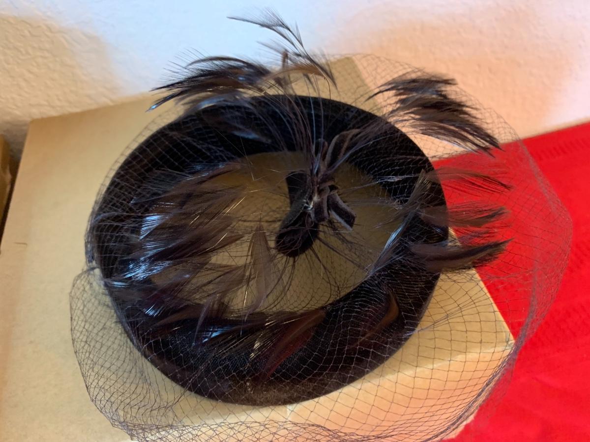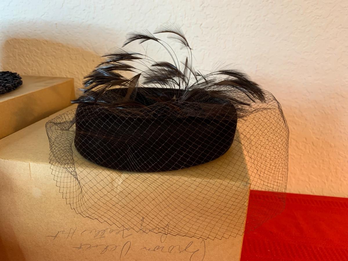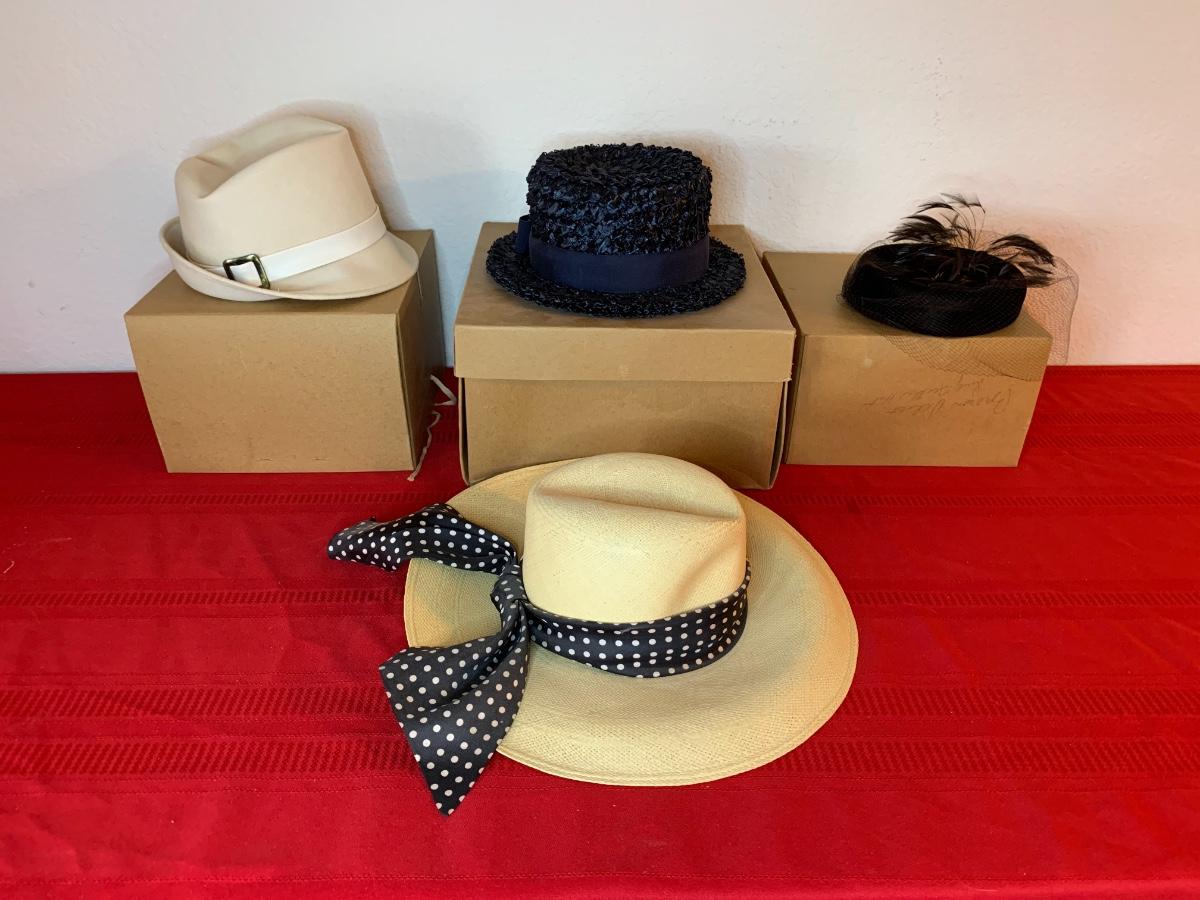 4 women’s hats including one fedora, a wide brimmed hat, a straw hat and one cocktail hat. All three hats pictured on top of boxes in excellent condition, wide brimmed hat in good condition.