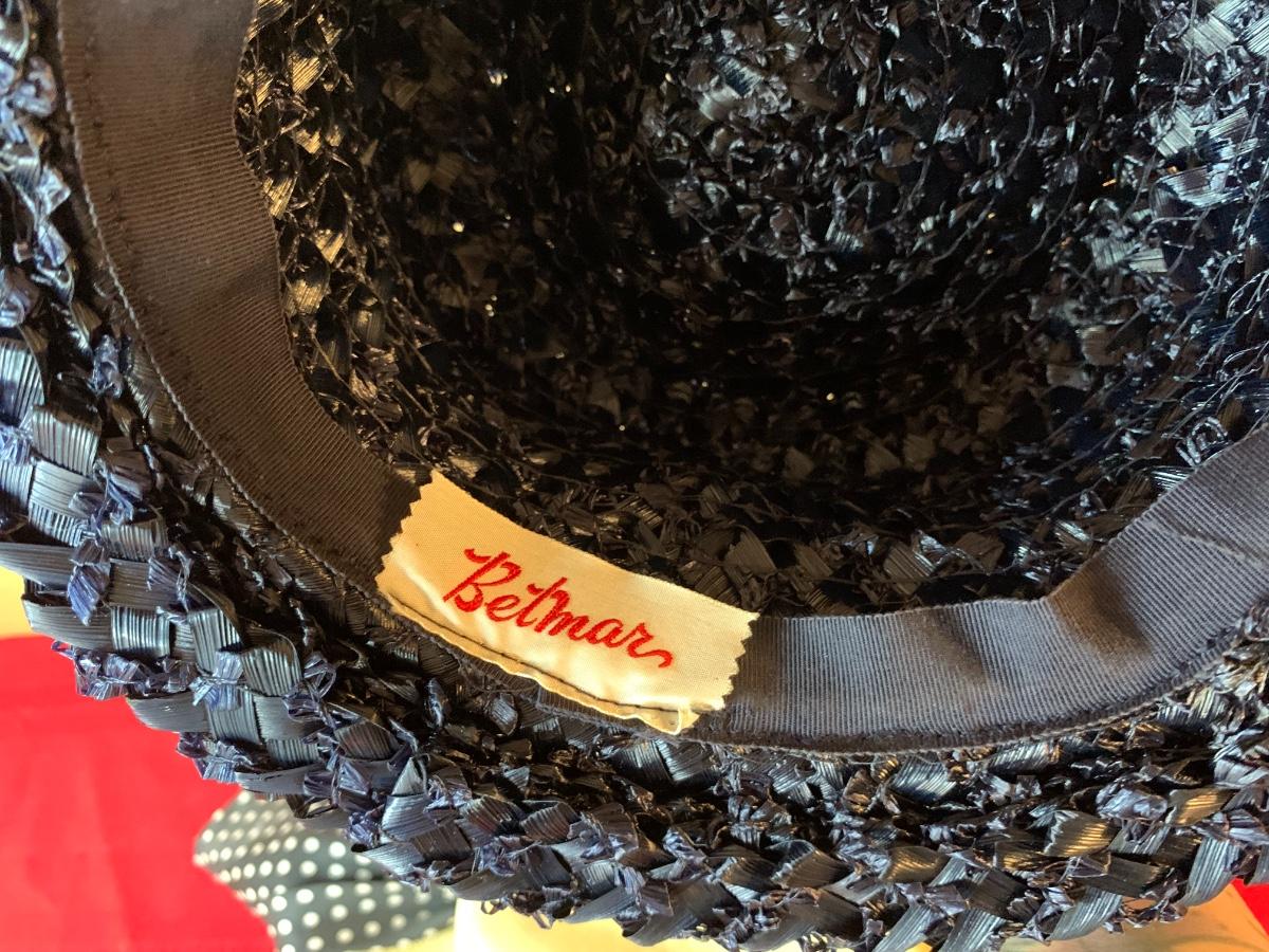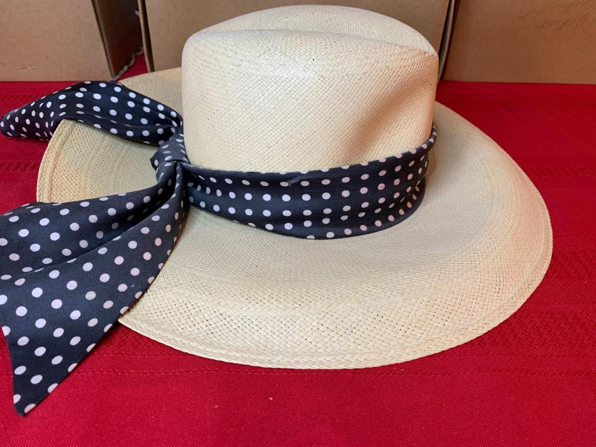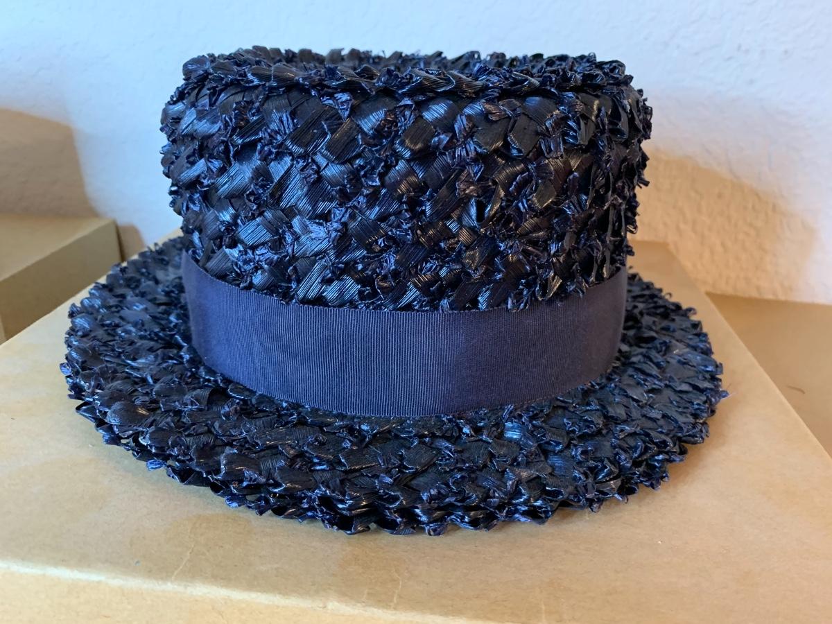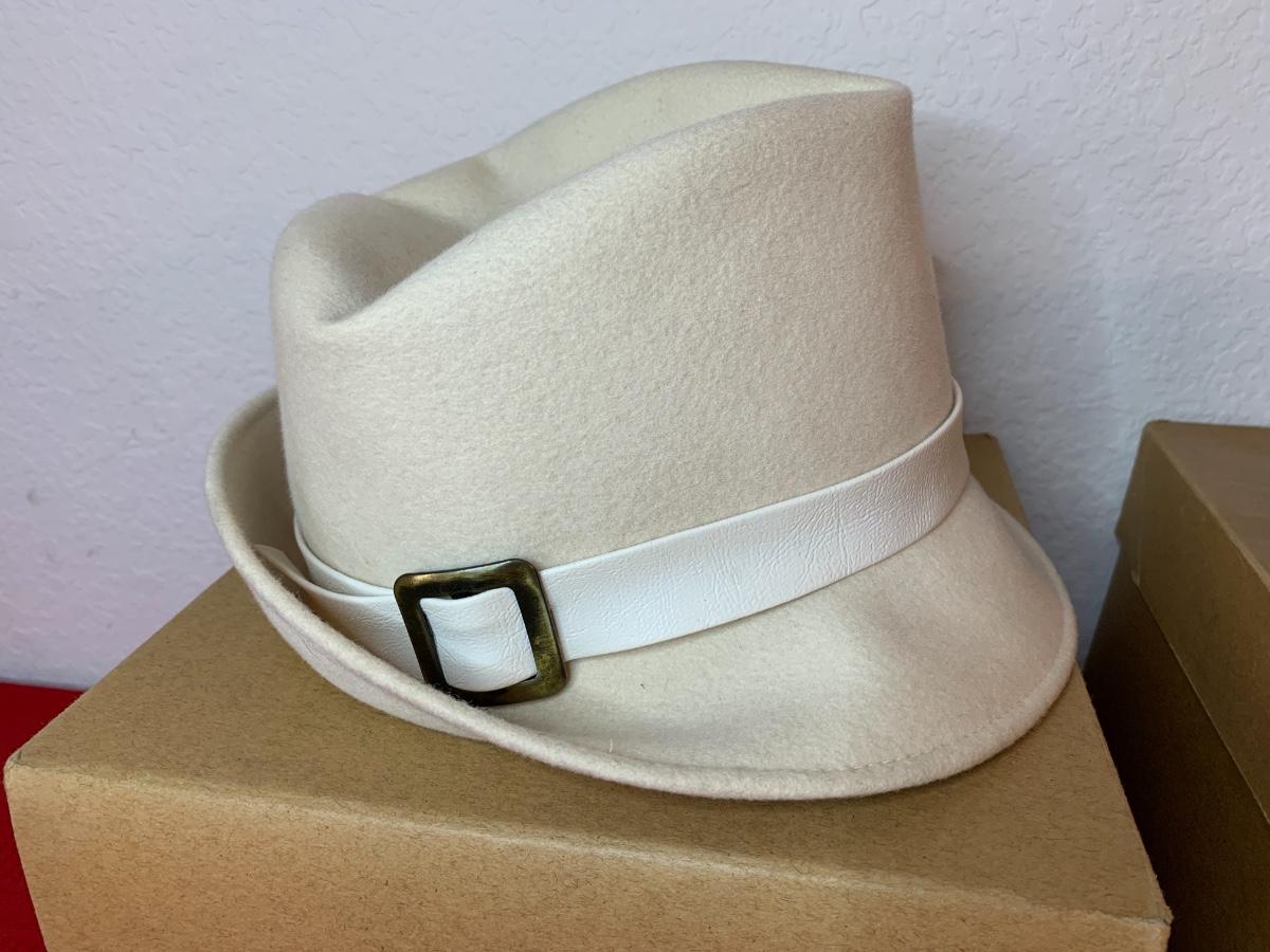 4 women’s hats including one fedora, a wide brimmed hat, a straw hat and one cocktail hat. All three hats pictured on top of boxes in excellent condition, wide brimmed hat in good condition.