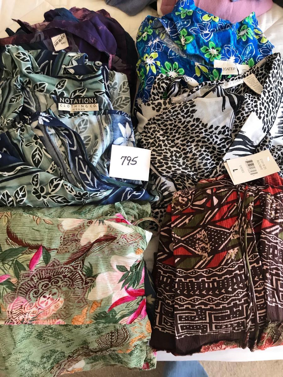 On clothing: New, some with tags! Please see photos for quantity, colors, size, and condition. Please, also most items are Large or XL in women's clothing.