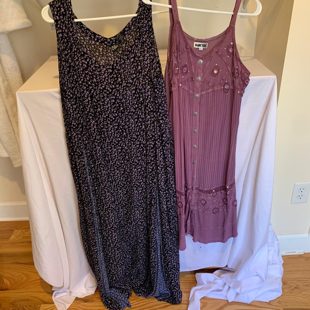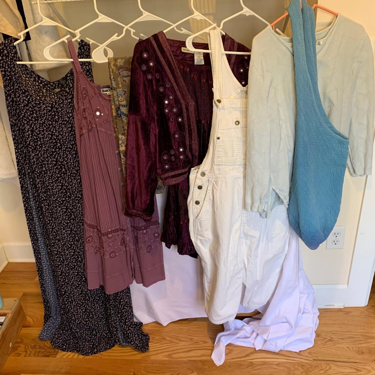 This lot includes a range of clothing pieces some of which have a Bohemian flare!. Included are two dresses, two clothing sets, one pair of overalls, one pair of trousers, and a bag. Brands included are Boston Company, White Stag, Olivia, Kaktus, and more. The sizes range from small to large. Some of the pieces have wear/stains (see photos). Shipping available.