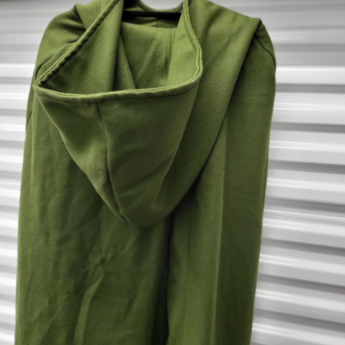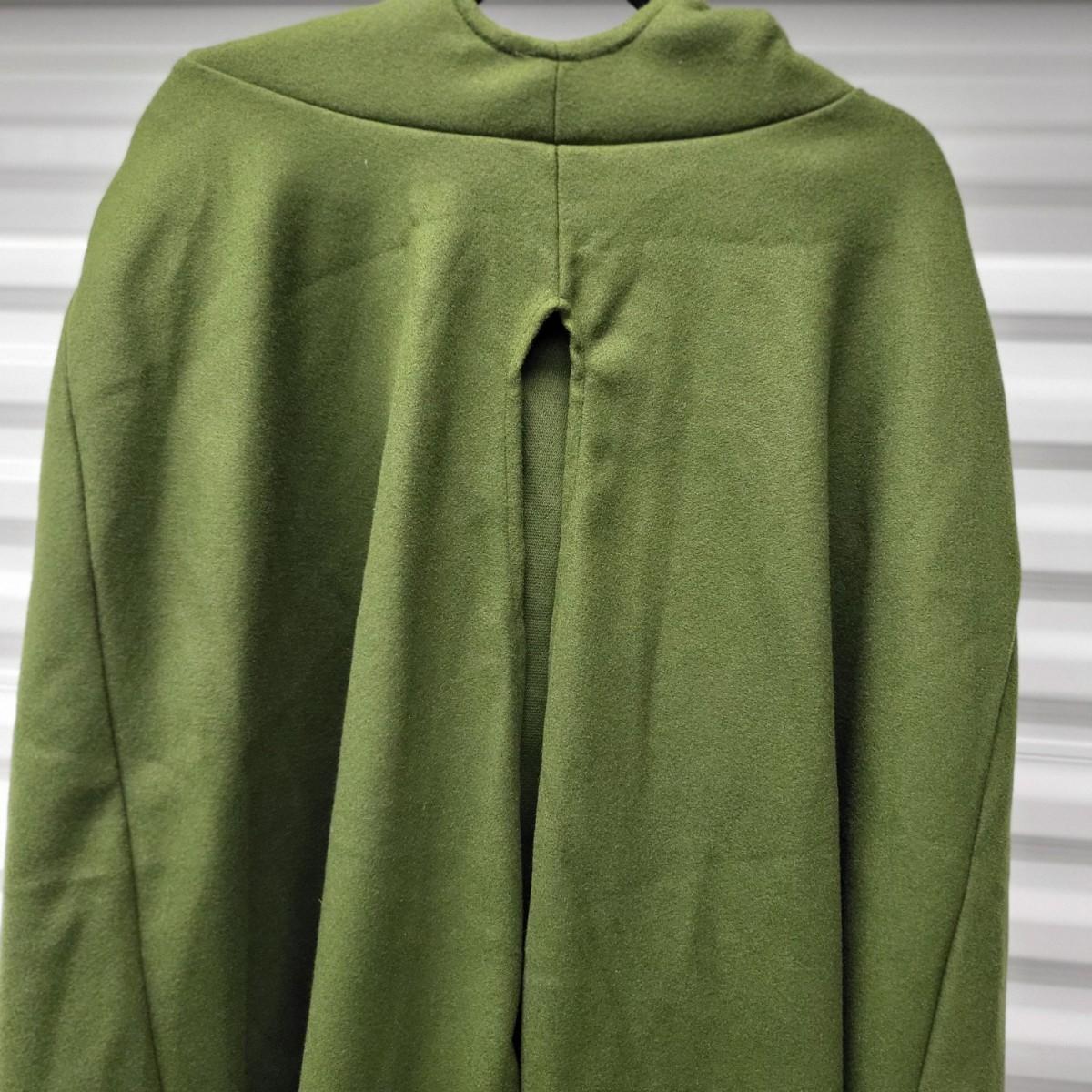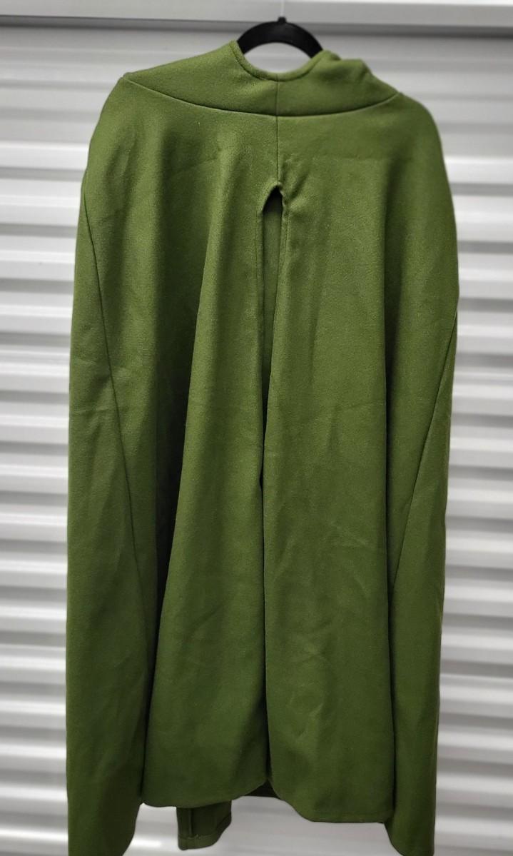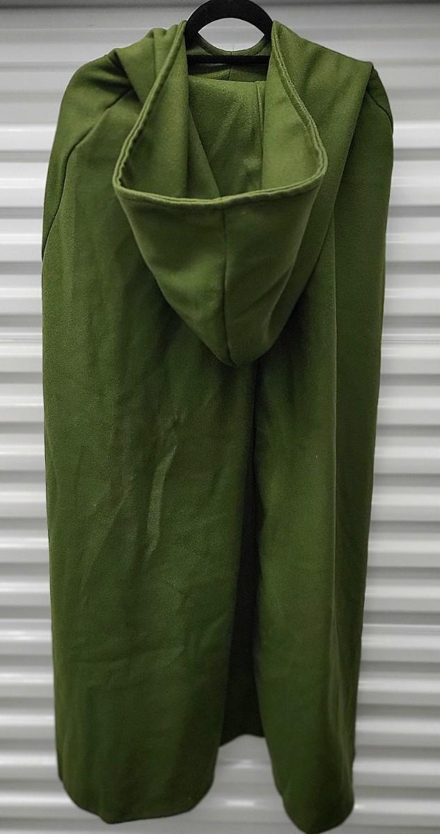 Forest green. One size fits most, 42" long, large hood. Pullover cape style poncho polyester, wool feel.