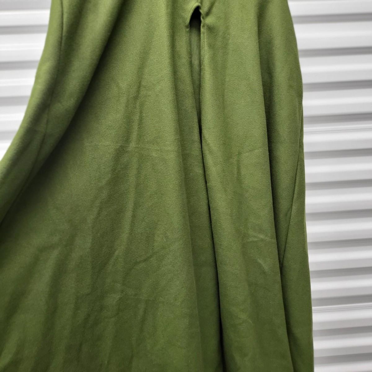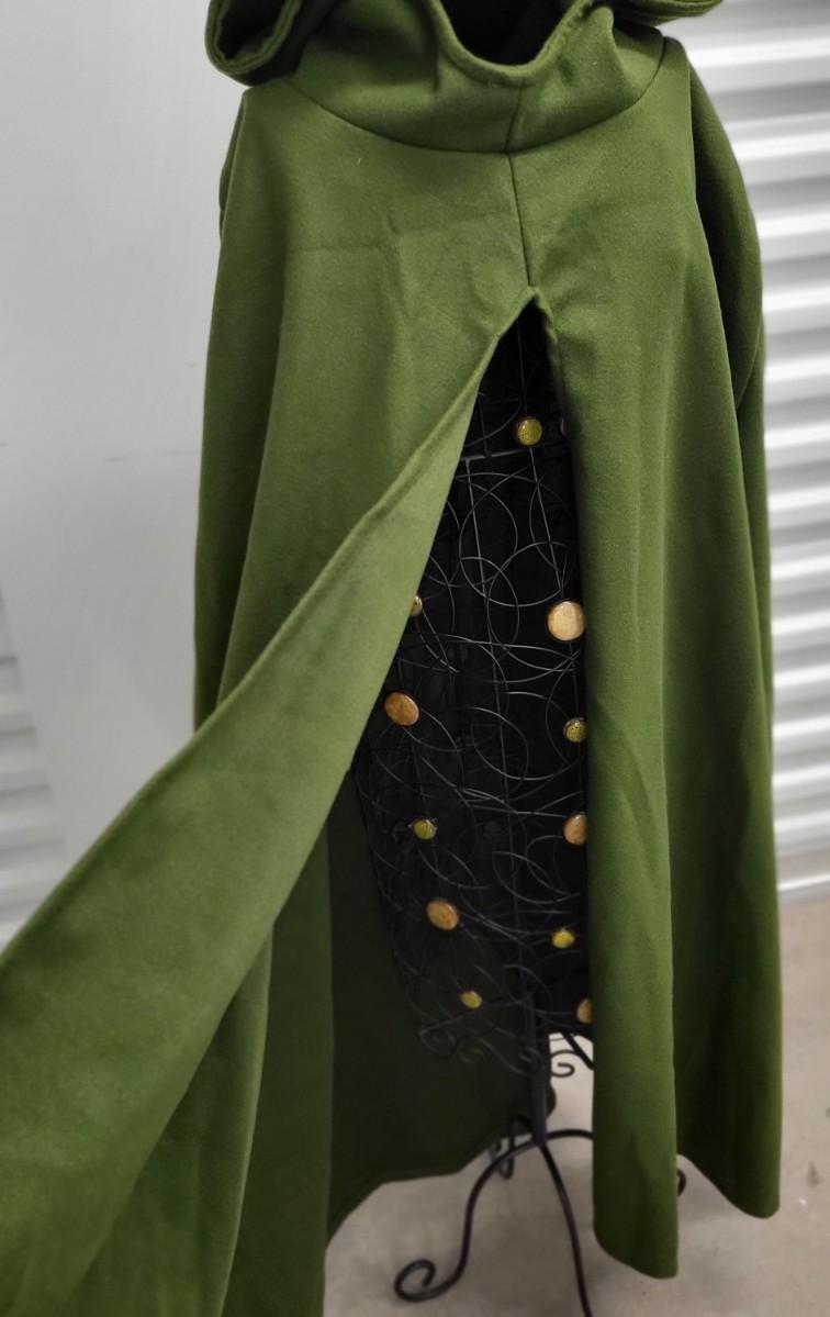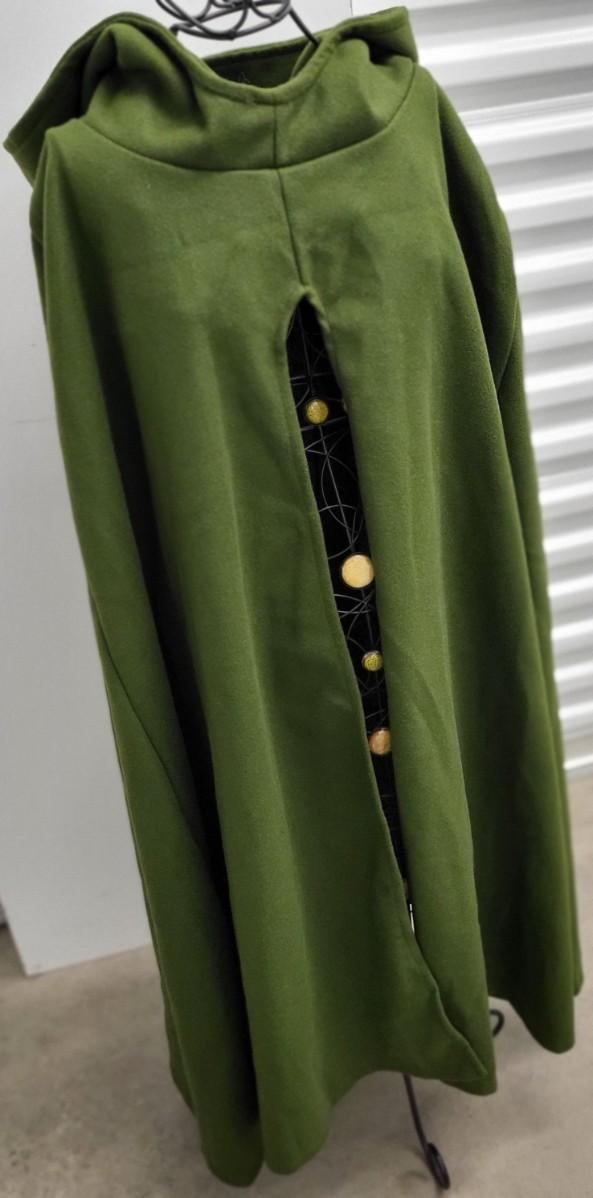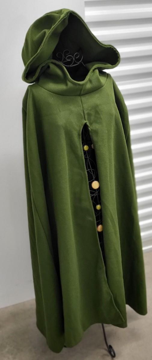 Forest green. One size fits most, 42" long, large hood. Pullover cape style poncho polyester, wool feel.