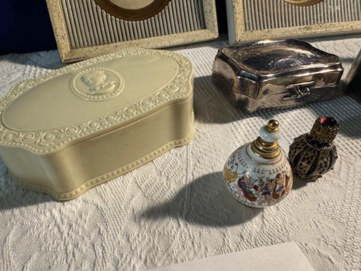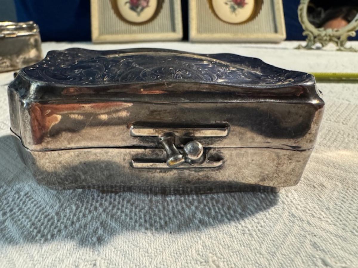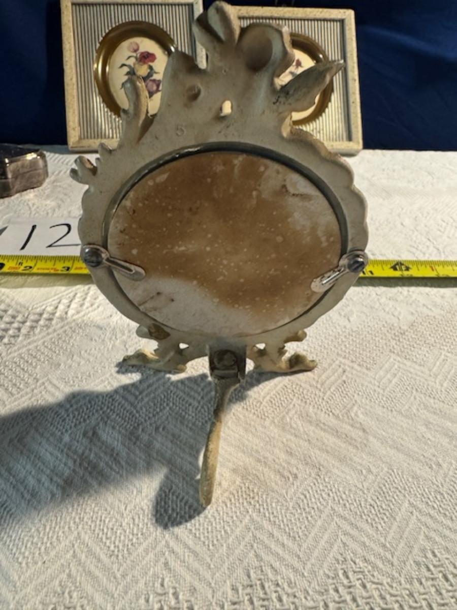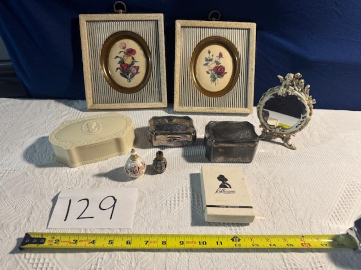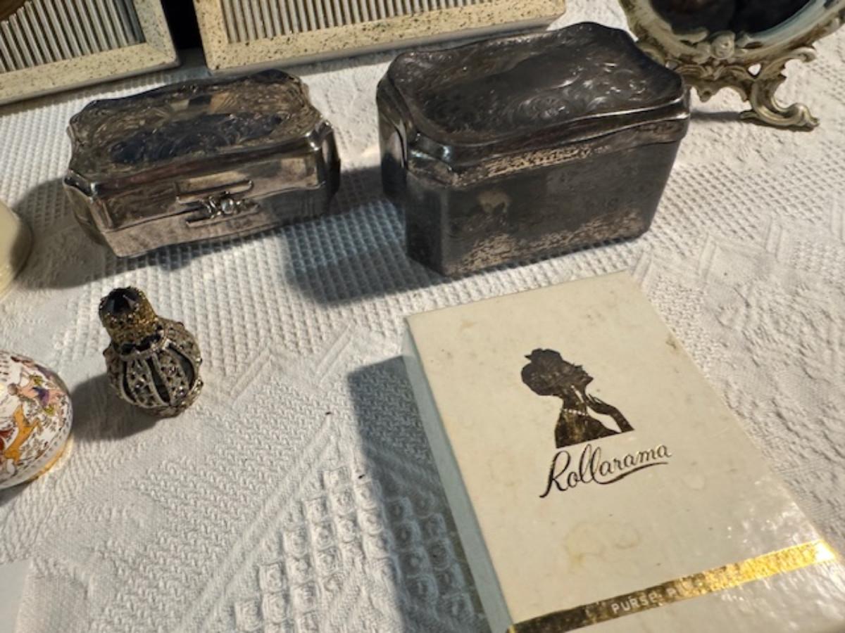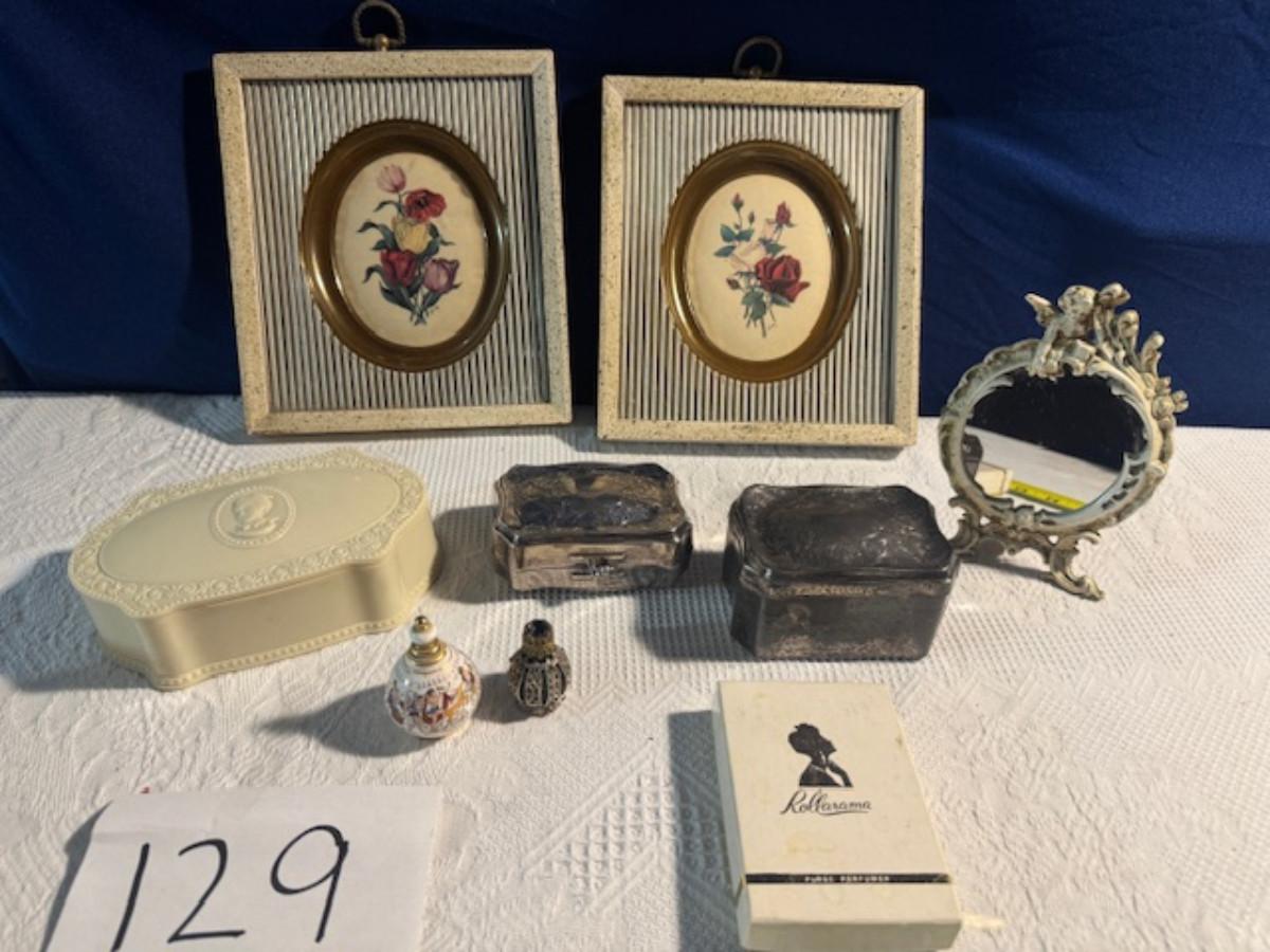Silver tone box 2" x 4" x 2.5" with lining inside need good cleaning/polishing. Another silver tone box 1.5" x 3" x 3" as found no lining no visible markings. Luxor celluloid box 1.5" x 6 1/4" x 3 3/4". 2 framed flower pictures 8 3/4" x 7.5" x 1/2". Rollarama purse perfume. Perfume bottle hand made in Greece 2.5". Perfume bottle ornate Irice 2" missing some stones. Mirror 6 1/4" x 4 1/4" as is mirror - can be replaced metal frame can stand on its own.