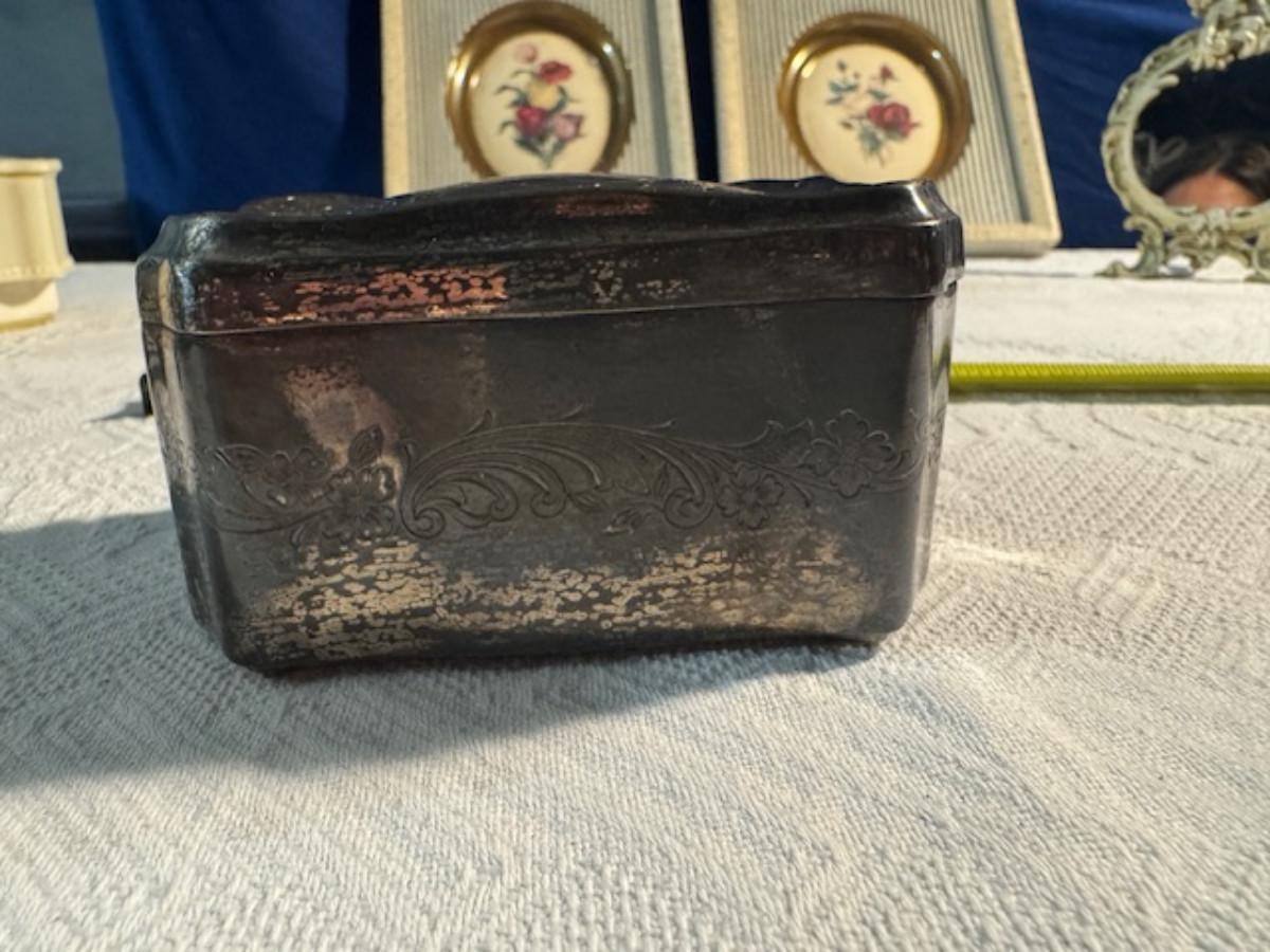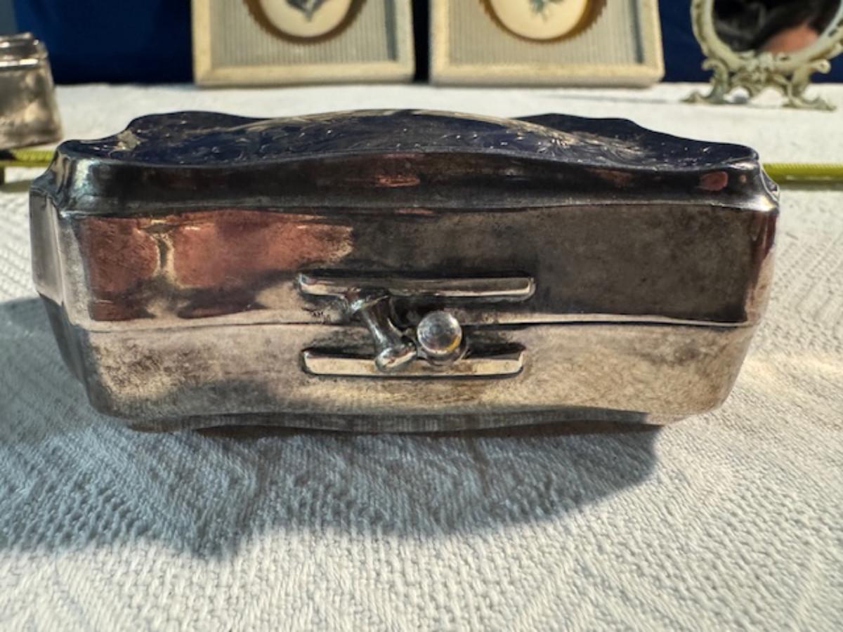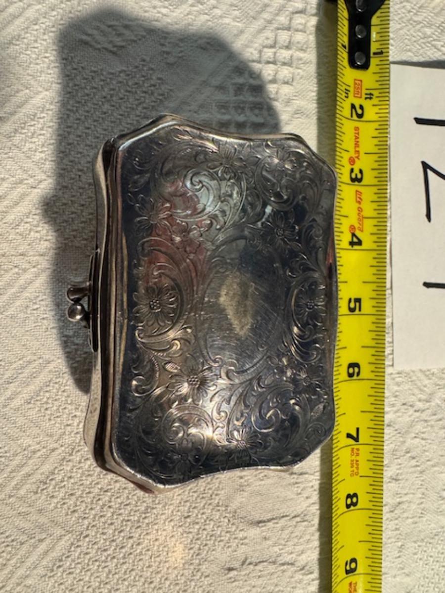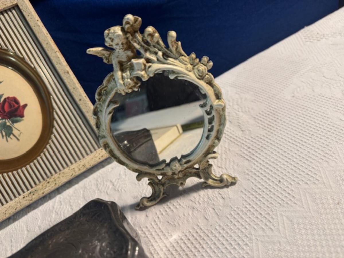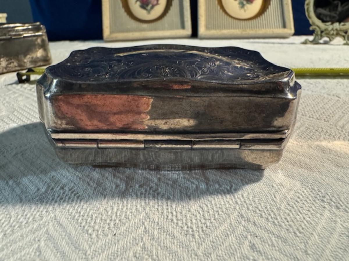 Silver tone box 2" x 4" x 2.5" with lining inside need good cleaning/polishing. Another silver tone box 1.5" x 3" x 3" as found no lining no visible markings. Luxor celluloid box 1.5" x 6 1/4" x 3 3/4". 2 framed flower pictures 8 3/4" x 7.5" x 1/2". Rollarama purse perfume. Perfume bottle hand made in Greece 2.5". Perfume bottle ornate Irice 2" missing some stones. Mirror 6 1/4" x 4 1/4" as is mirror - can be replaced metal frame can stand on its own.