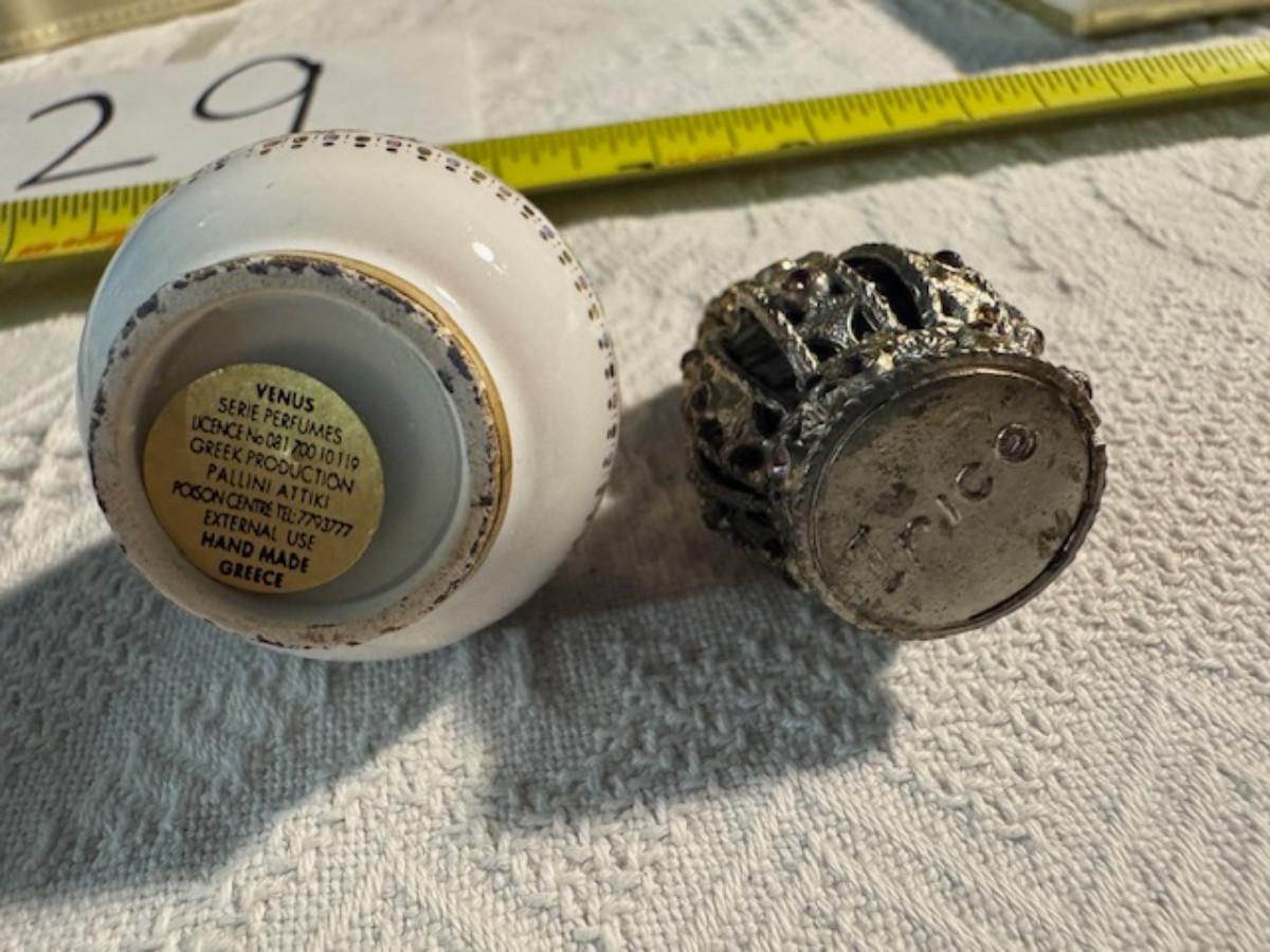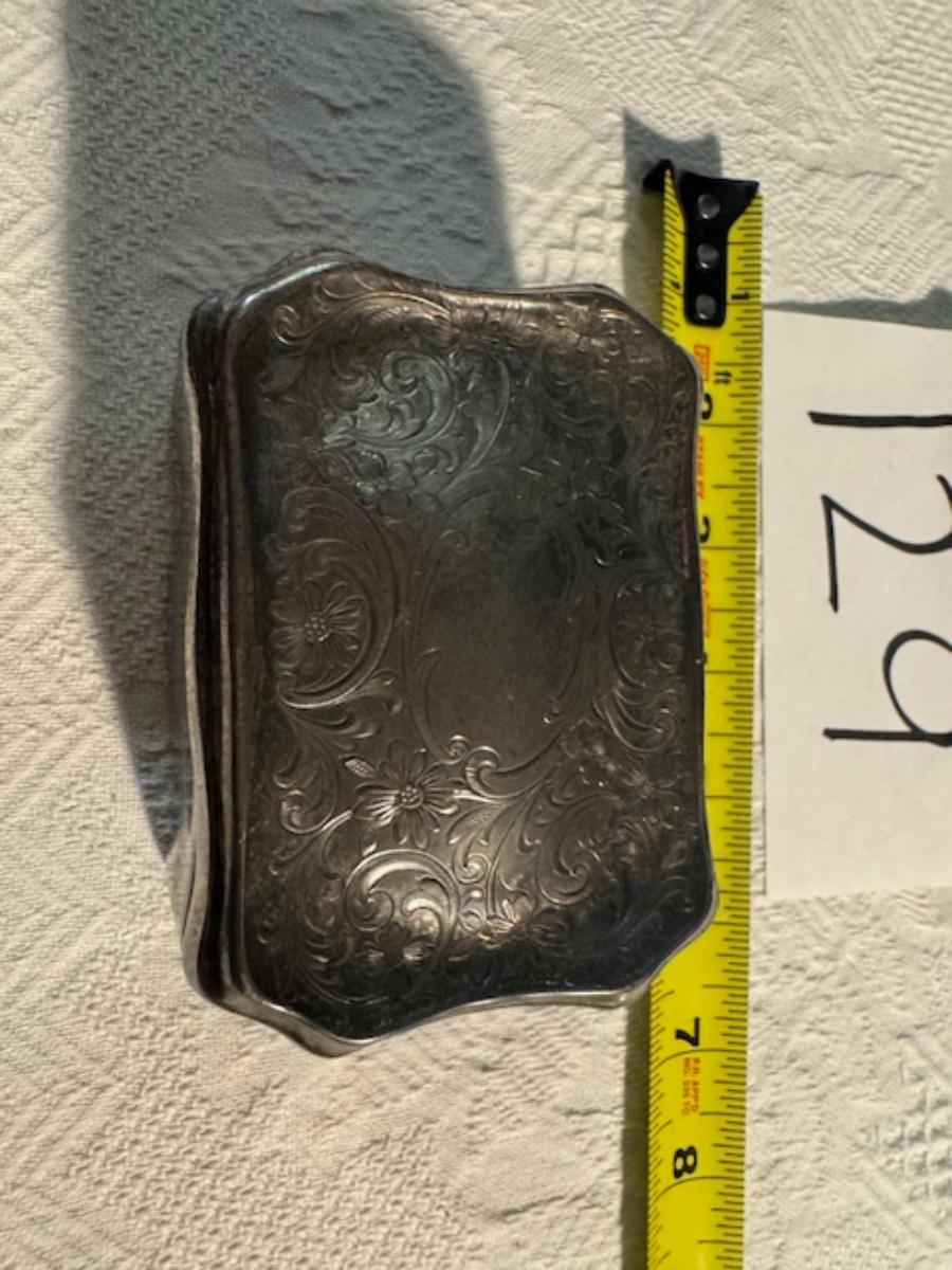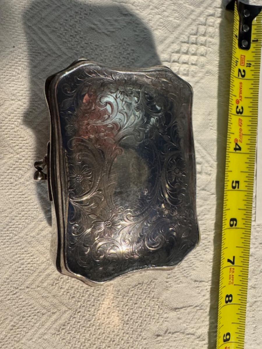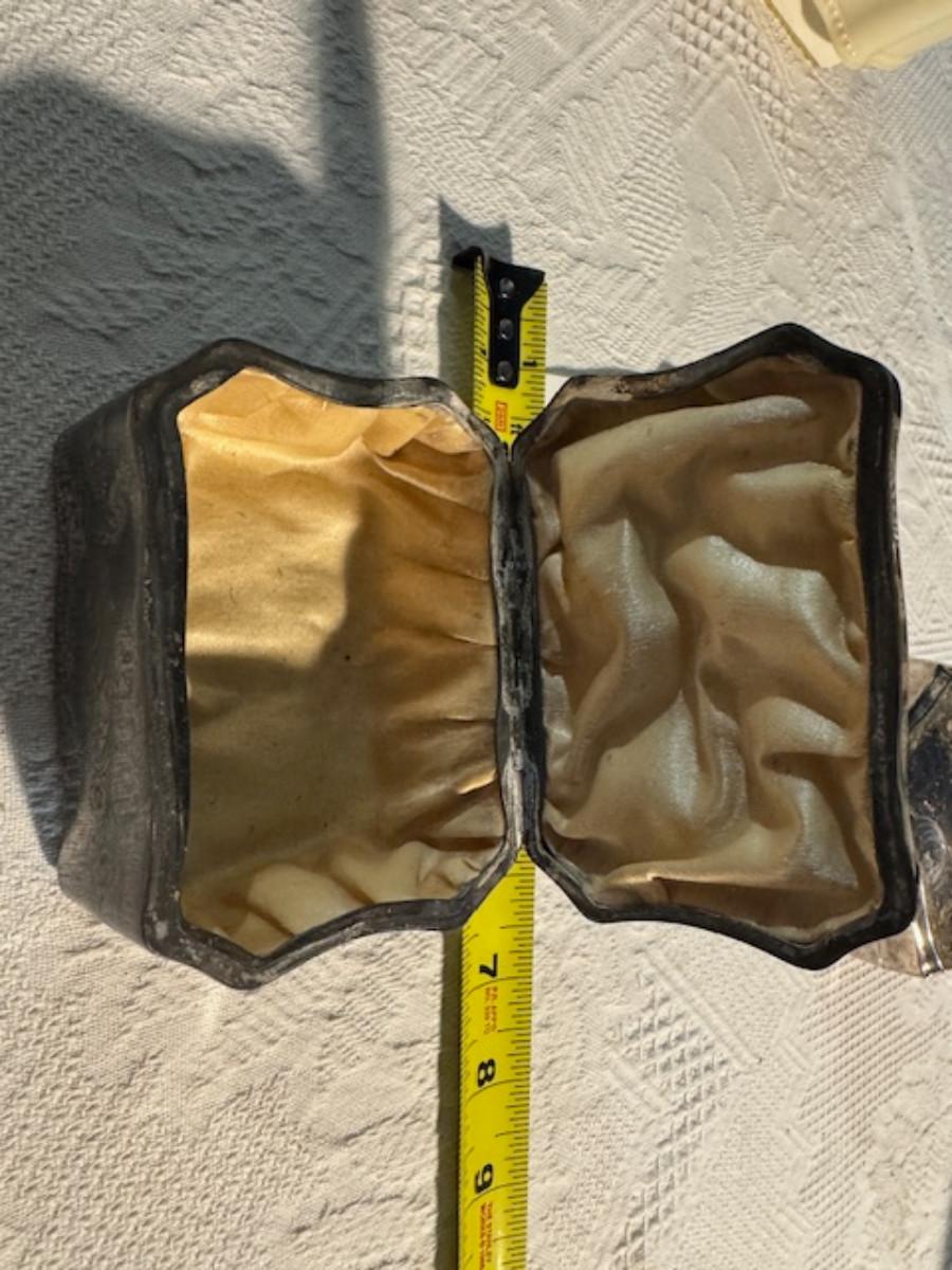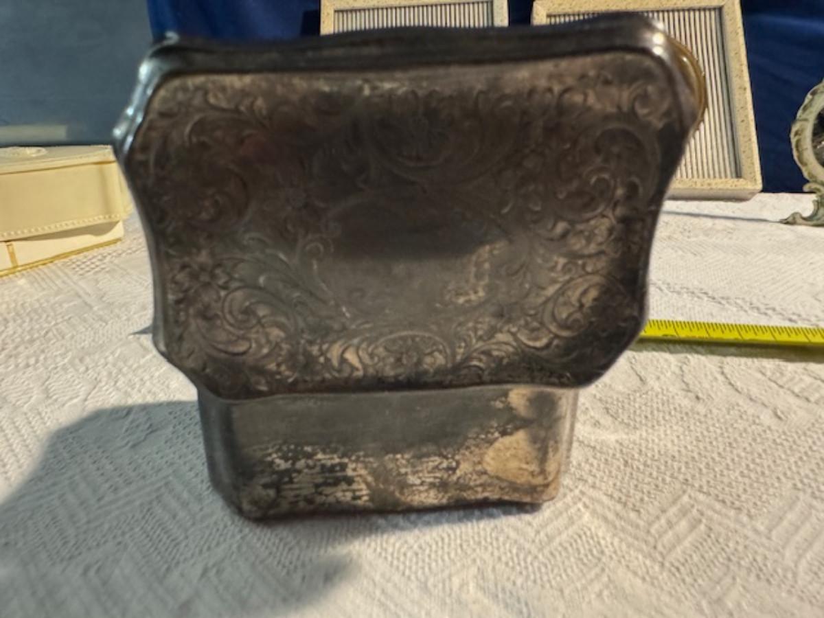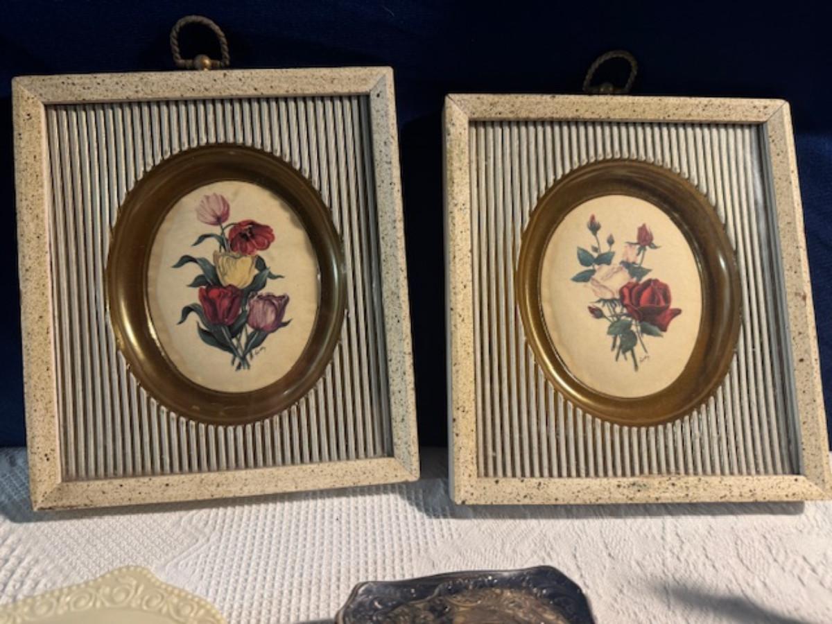 Silver tone box 2" x 4" x 2.5" with lining inside need good cleaning/polishing. Another silver tone box 1.5" x 3" x 3" as found no lining no visible markings. Luxor celluloid box 1.5" x 6 1/4" x 3 3/4". 2 framed flower pictures 8 3/4" x 7.5" x 1/2". Rollarama purse perfume. Perfume bottle hand made in Greece 2.5". Perfume bottle ornate Irice 2" missing some stones. Mirror 6 1/4" x 4 1/4" as is mirror - can be replaced metal frame can stand on its own.