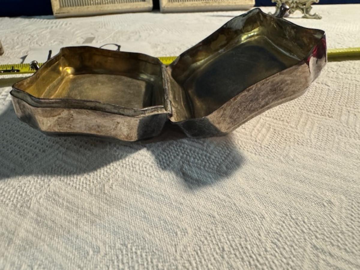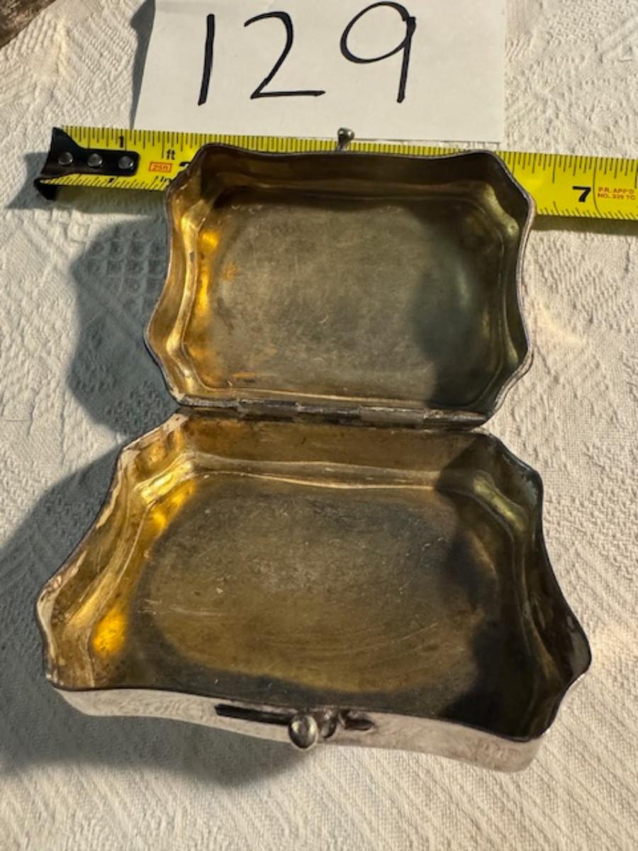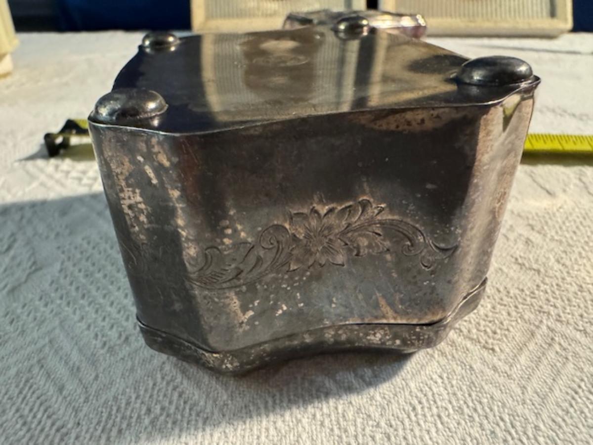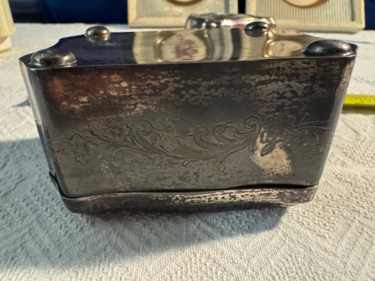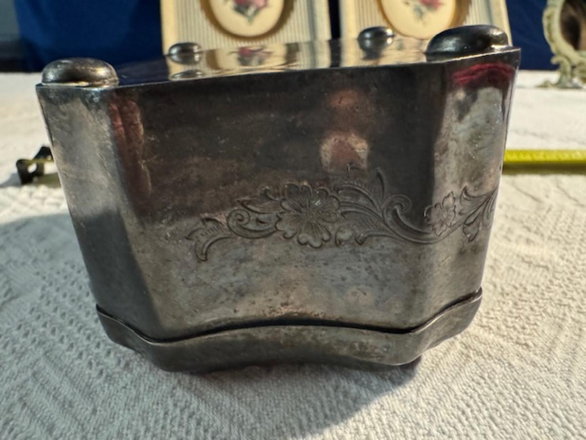 Silver tone box 2" x 4" x 2.5" with lining inside need good cleaning/polishing. Another silver tone box 1.5" x 3" x 3" as found no lining no visible markings. Luxor celluloid box 1.5" x 6 1/4" x 3 3/4". 2 framed flower pictures 8 3/4" x 7.5" x 1/2". Rollarama purse perfume. Perfume bottle hand made in Greece 2.5". Perfume bottle ornate Irice 2" missing some stones. Mirror 6 1/4" x 4 1/4" as is mirror - can be replaced metal frame can stand on its own.