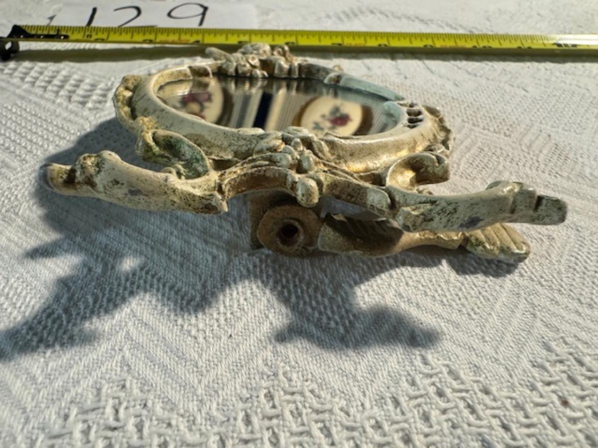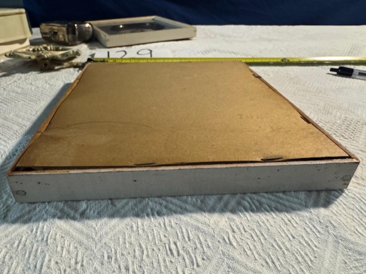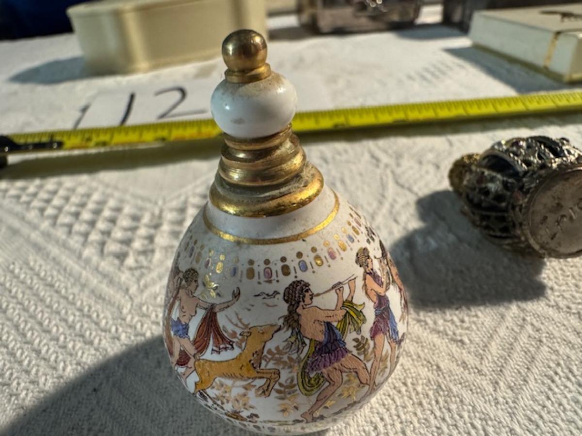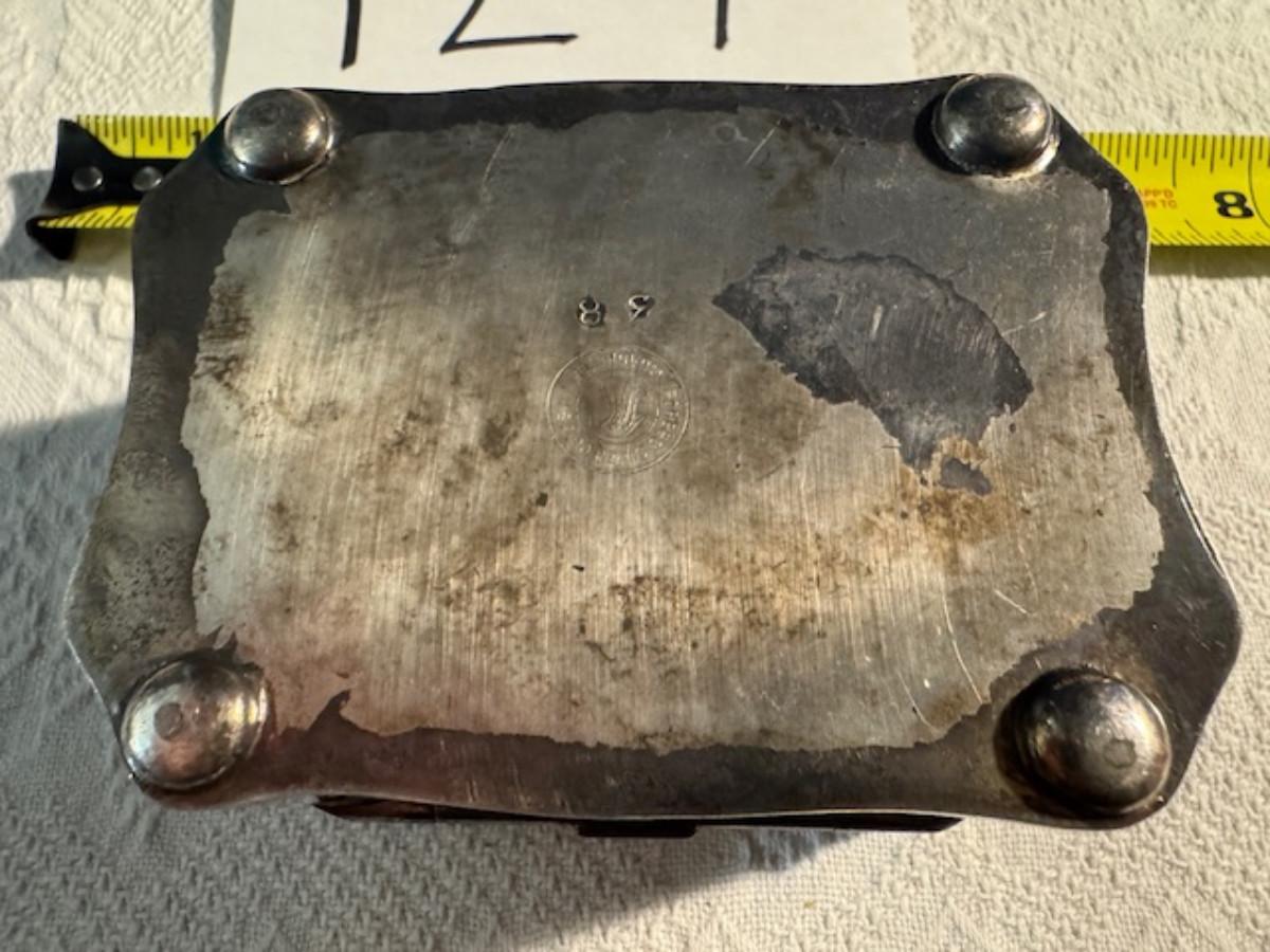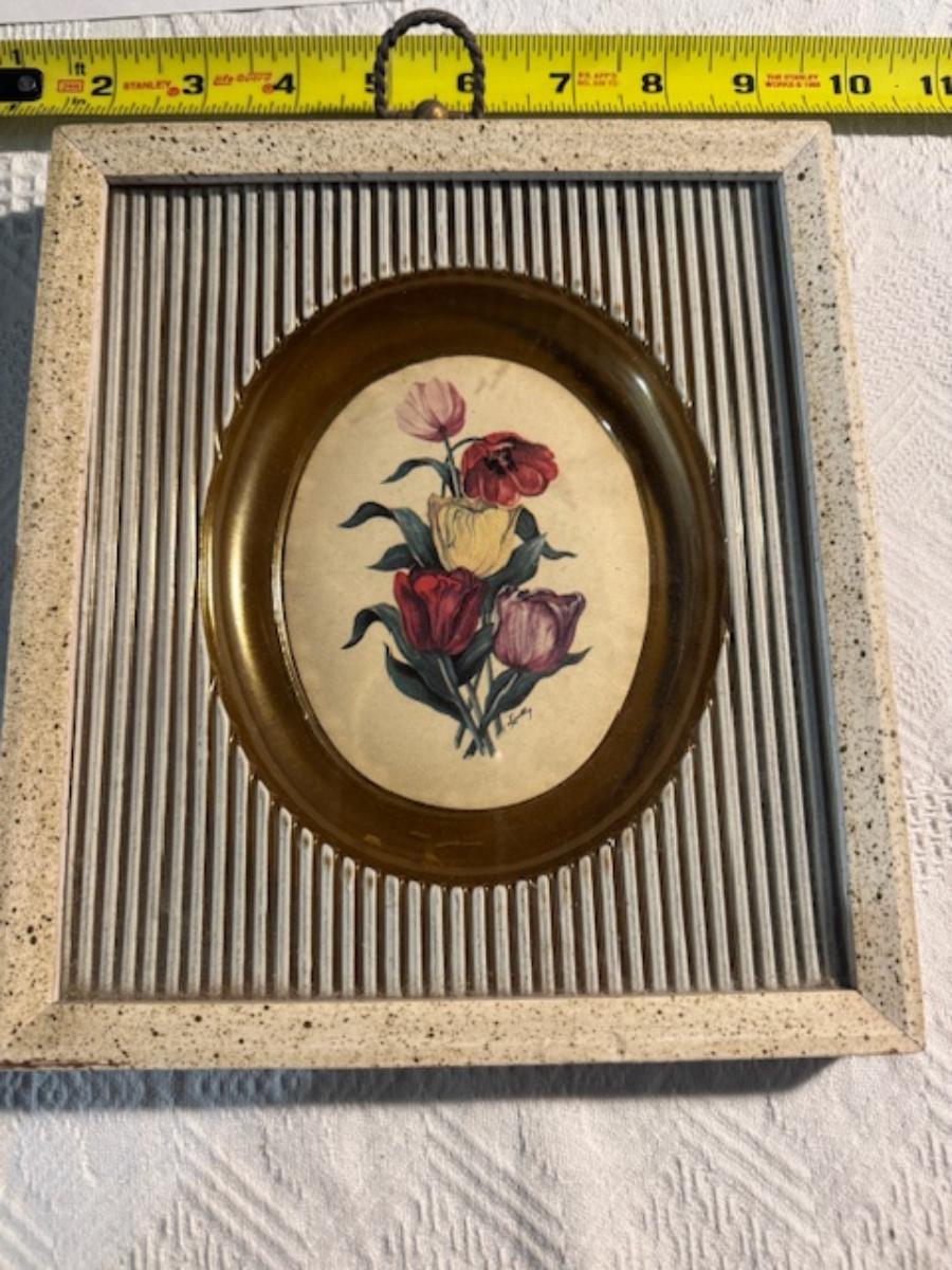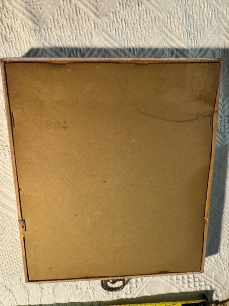 Silver tone box 2" x 4" x 2.5" with lining inside need good cleaning/polishing. Another silver tone box 1.5" x 3" x 3" as found no lining no visible markings. Luxor celluloid box 1.5" x 6 1/4" x 3 3/4". 2 framed flower pictures 8 3/4" x 7.5" x 1/2". Rollarama purse perfume. Perfume bottle hand made in Greece 2.5". Perfume bottle ornate Irice 2" missing some stones. Mirror 6 1/4" x 4 1/4" as is mirror - can be replaced metal frame can stand on its own.