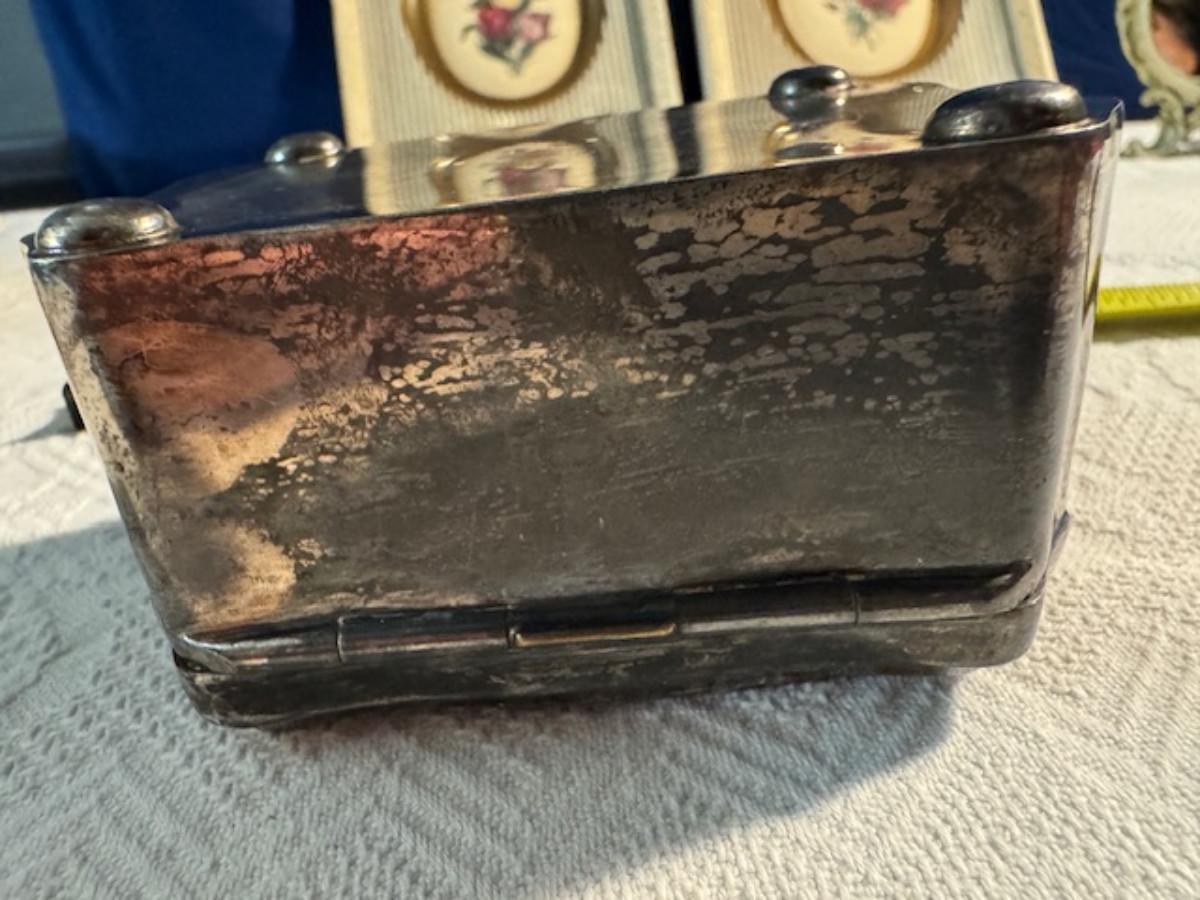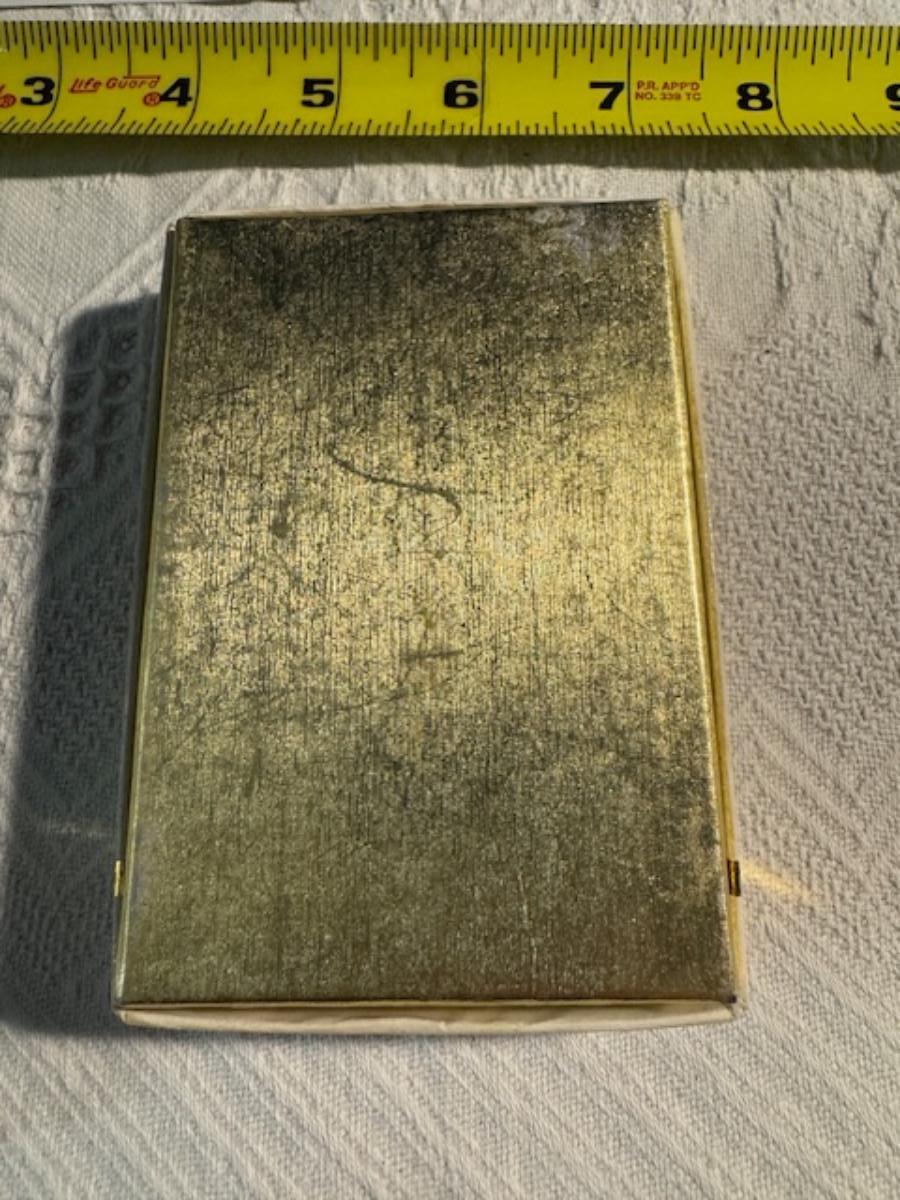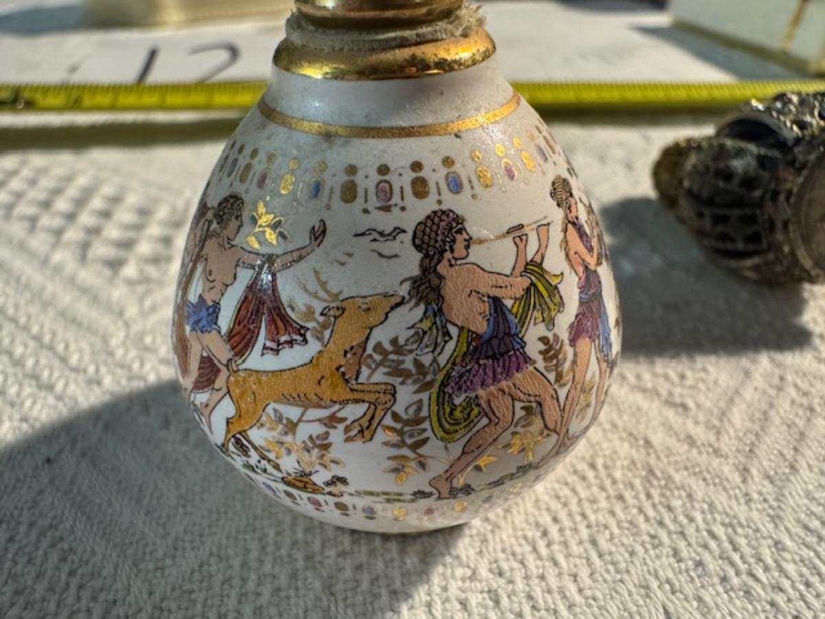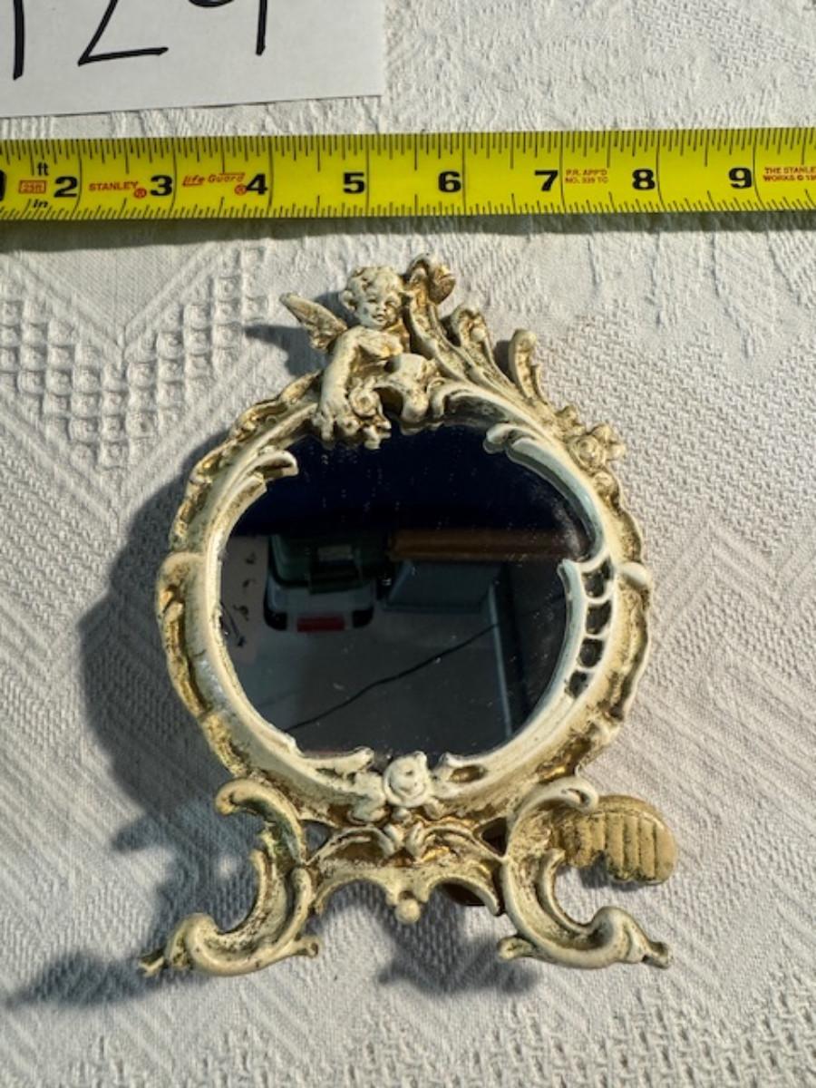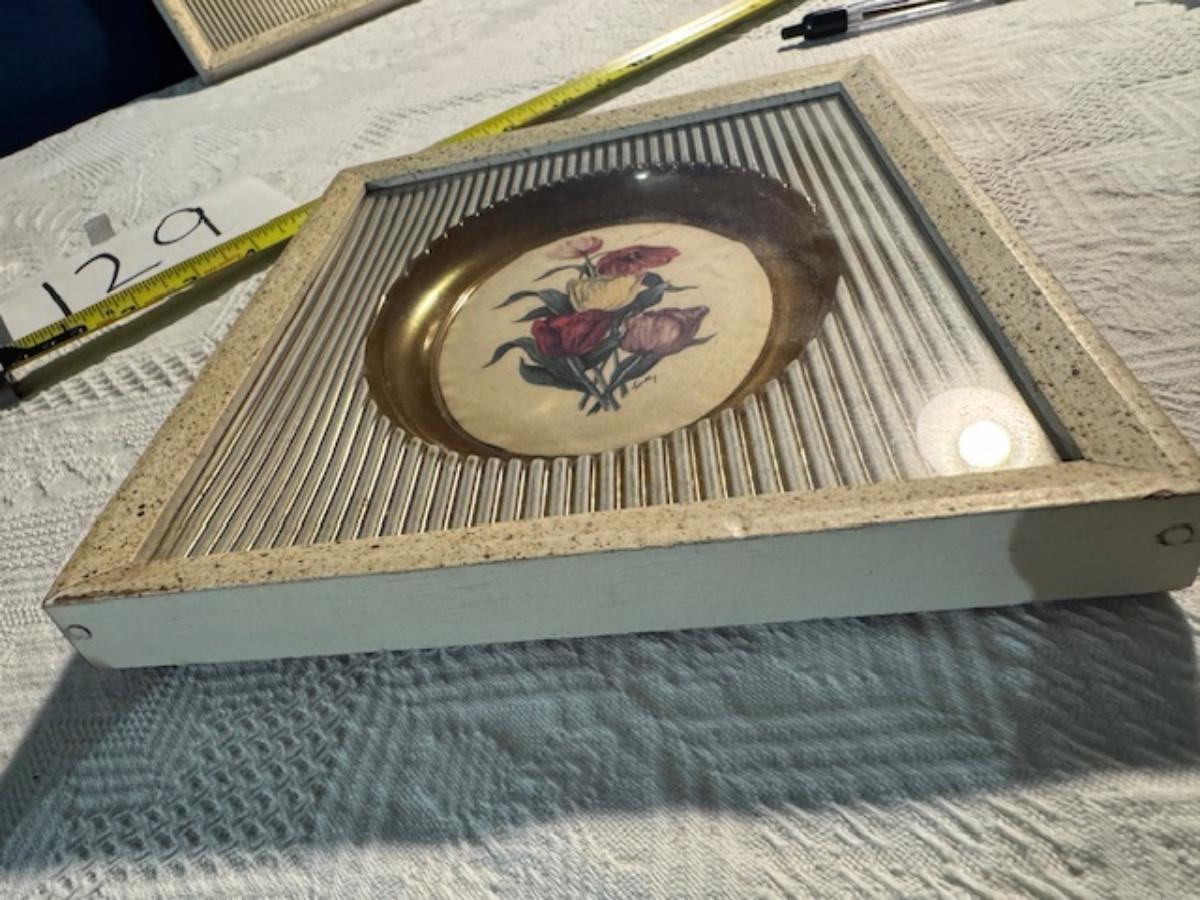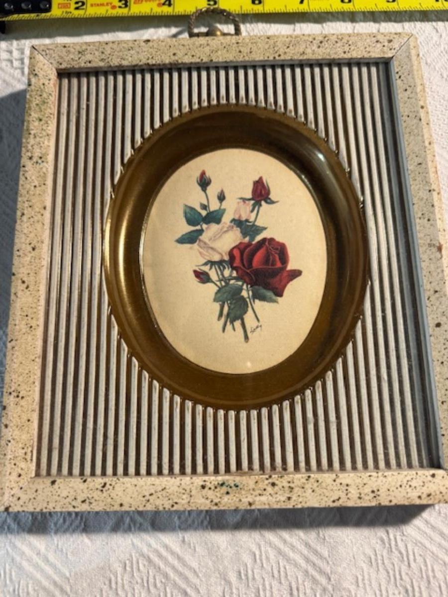 Silver tone box 2" x 4" x 2.5" with lining inside need good cleaning/polishing. Another silver tone box 1.5" x 3" x 3" as found no lining no visible markings. Luxor celluloid box 1.5" x 6 1/4" x 3 3/4". 2 framed flower pictures 8 3/4" x 7.5" x 1/2". Rollarama purse perfume. Perfume bottle hand made in Greece 2.5". Perfume bottle ornate Irice 2" missing some stones. Mirror 6 1/4" x 4 1/4" as is mirror - can be replaced metal frame can stand on its own.
