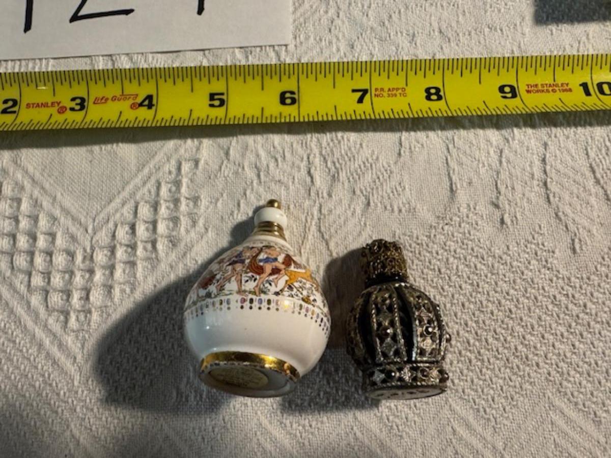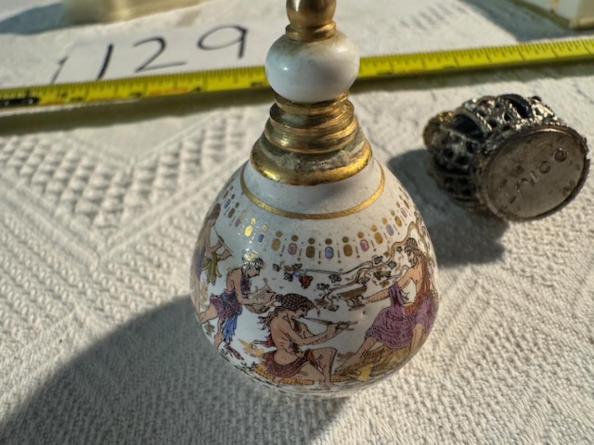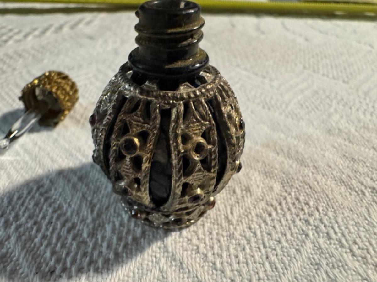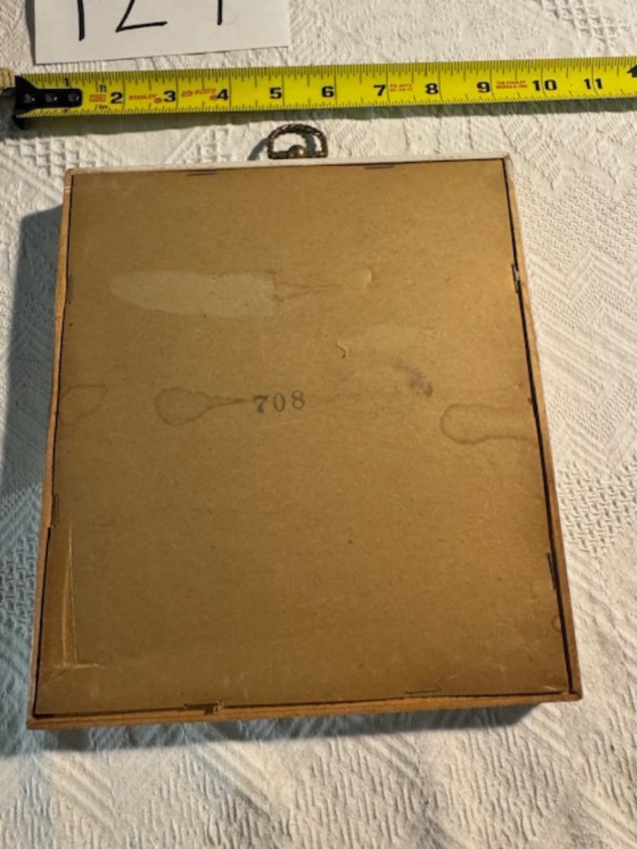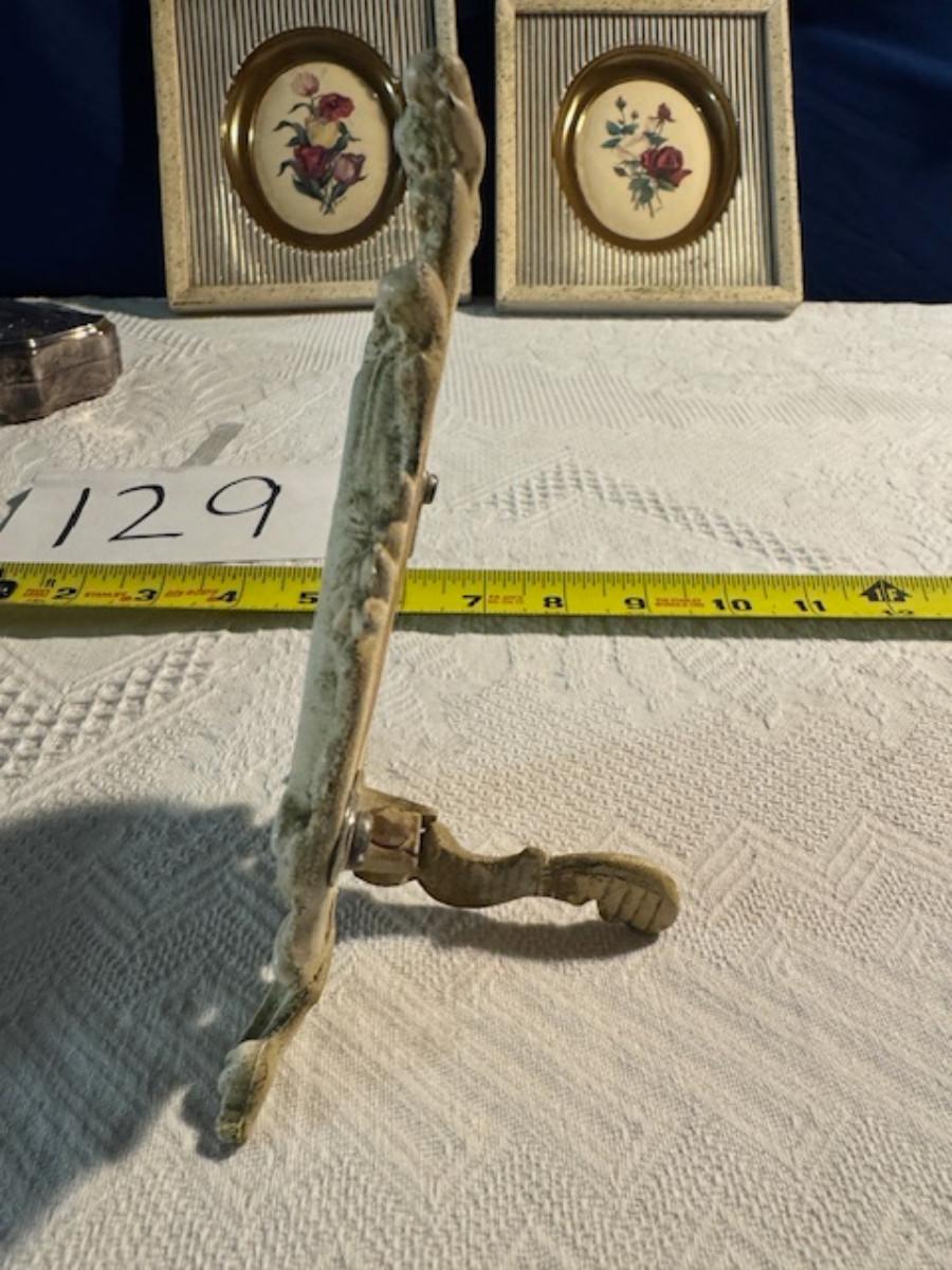 Silver tone box 2" x 4" x 2.5" with lining inside need good cleaning/polishing. Another silver tone box 1.5" x 3" x 3" as found no lining no visible markings. Luxor celluloid box 1.5" x 6 1/4" x 3 3/4". 2 framed flower pictures 8 3/4" x 7.5" x 1/2". Rollarama purse perfume. Perfume bottle hand made in Greece 2.5". Perfume bottle ornate Irice 2" missing some stones. Mirror 6 1/4" x 4 1/4" as is mirror - can be replaced metal frame can stand on its own.