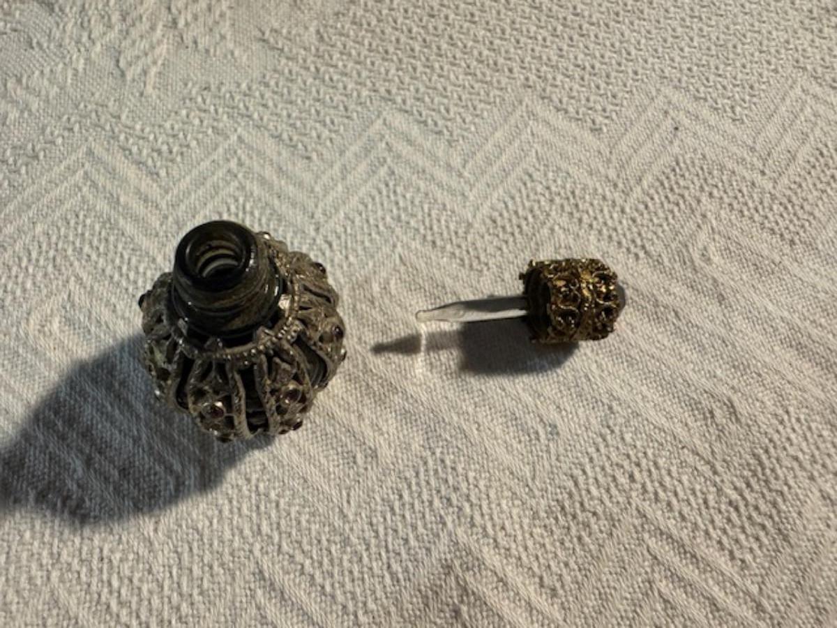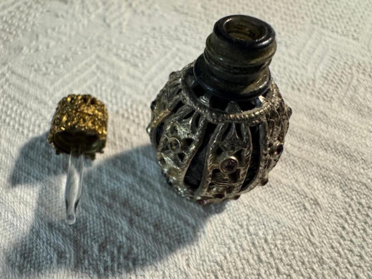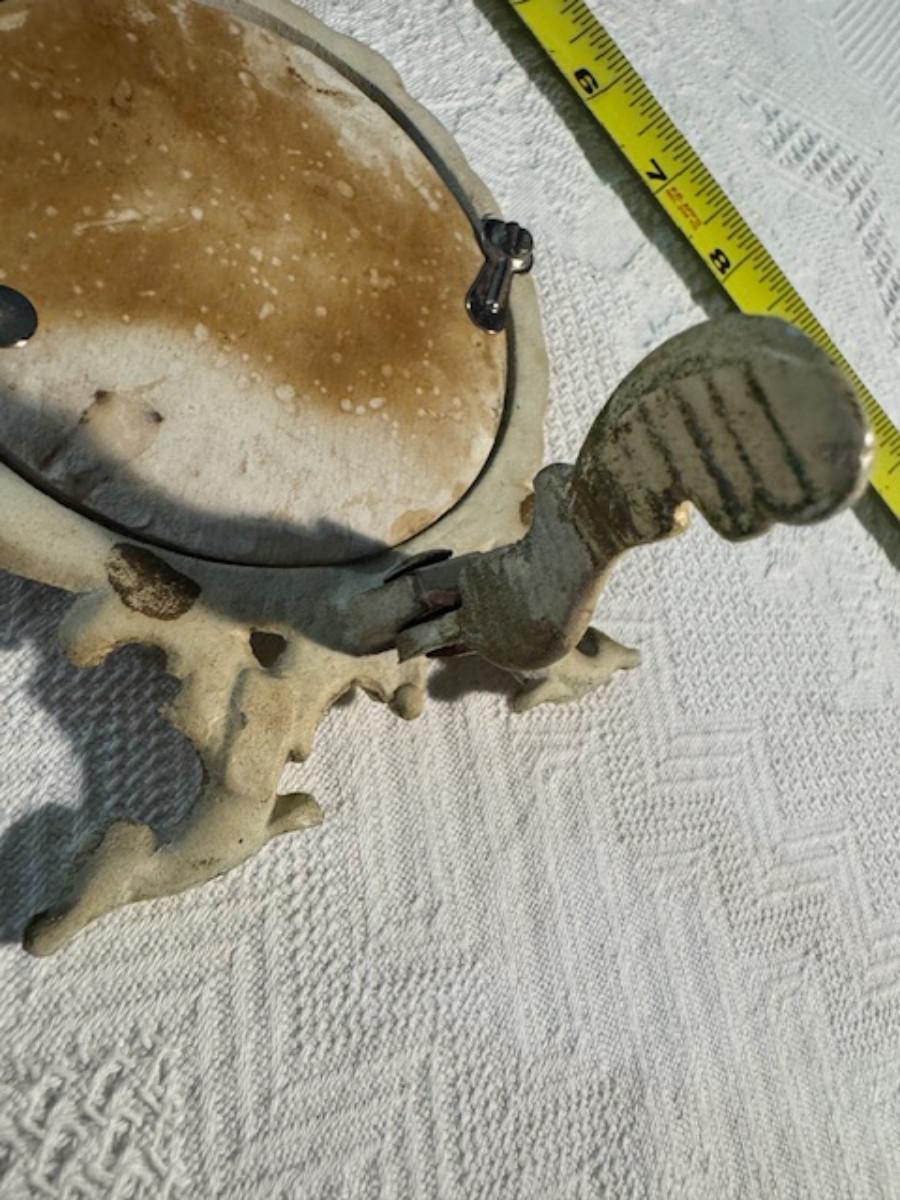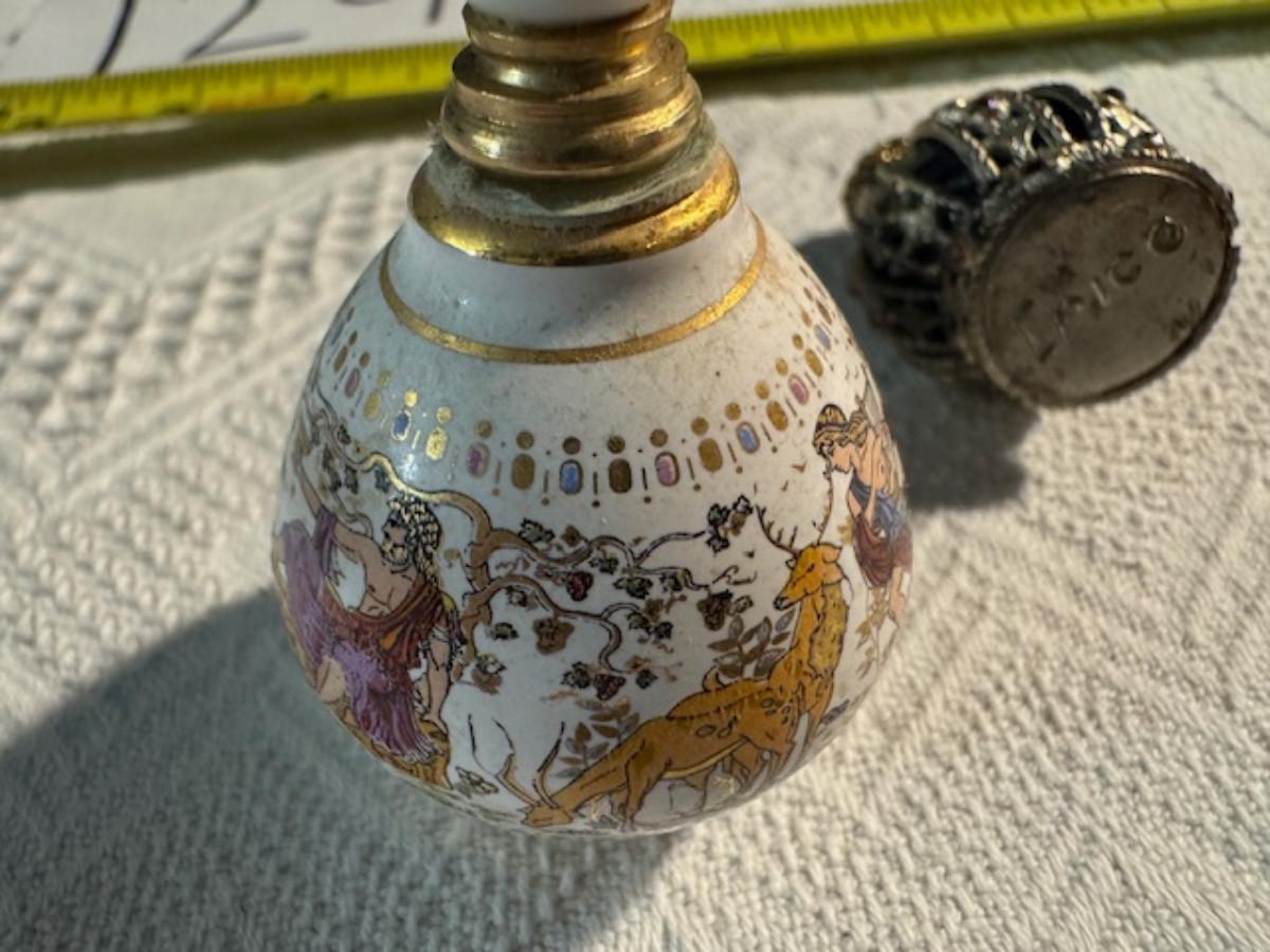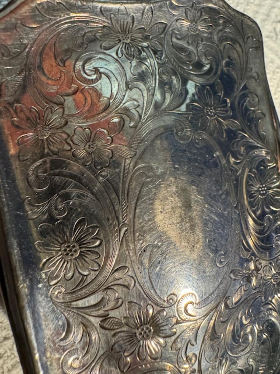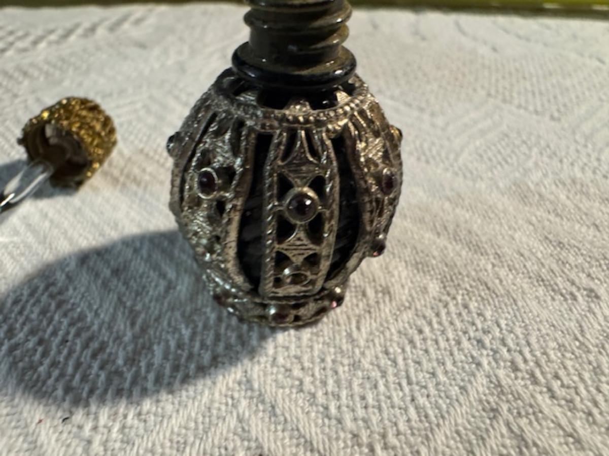 Silver tone box 2" x 4" x 2.5" with lining inside need good cleaning/polishing. Another silver tone box 1.5" x 3" x 3" as found no lining no visible markings. Luxor celluloid box 1.5" x 6 1/4" x 3 3/4". 2 framed flower pictures 8 3/4" x 7.5" x 1/2". Rollarama purse perfume. Perfume bottle hand made in Greece 2.5". Perfume bottle ornate Irice 2" missing some stones. Mirror 6 1/4" x 4 1/4" as is mirror - can be replaced metal frame can stand on its own.