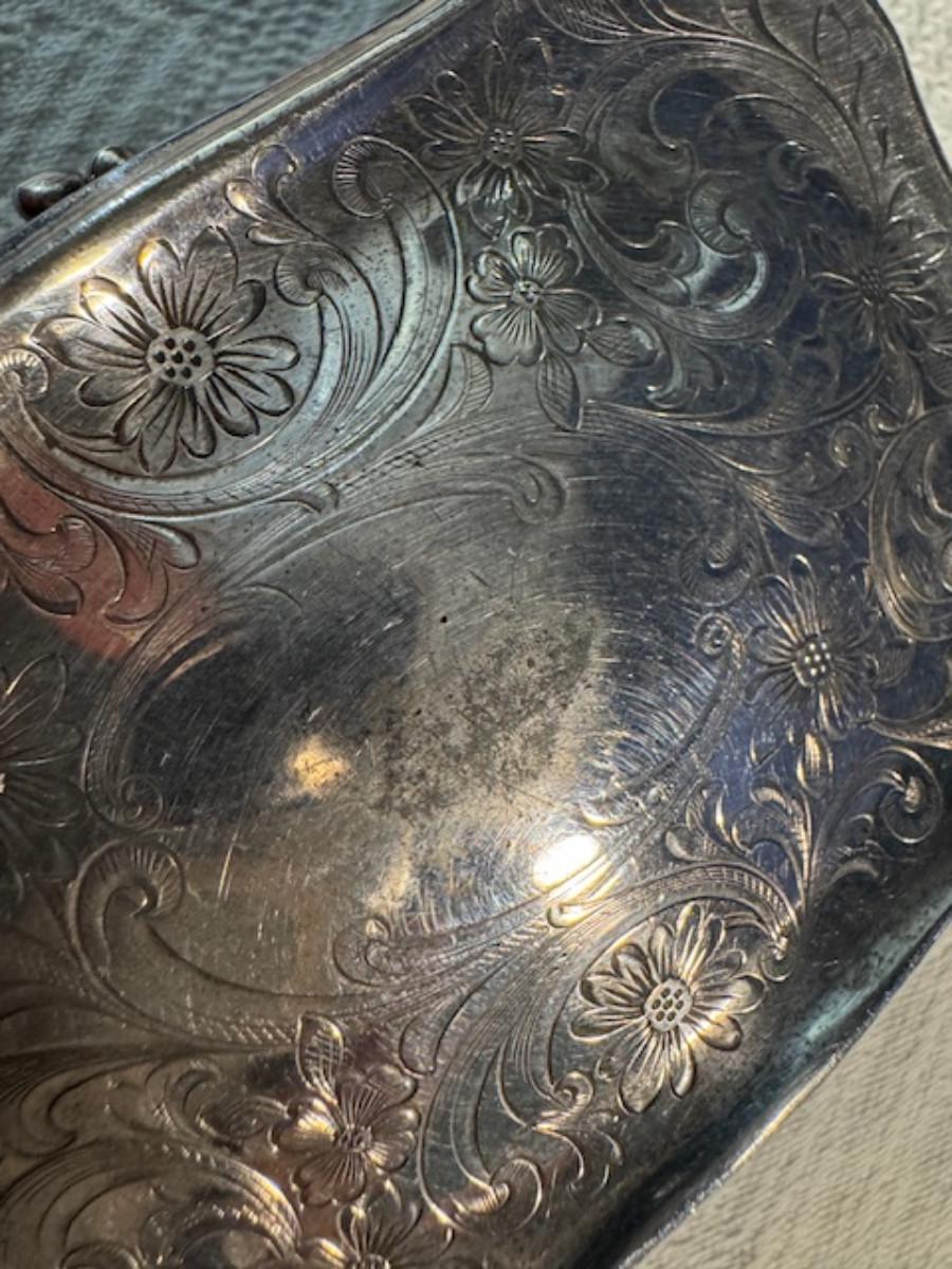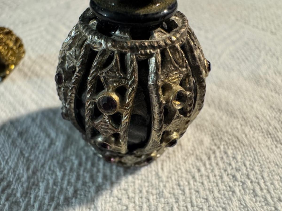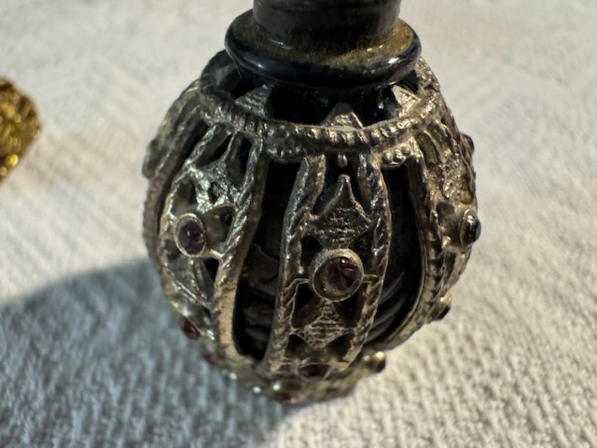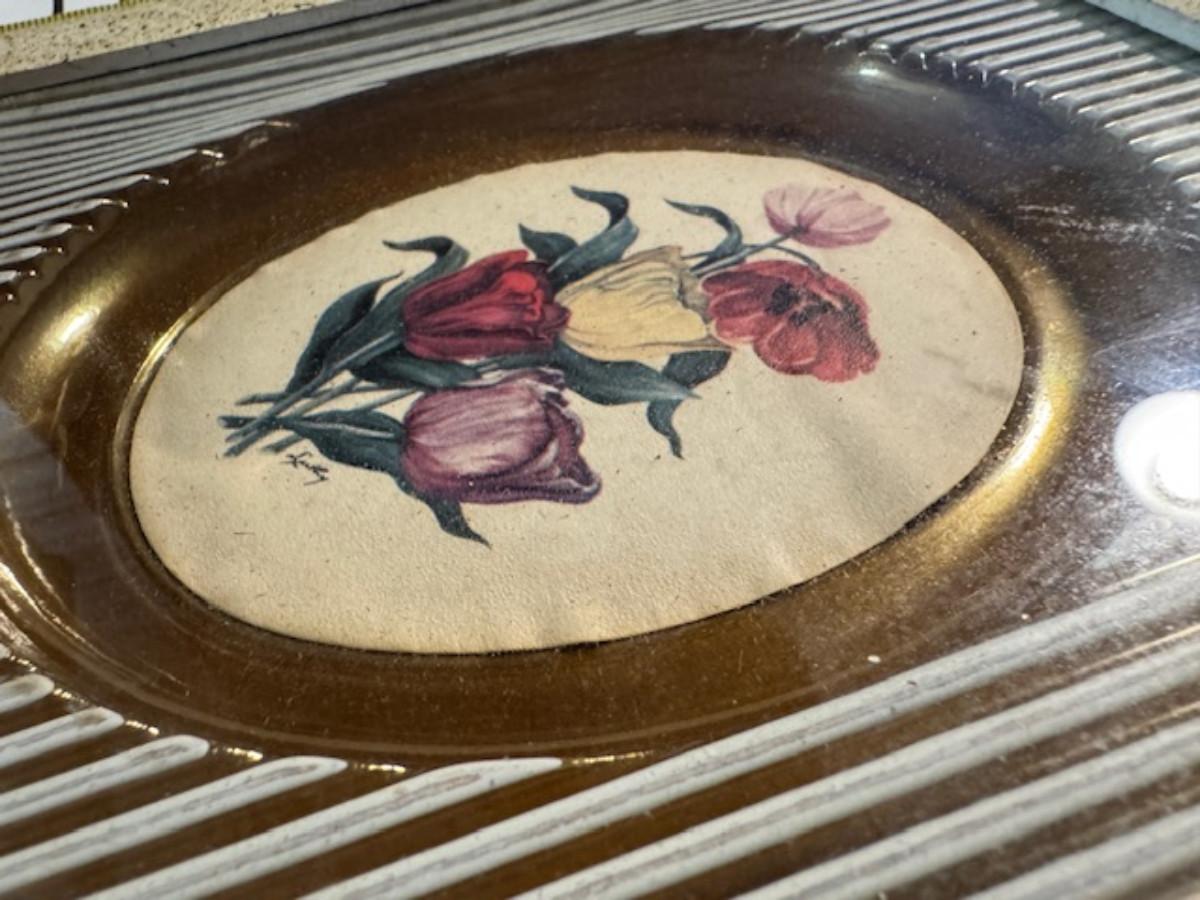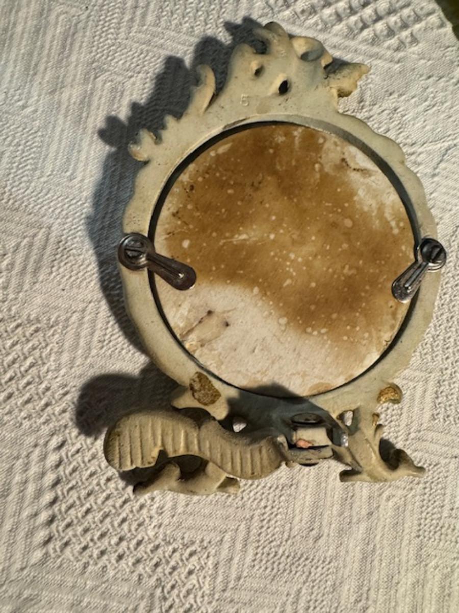 Silver tone box 2" x 4" x 2.5" with lining inside need good cleaning/polishing. Another silver tone box 1.5" x 3" x 3" as found no lining no visible markings. Luxor celluloid box 1.5" x 6 1/4" x 3 3/4". 2 framed flower pictures 8 3/4" x 7.5" x 1/2". Rollarama purse perfume. Perfume bottle hand made in Greece 2.5". Perfume bottle ornate Irice 2" missing some stones. Mirror 6 1/4" x 4 1/4" as is mirror - can be replaced metal frame can stand on its own.