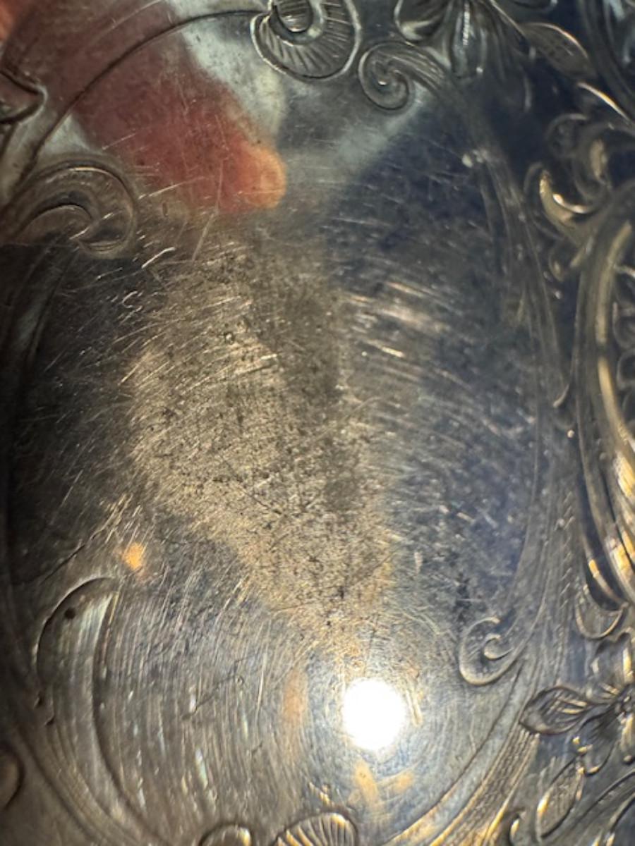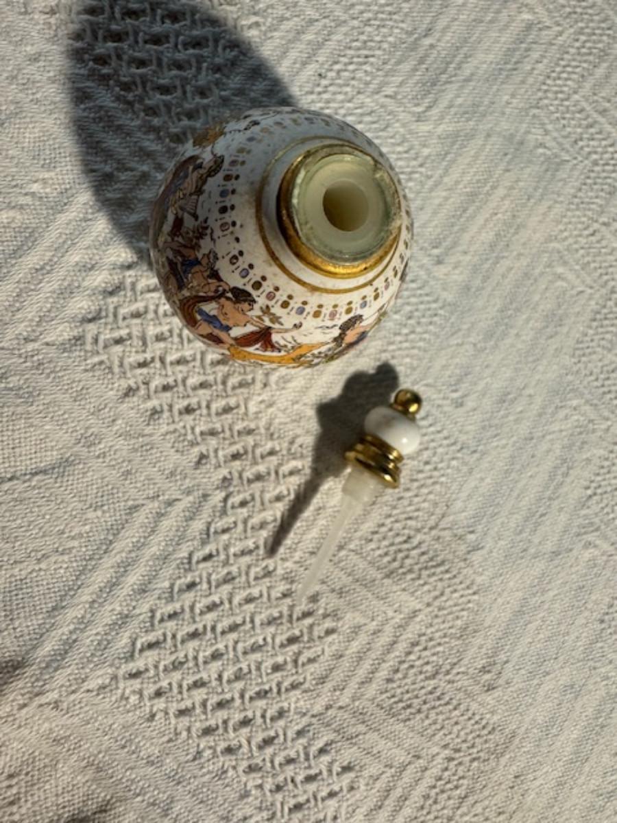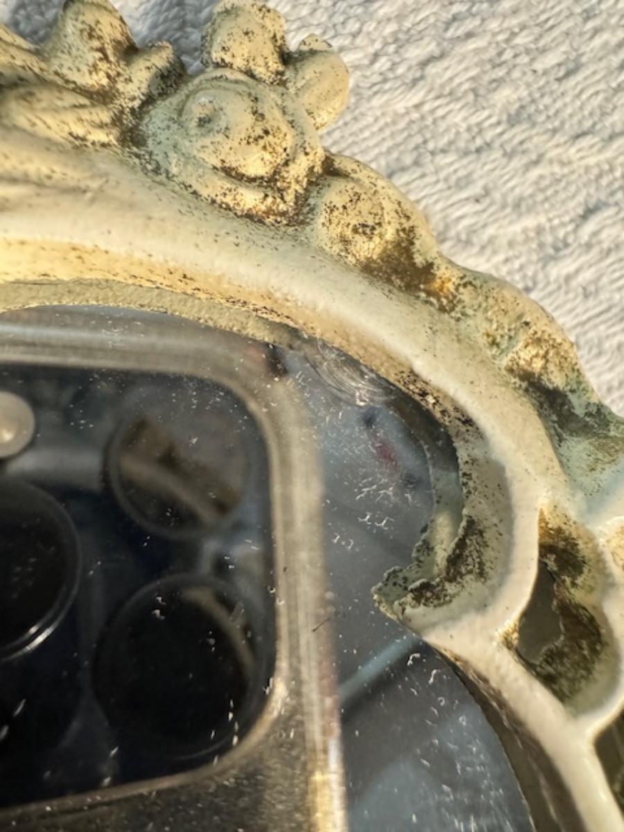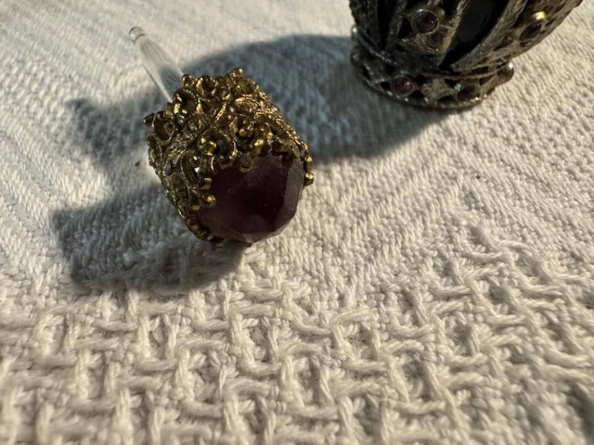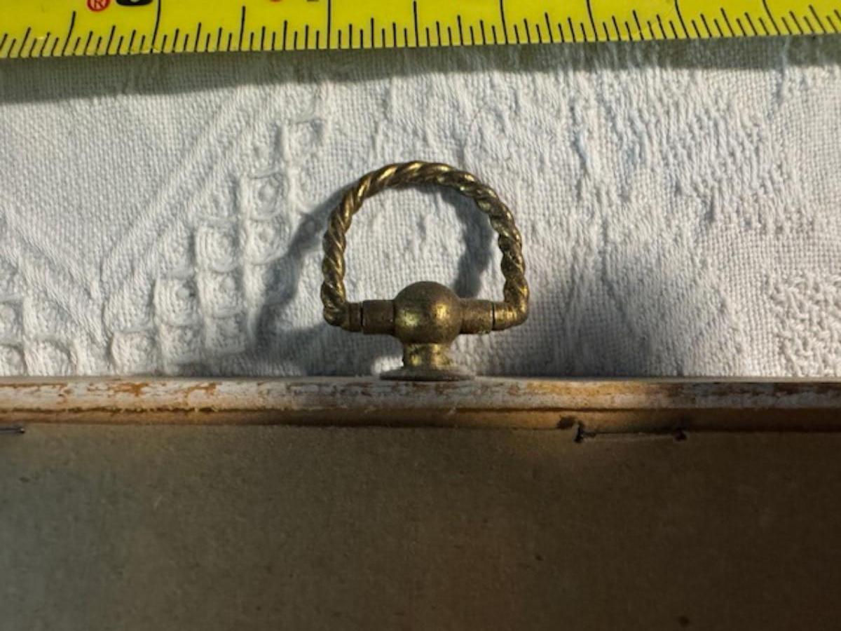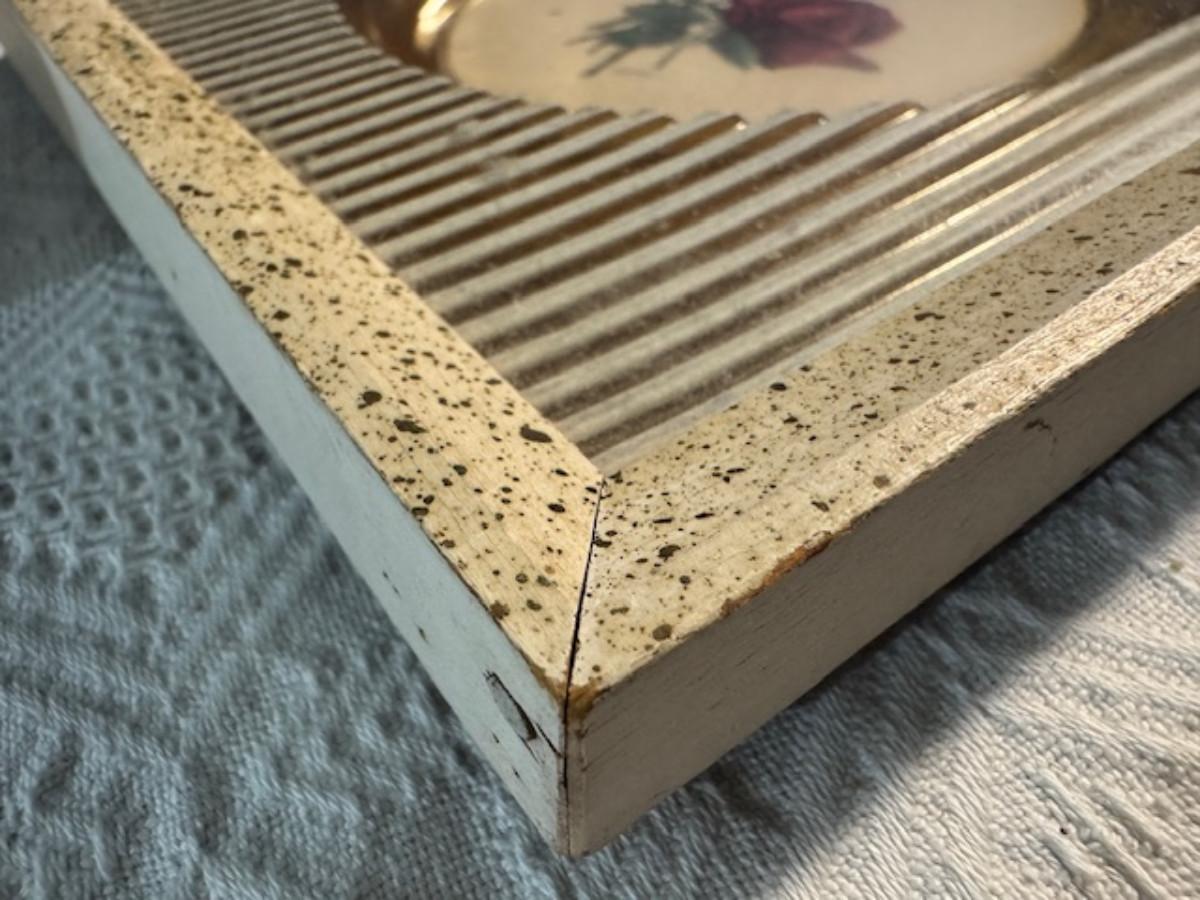 Silver tone box 2" x 4" x 2.5" with lining inside need good cleaning/polishing. Another silver tone box 1.5" x 3" x 3" as found no lining no visible markings. Luxor celluloid box 1.5" x 6 1/4" x 3 3/4". 2 framed flower pictures 8 3/4" x 7.5" x 1/2". Rollarama purse perfume. Perfume bottle hand made in Greece 2.5". Perfume bottle ornate Irice 2" missing some stones. Mirror 6 1/4" x 4 1/4" as is mirror - can be replaced metal frame can stand on its own.
