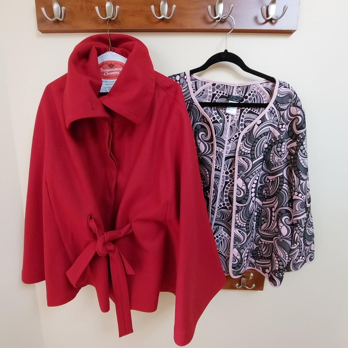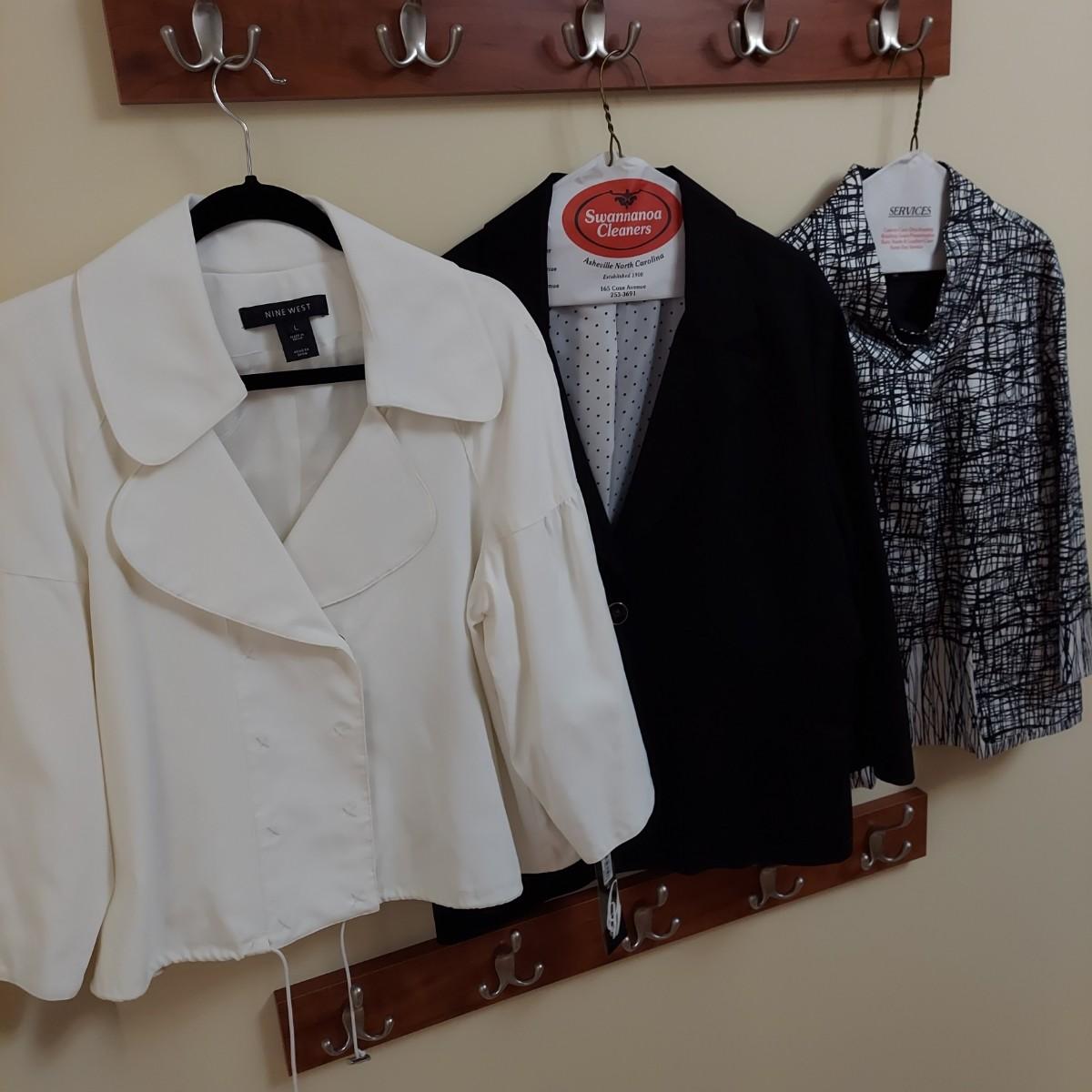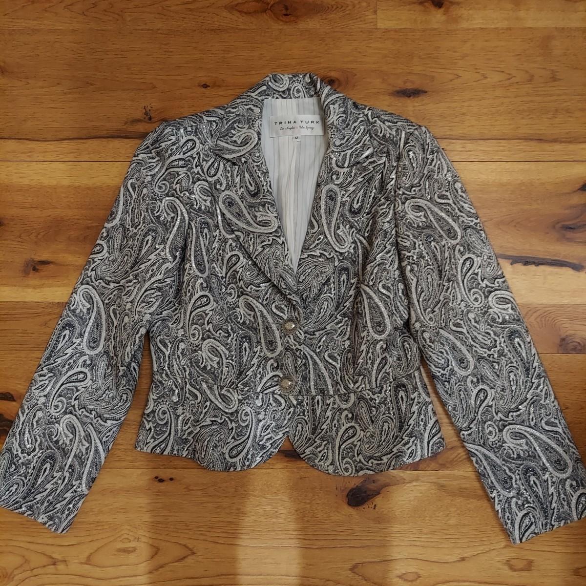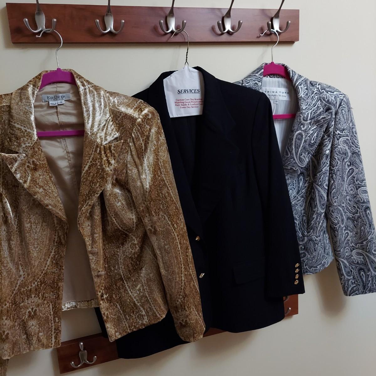 Lot of women's blazers and jackets. There are 10+ items. All pieces are mostly size large. Some of the brands included are Trina Turk, Austin Reed, Nine West, Chicos and Kay Unger. Shipping available.