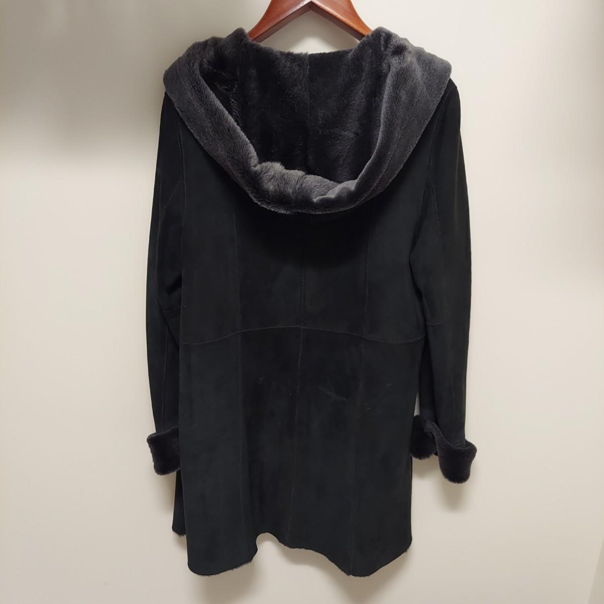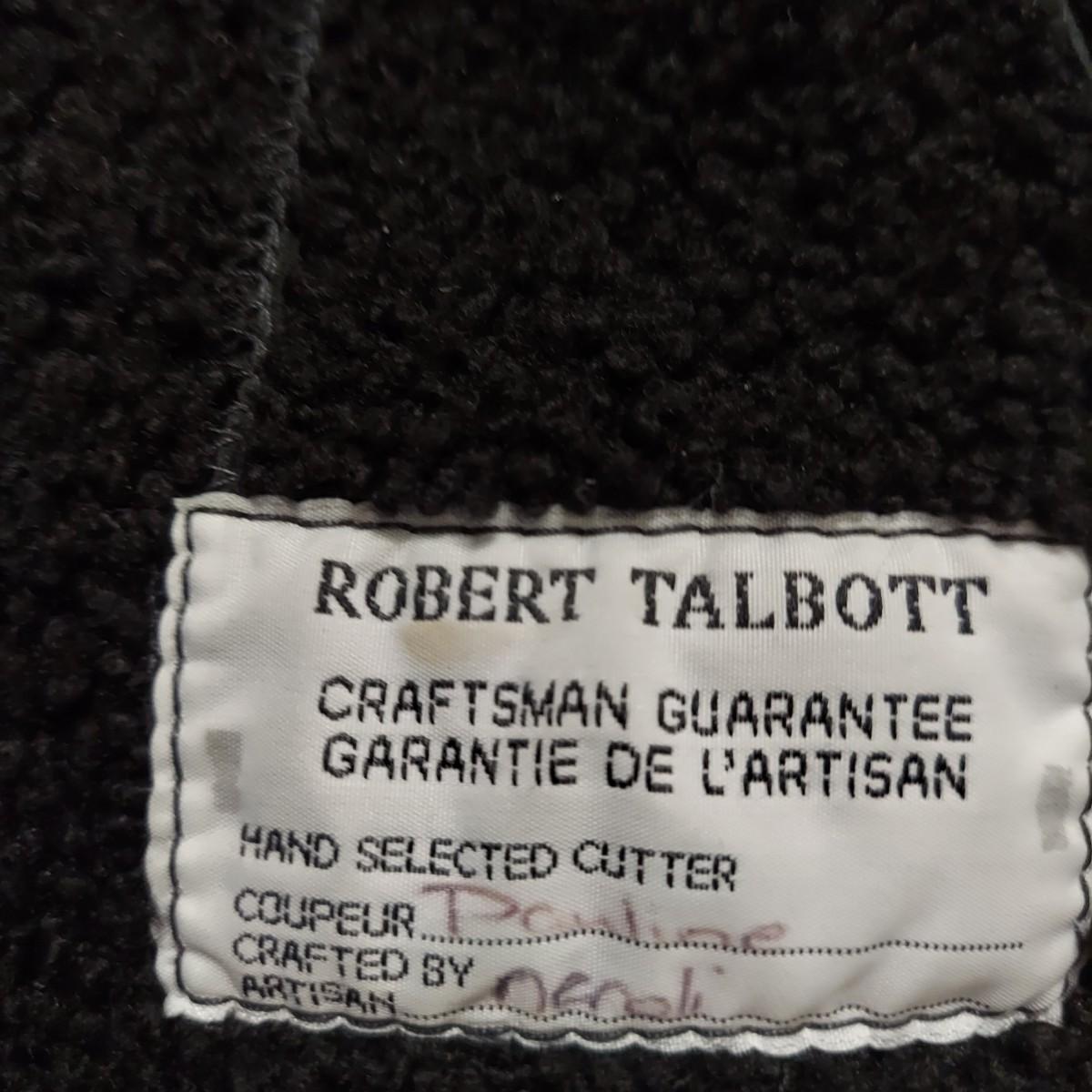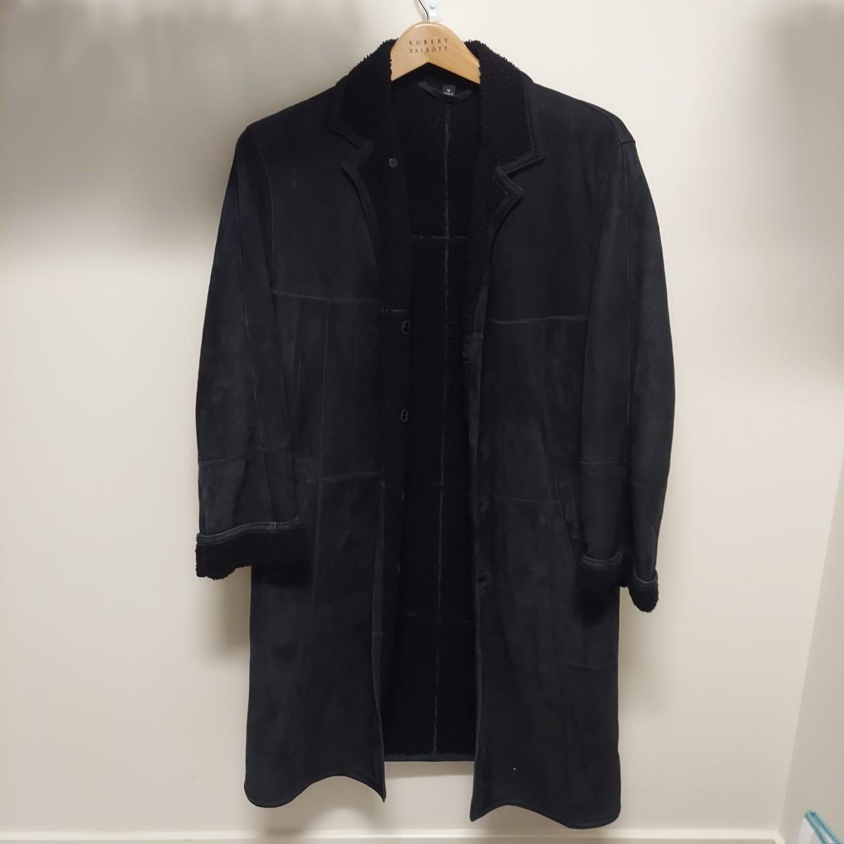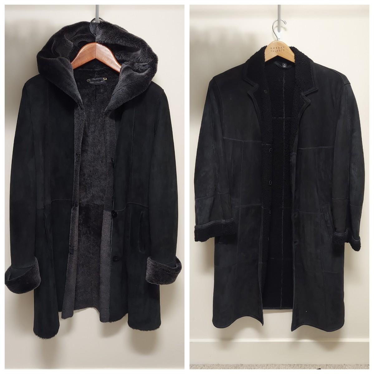 Two black coats with soft leather like calf skin. Neither says the material type but both appear to have a leather outer with shearling lining. The Robert Talbot coat is a medium and was made in New Zealand. The other coat is a size small. It does not have a brand label but was made in Macedonia and is marked genuine shearling. Please see photos for details. Shipping available