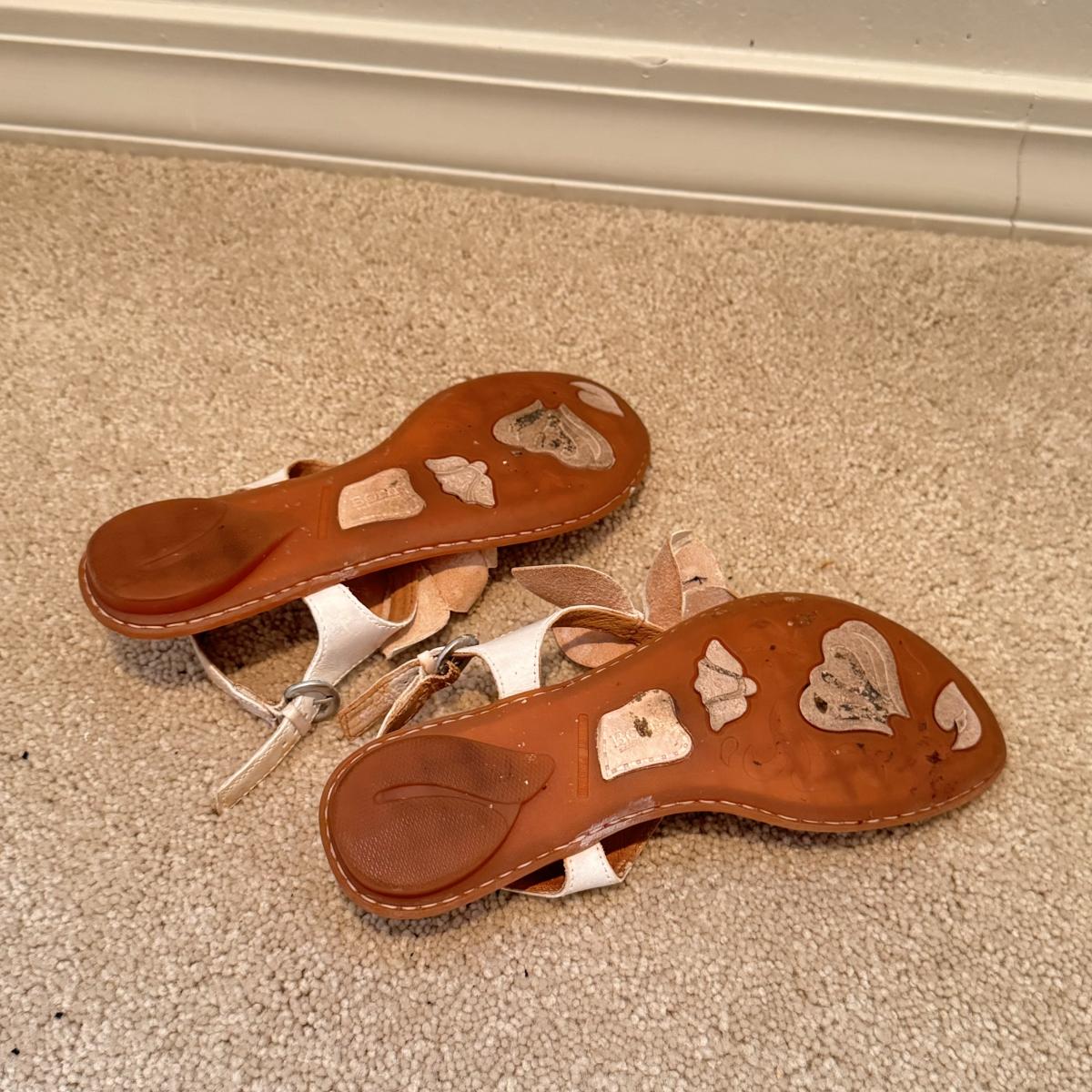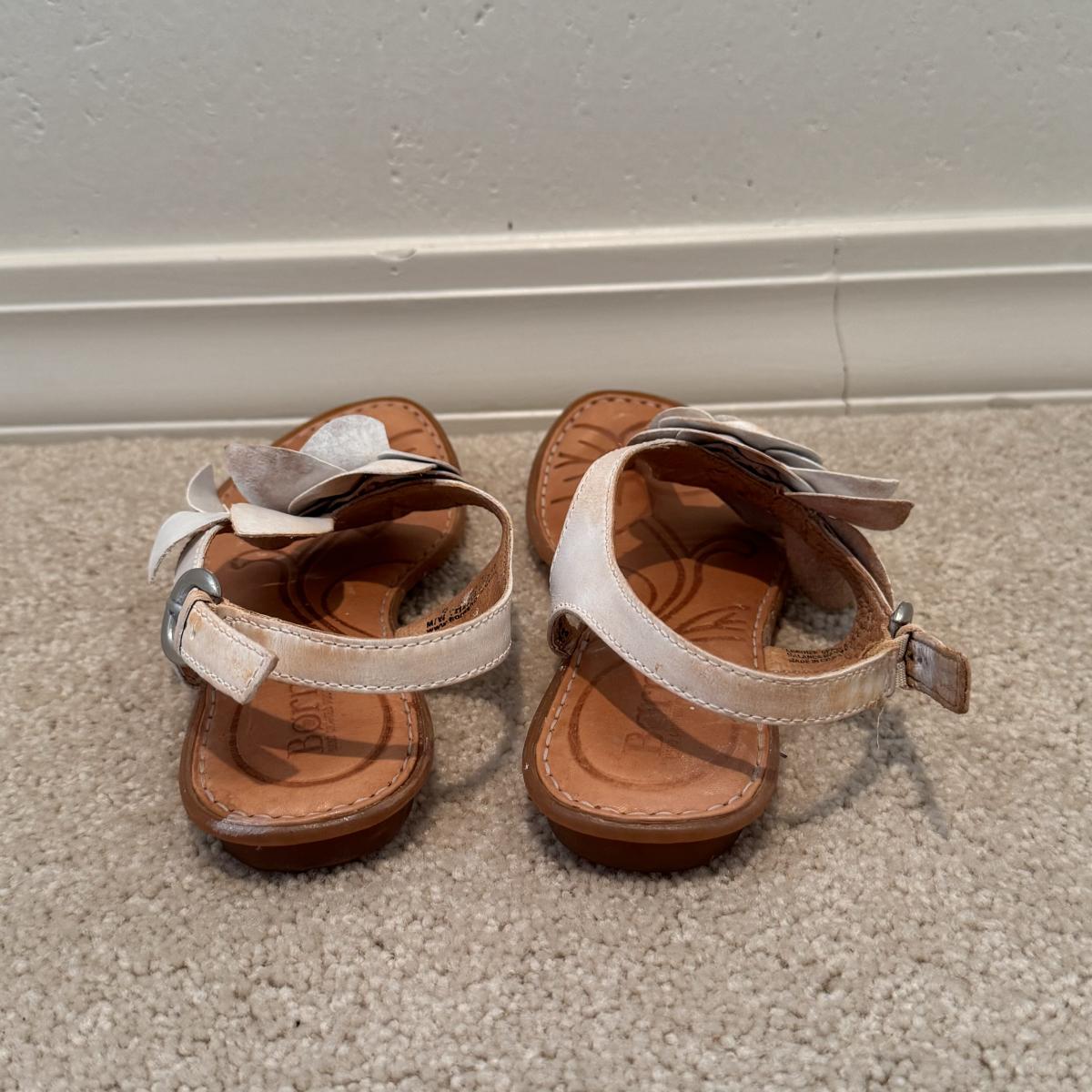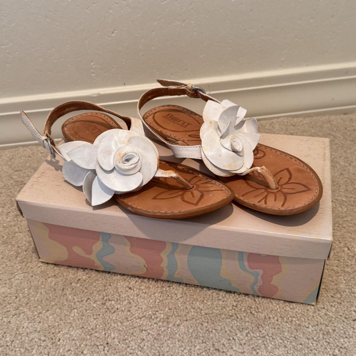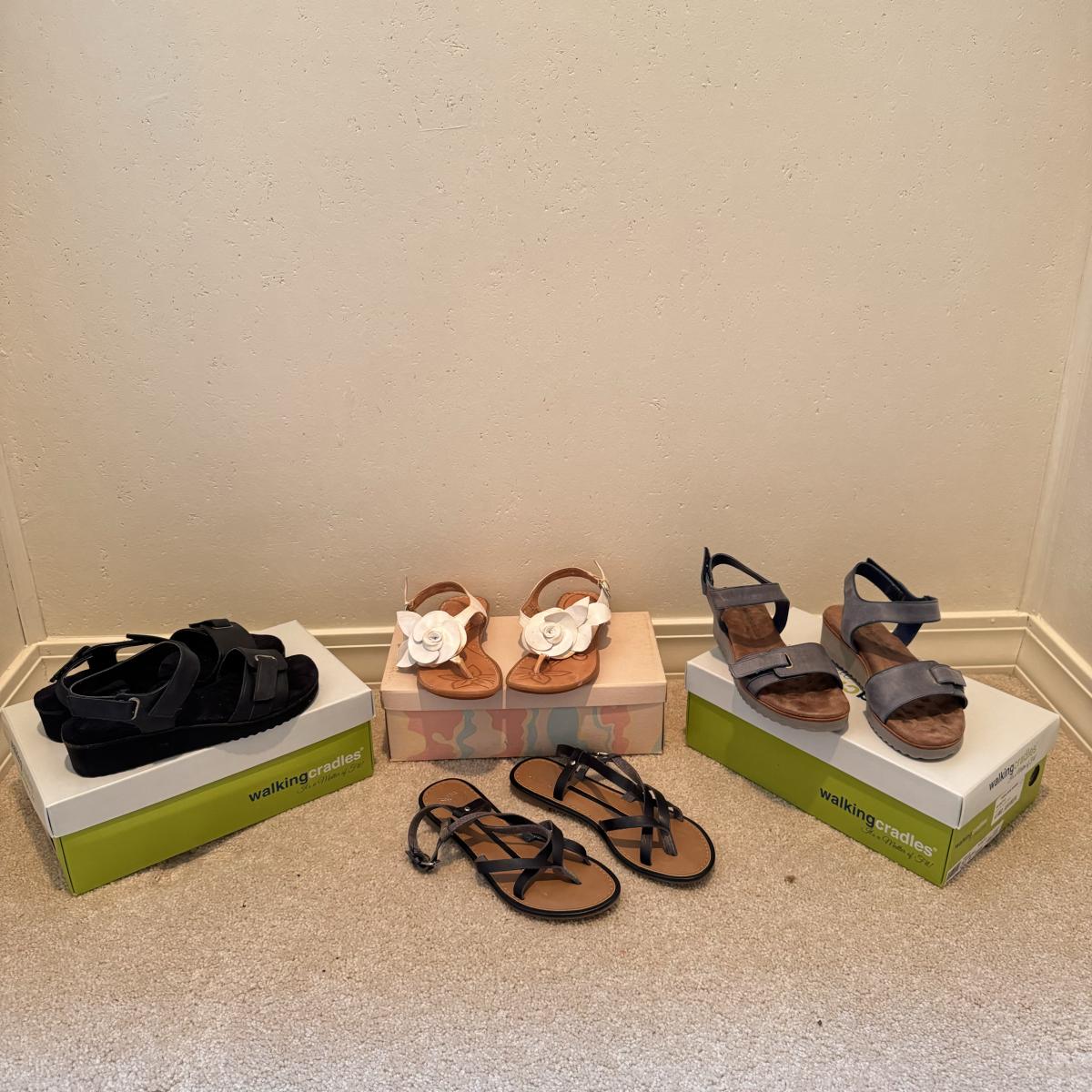 This lot includes four pairs of Women’s sandals, gently used. The two pairs of shoes pictured with the green shoe boxes are from the brand Walking Cradles. They are both size 6.5 and are made of leather with velcro straps. The white flower pair are from the brand Born. They are a size 6 and made of leather. The last pair shown without a box are from the brand New Directions. They are made of leather and are a size 6.5. Shipping available.