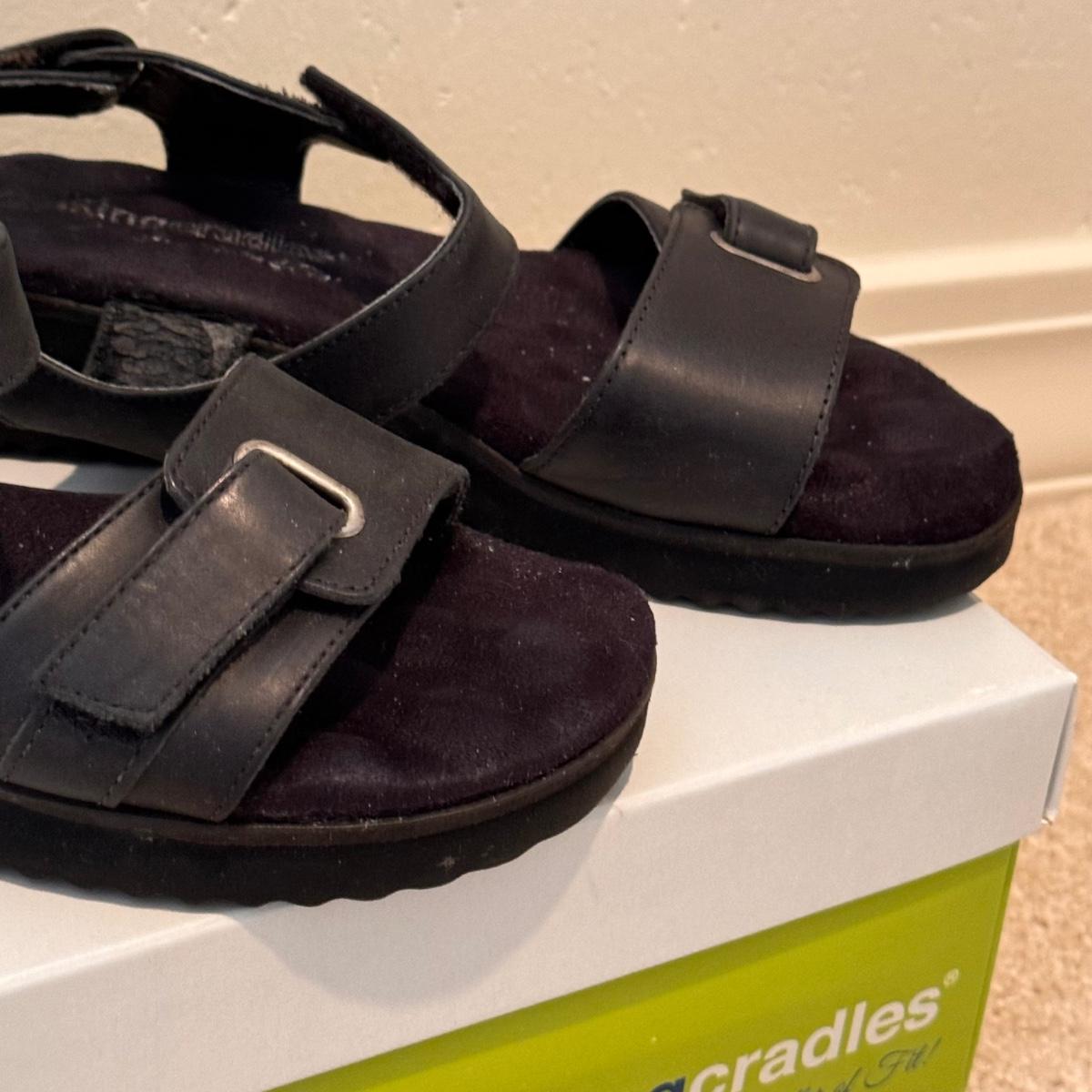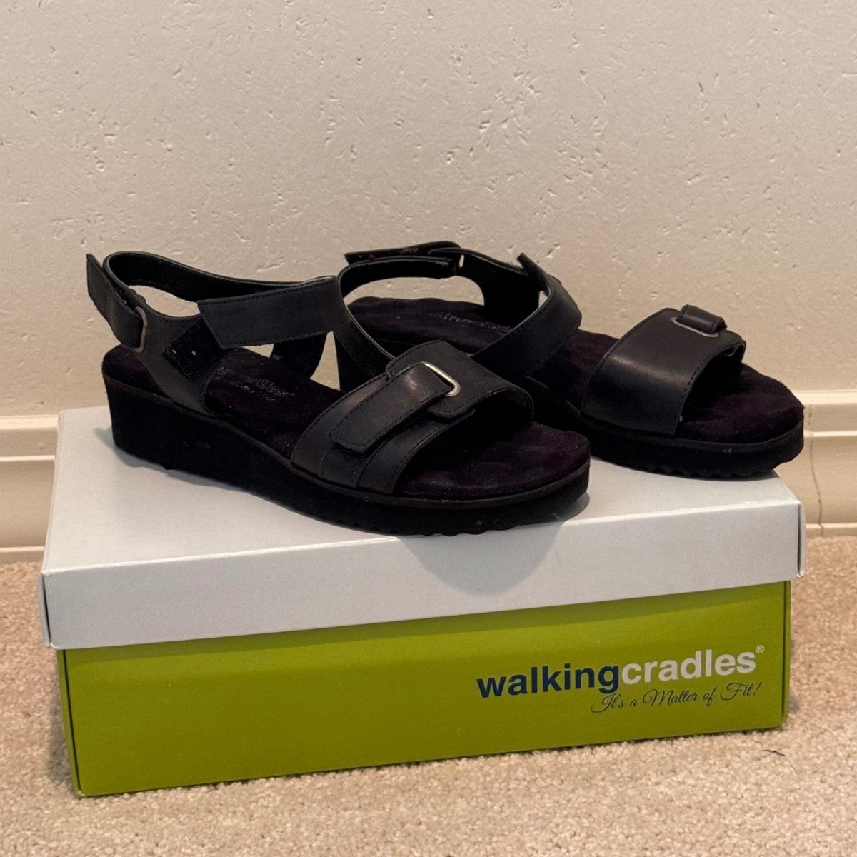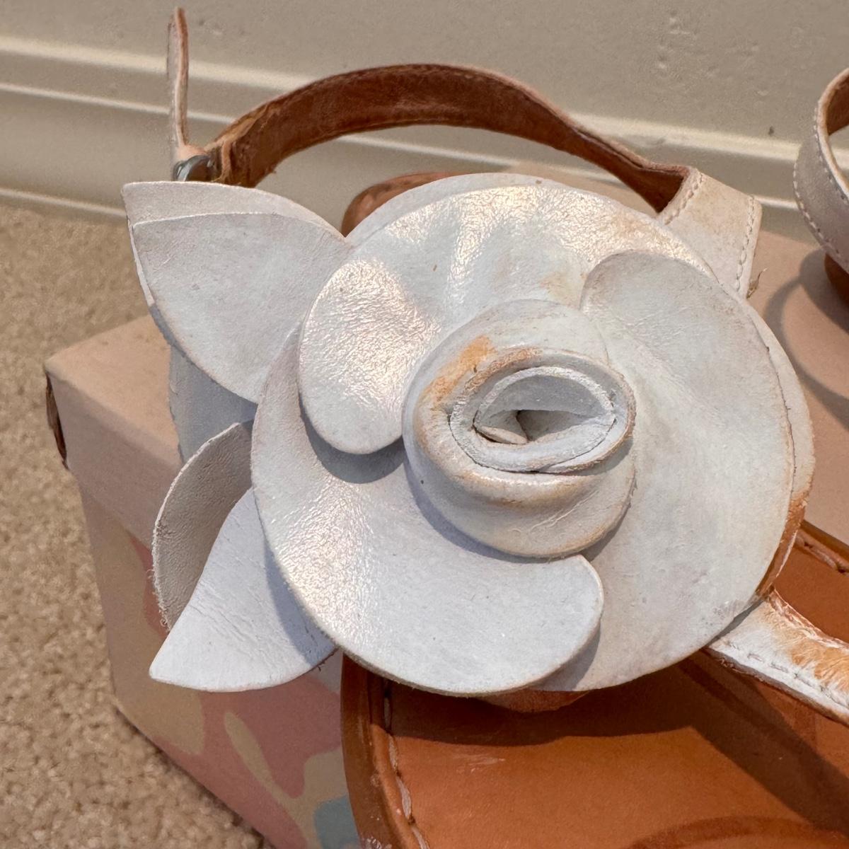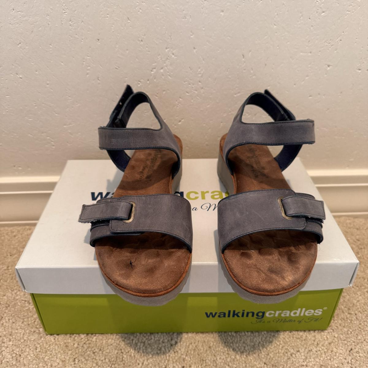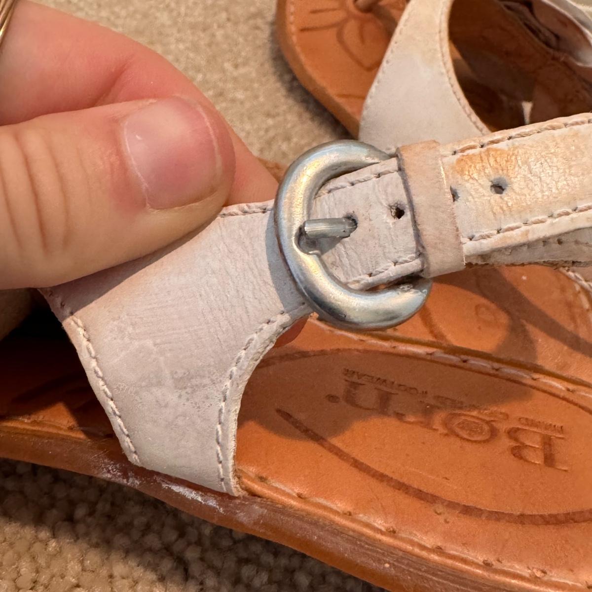 This lot includes four pairs of Women’s sandals, gently used. The two pairs of shoes pictured with the green shoe boxes are from the brand Walking Cradles. They are both size 6.5 and are made of leather with velcro straps. The white flower pair are from the brand Born. They are a size 6 and made of leather. The last pair shown without a box are from the brand New Directions. They are made of leather and are a size 6.5. Shipping available.
