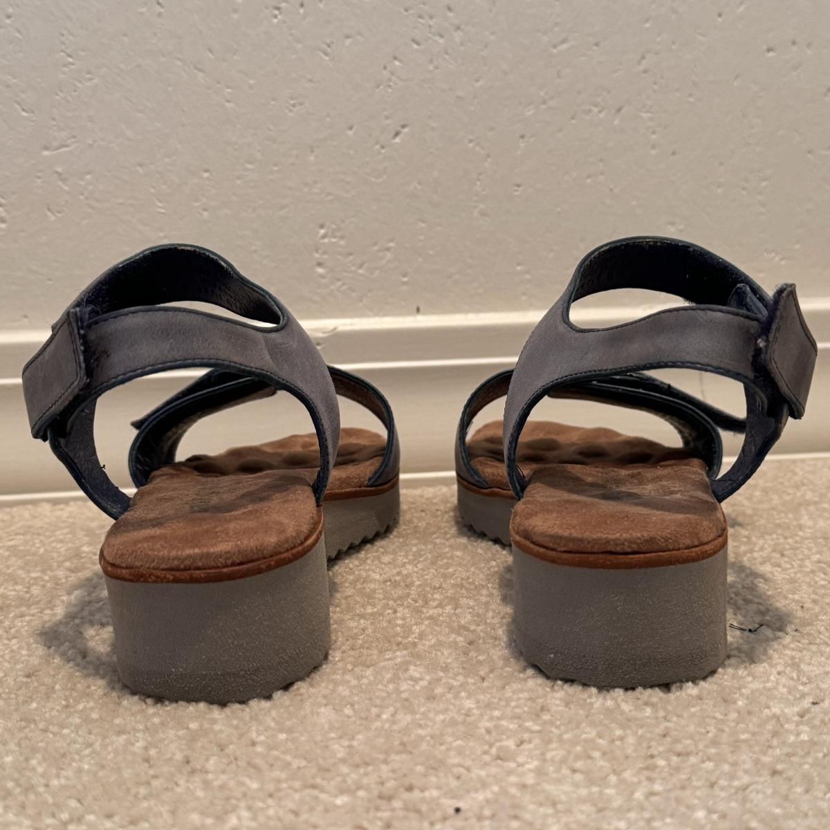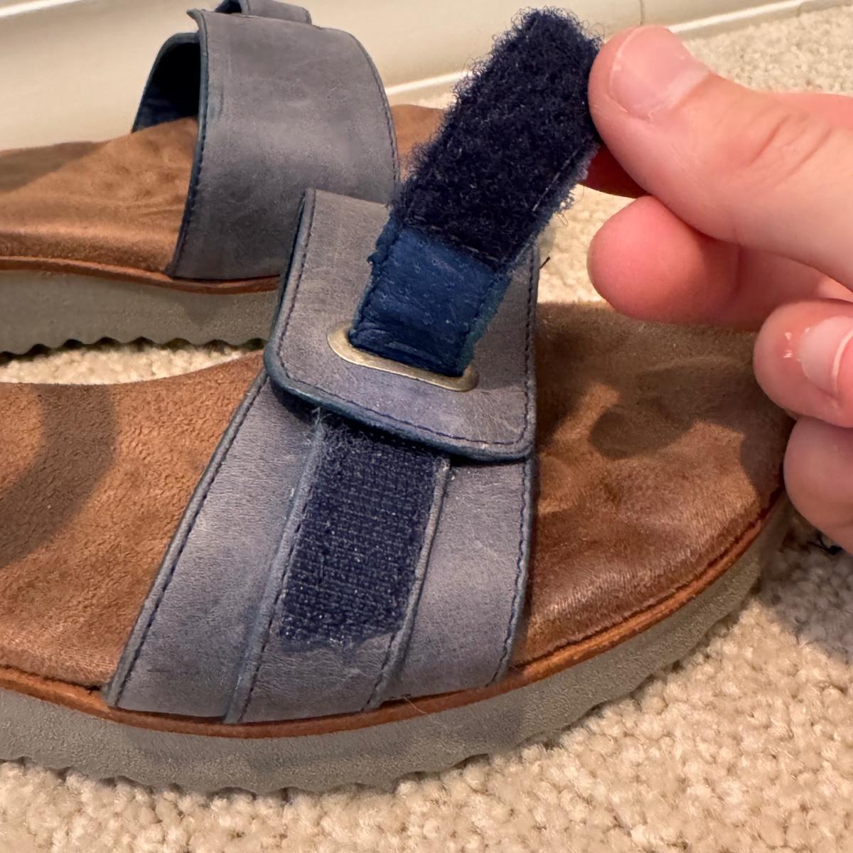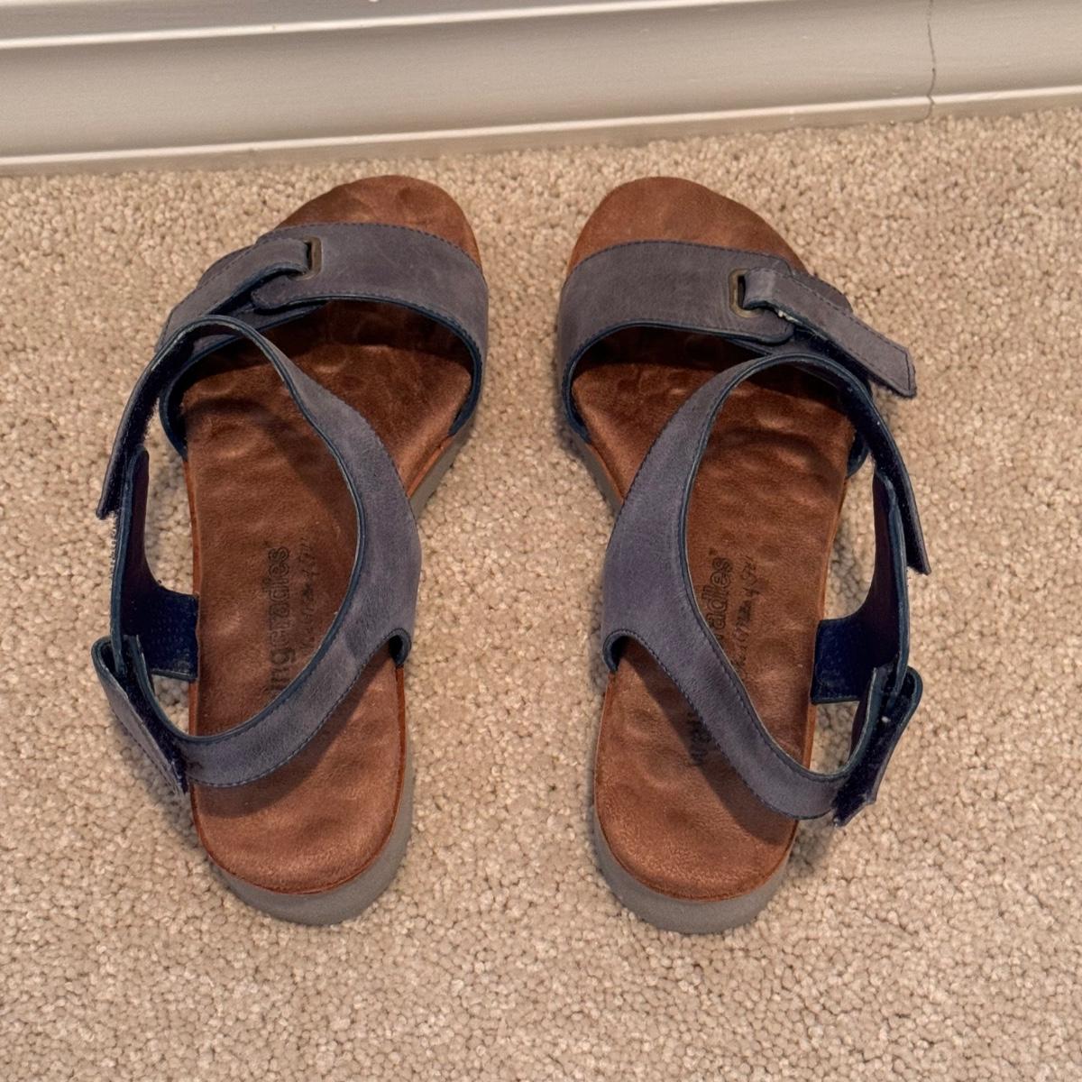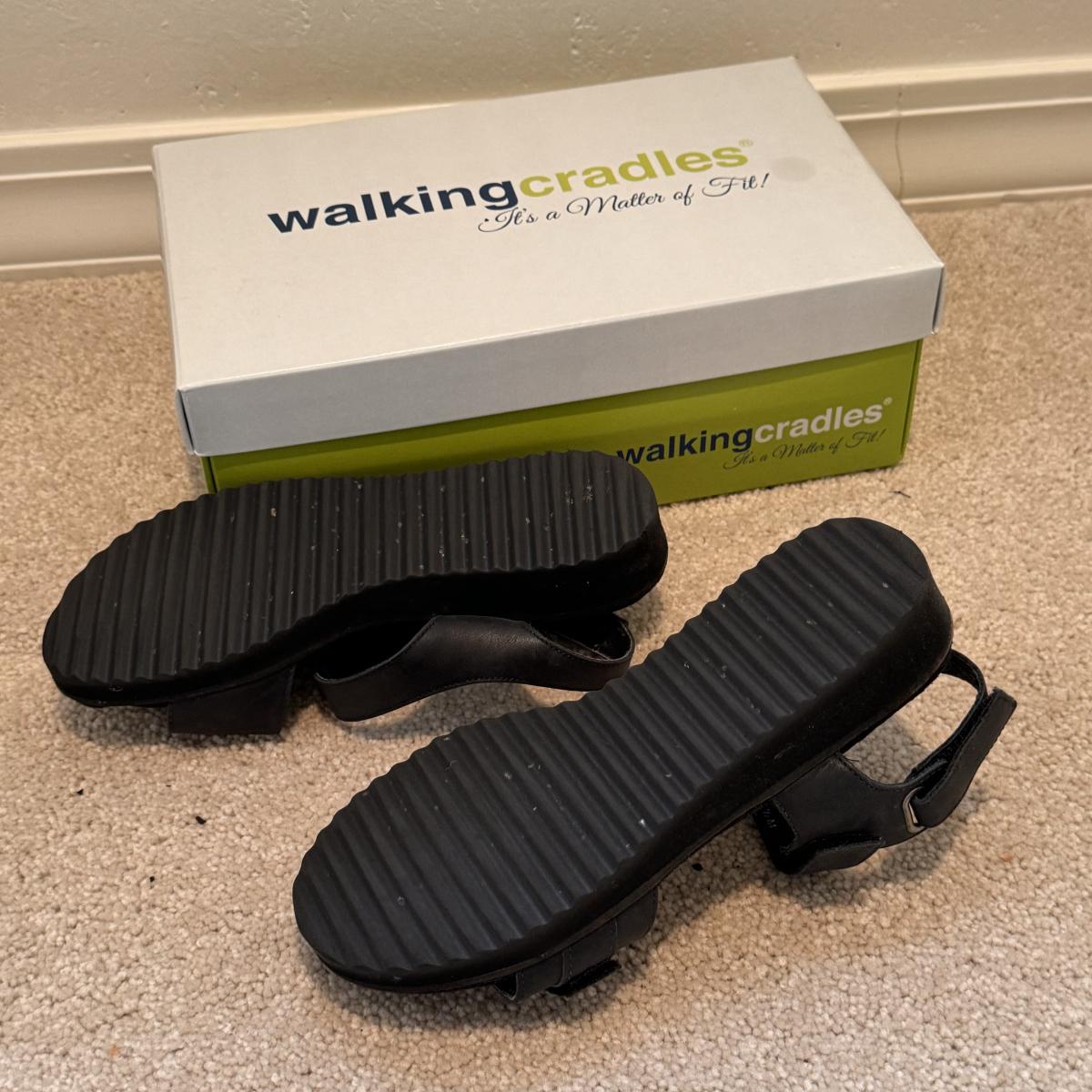 This lot includes four pairs of Women’s sandals, gently used. The two pairs of shoes pictured with the green shoe boxes are from the brand Walking Cradles. They are both size 6.5 and are made of leather with velcro straps. The white flower pair are from the brand Born. They are a size 6 and made of leather. The last pair shown without a box are from the brand New Directions. They are made of leather and are a size 6.5. Shipping available.