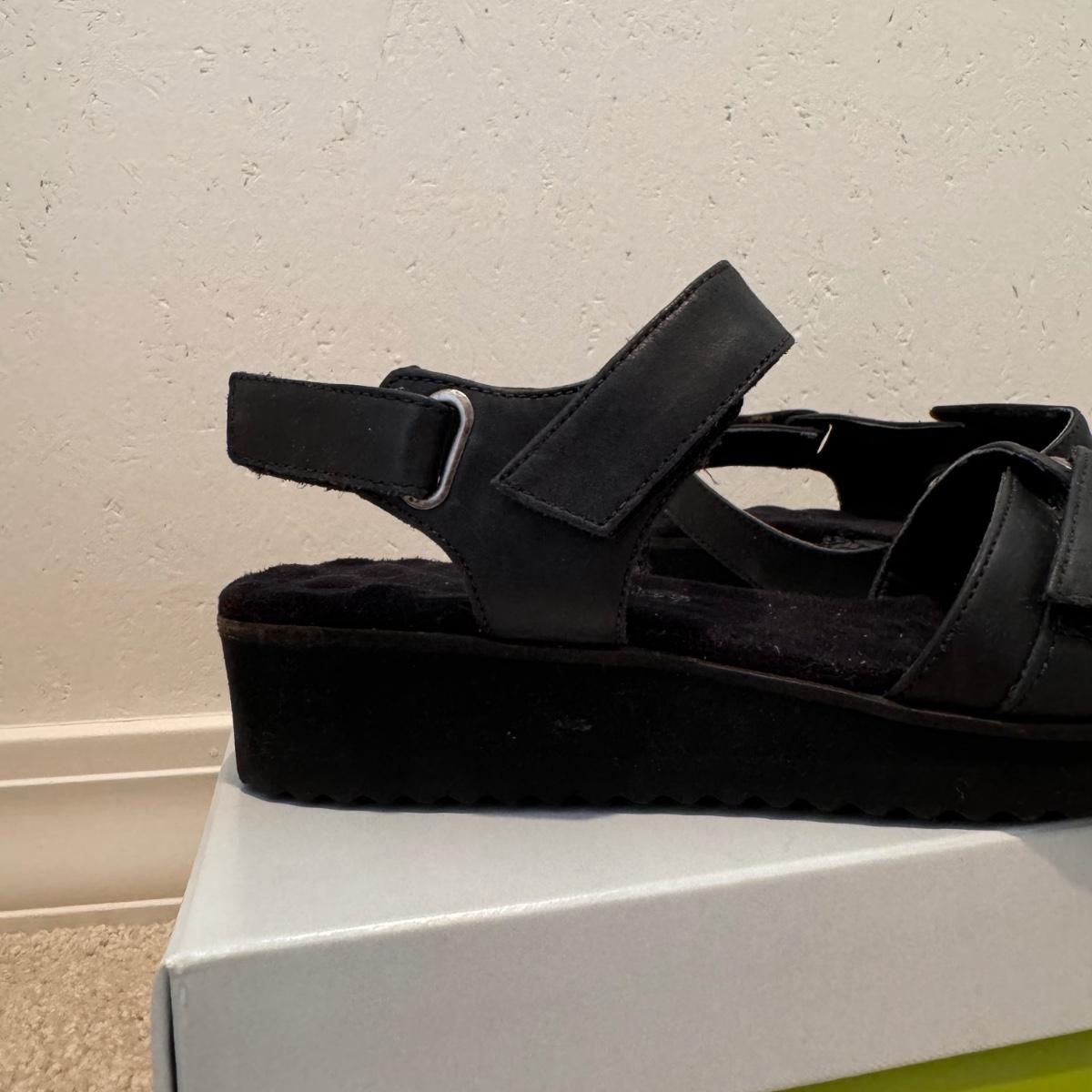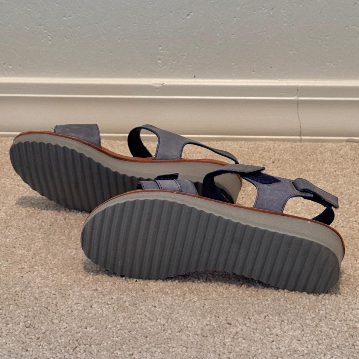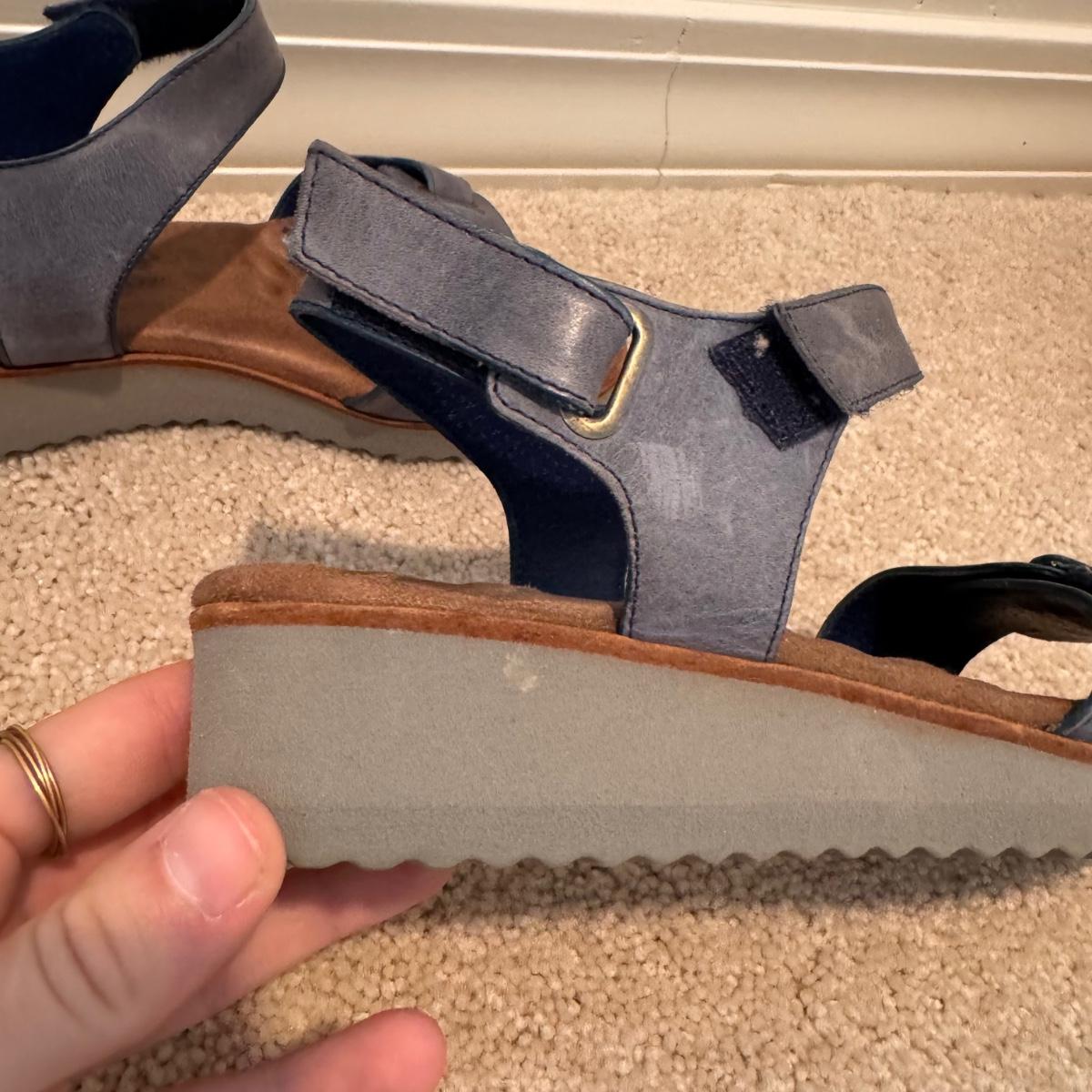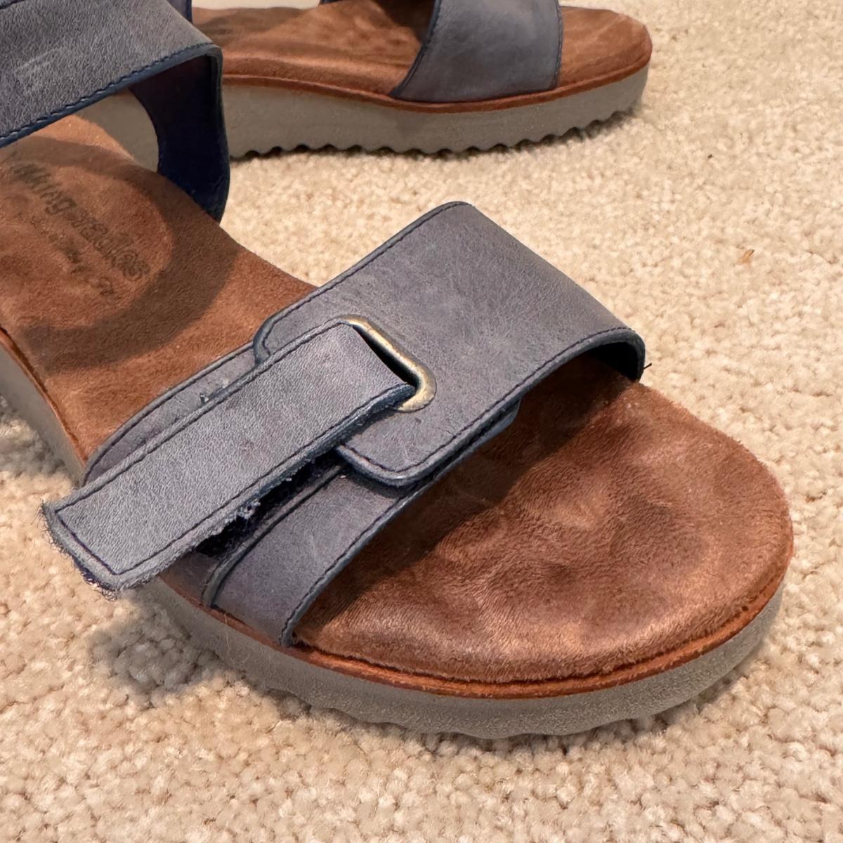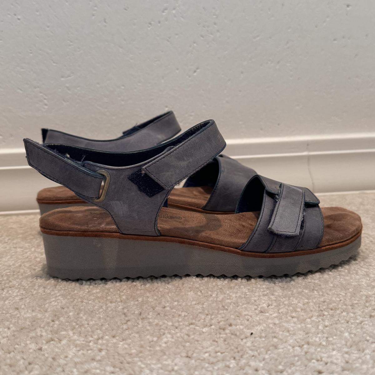 This lot includes four pairs of Women’s sandals, gently used. The two pairs of shoes pictured with the green shoe boxes are from the brand Walking Cradles. They are both size 6.5 and are made of leather with velcro straps. The white flower pair are from the brand Born. They are a size 6 and made of leather. The last pair shown without a box are from the brand New Directions. They are made of leather and are a size 6.5. Shipping available.