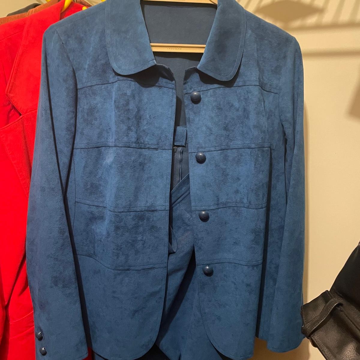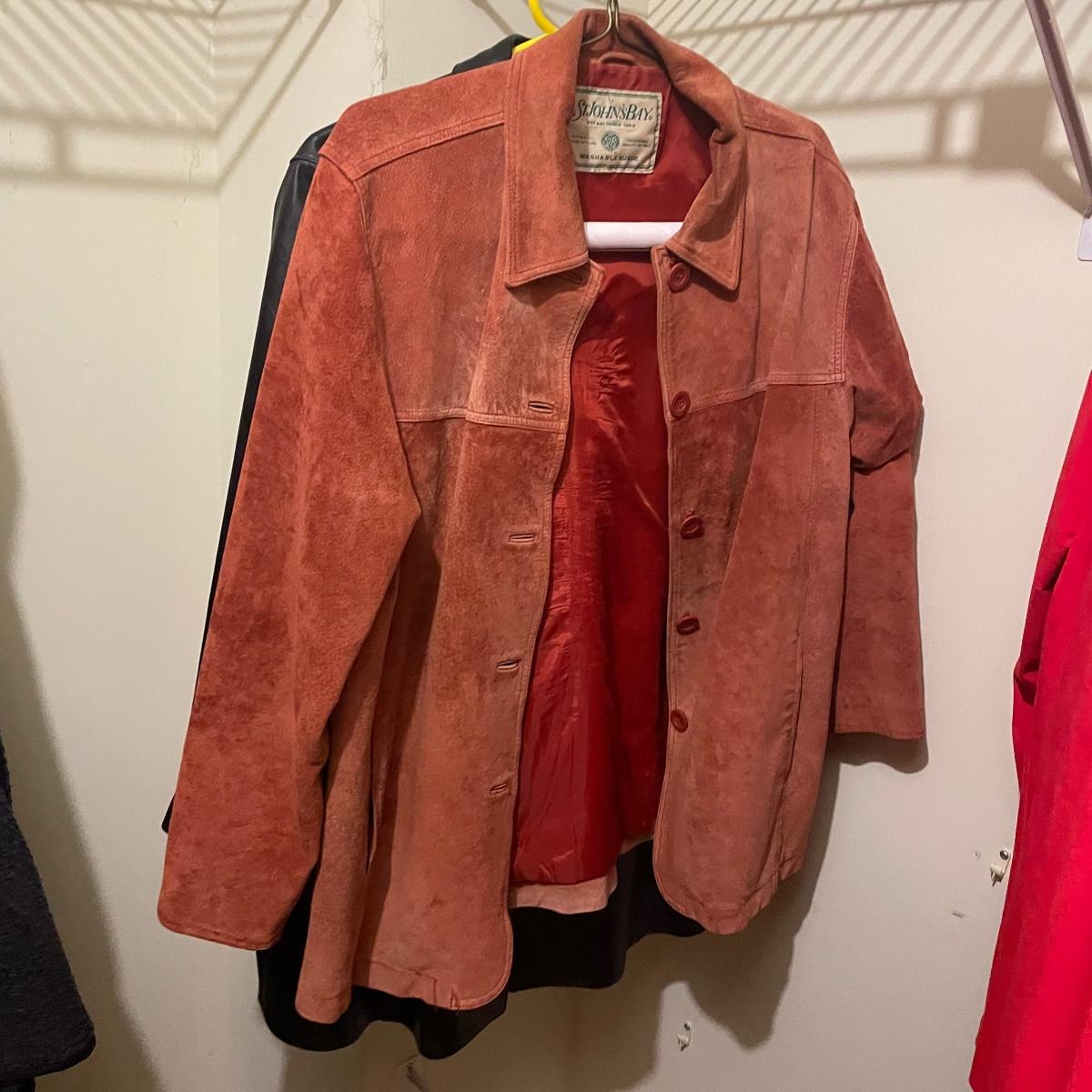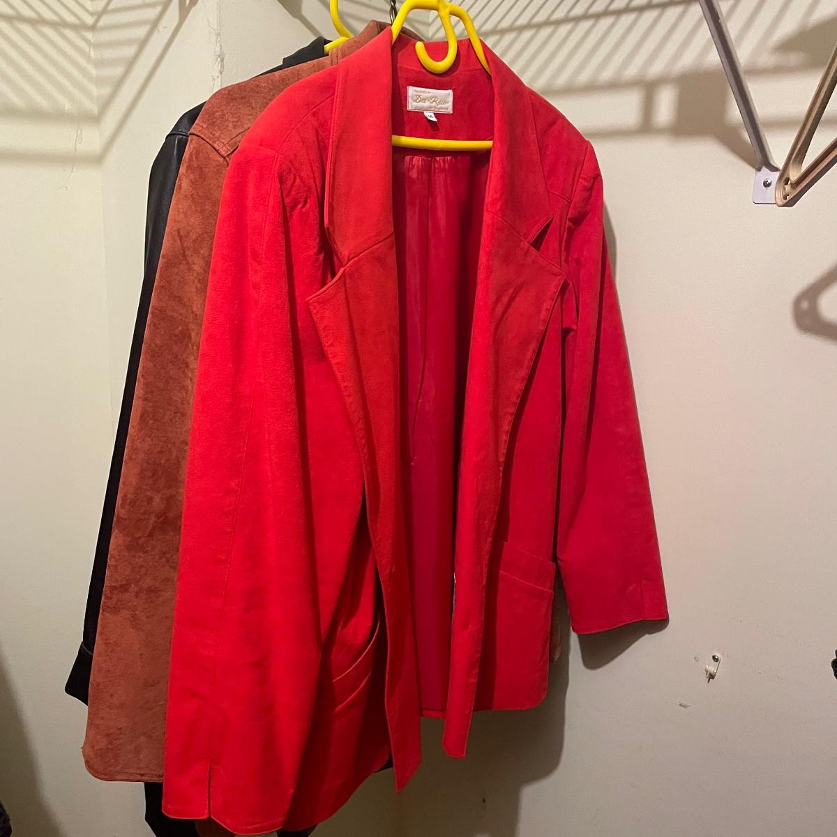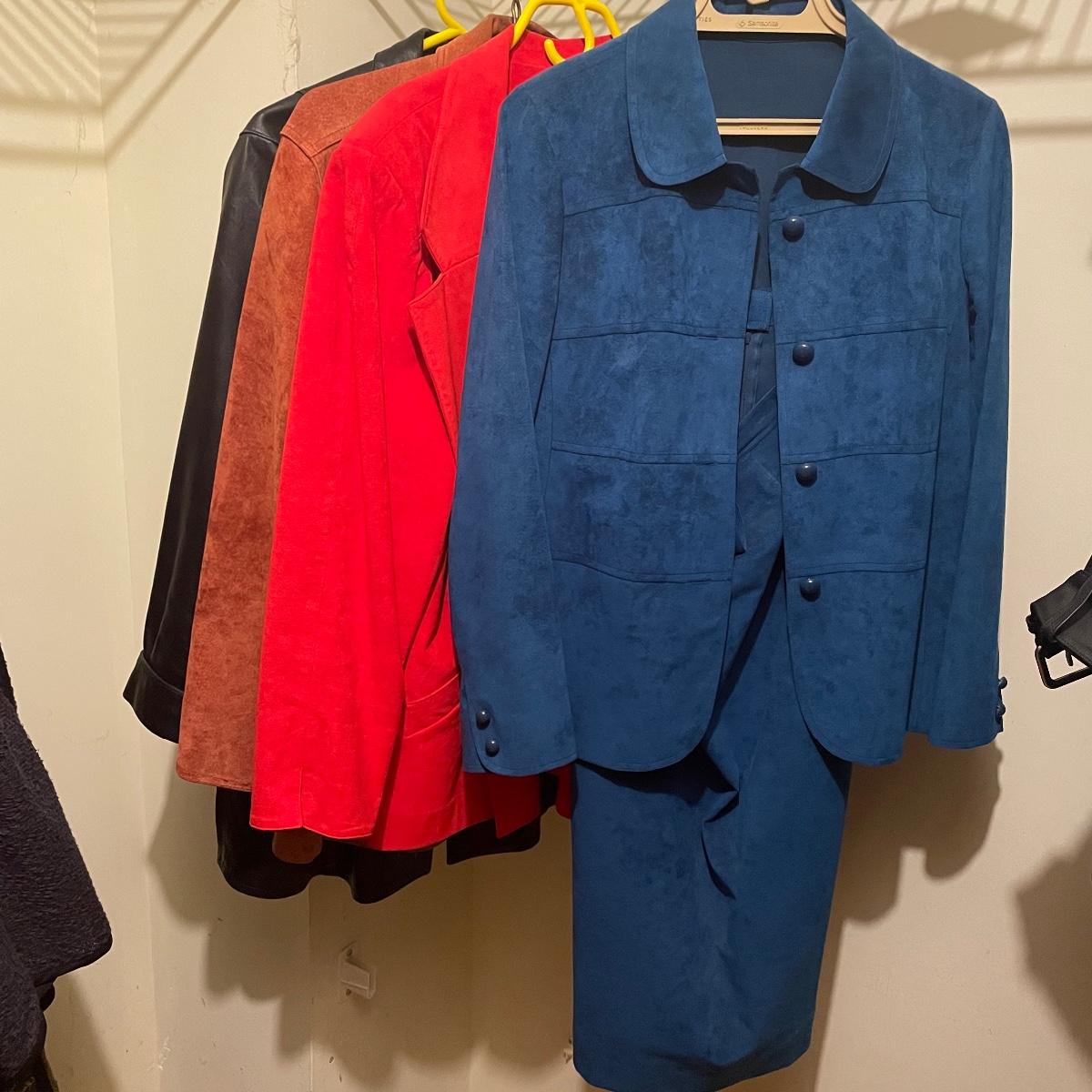 A nice selection of leather and suede items here. The red jacket is size 14 and although the other jackets have no size labels they all look similar in size to the 14 with the exception of the blue suede jacket and skirt which are smaller (possibly size 10-12), see images for measurements and note the hem had come loose and brown tape used to keep it in place.