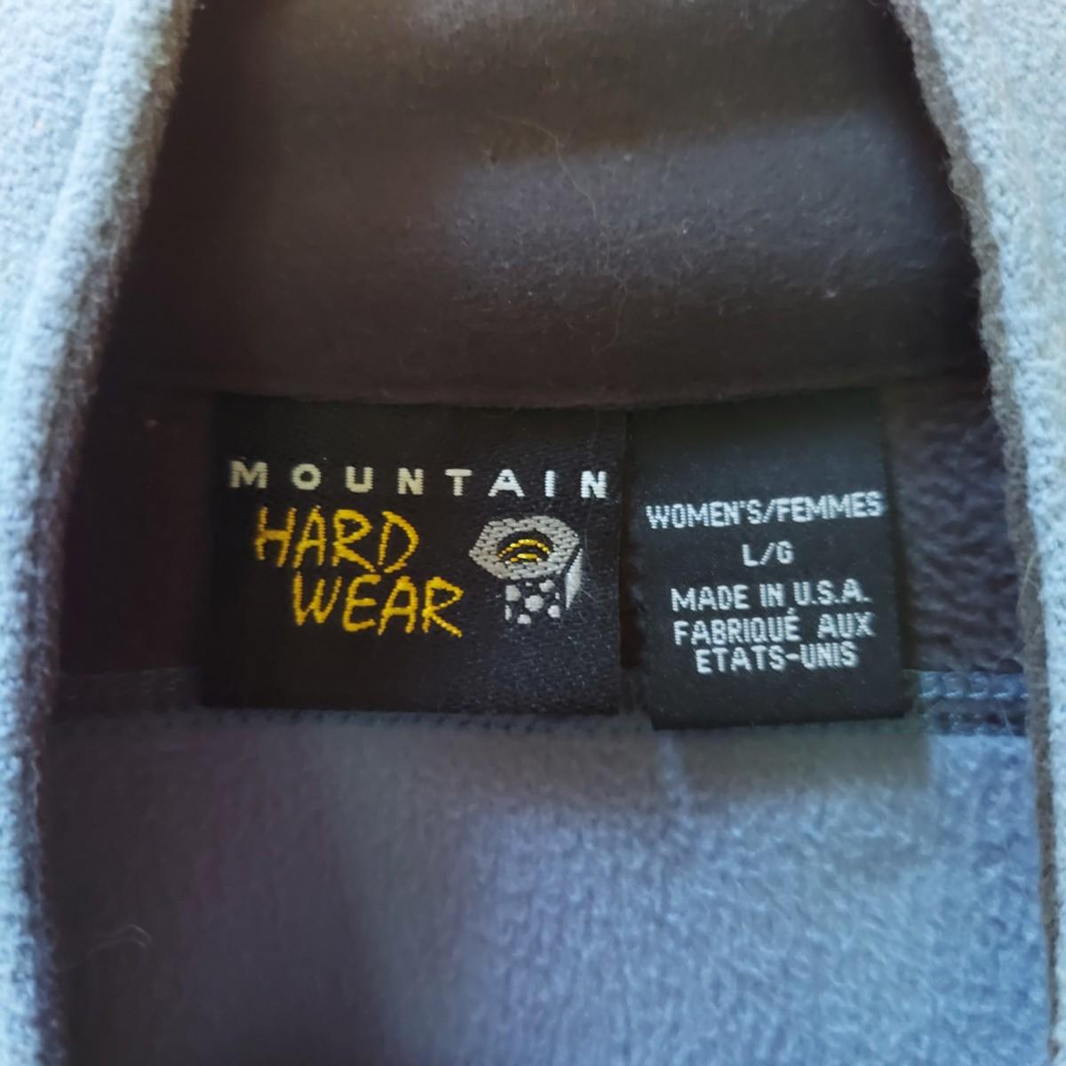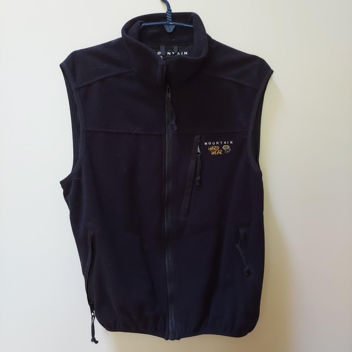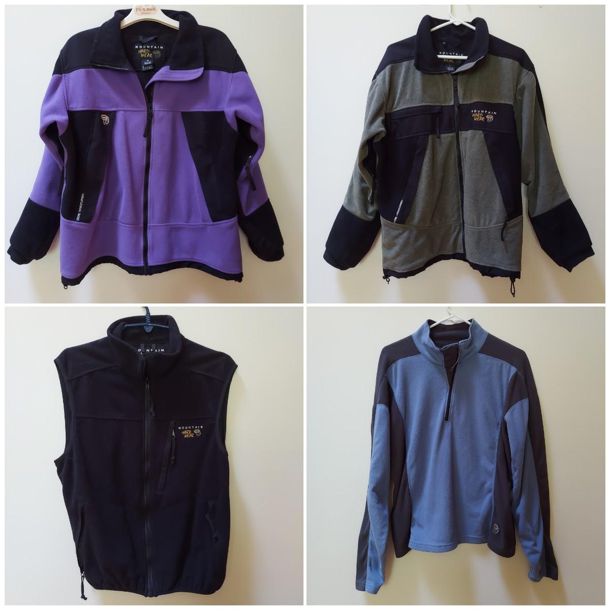 Four pieces of Mountain Hardware clothing in size Large, with one item being size M. Lot includes two fleece jackets, a fleece vest and a fleece pullover. Some surface debris like cat hair on some items. Please see photos for details. Shipping available