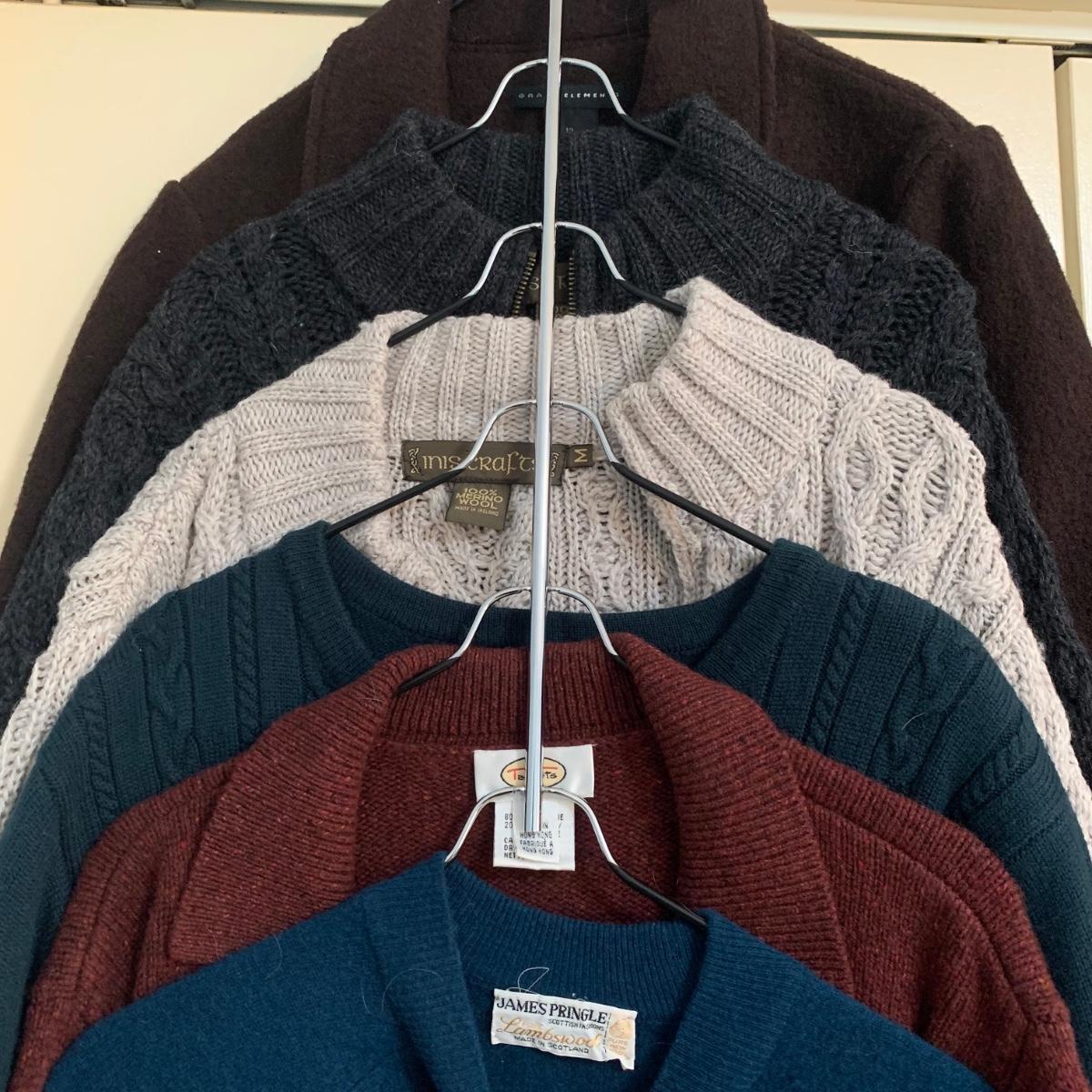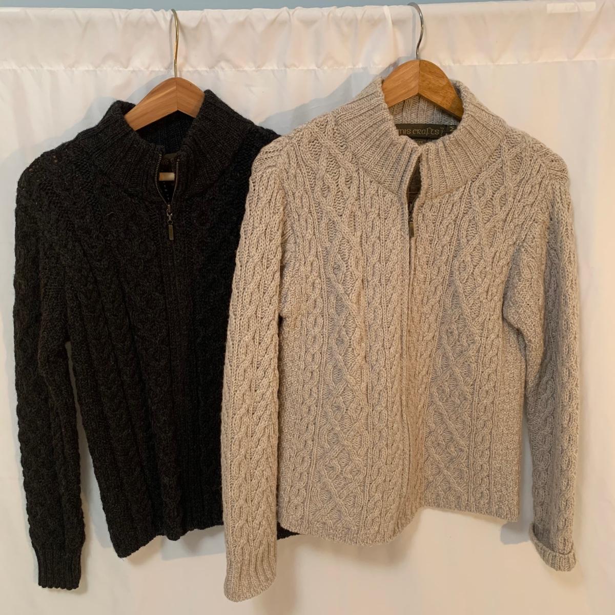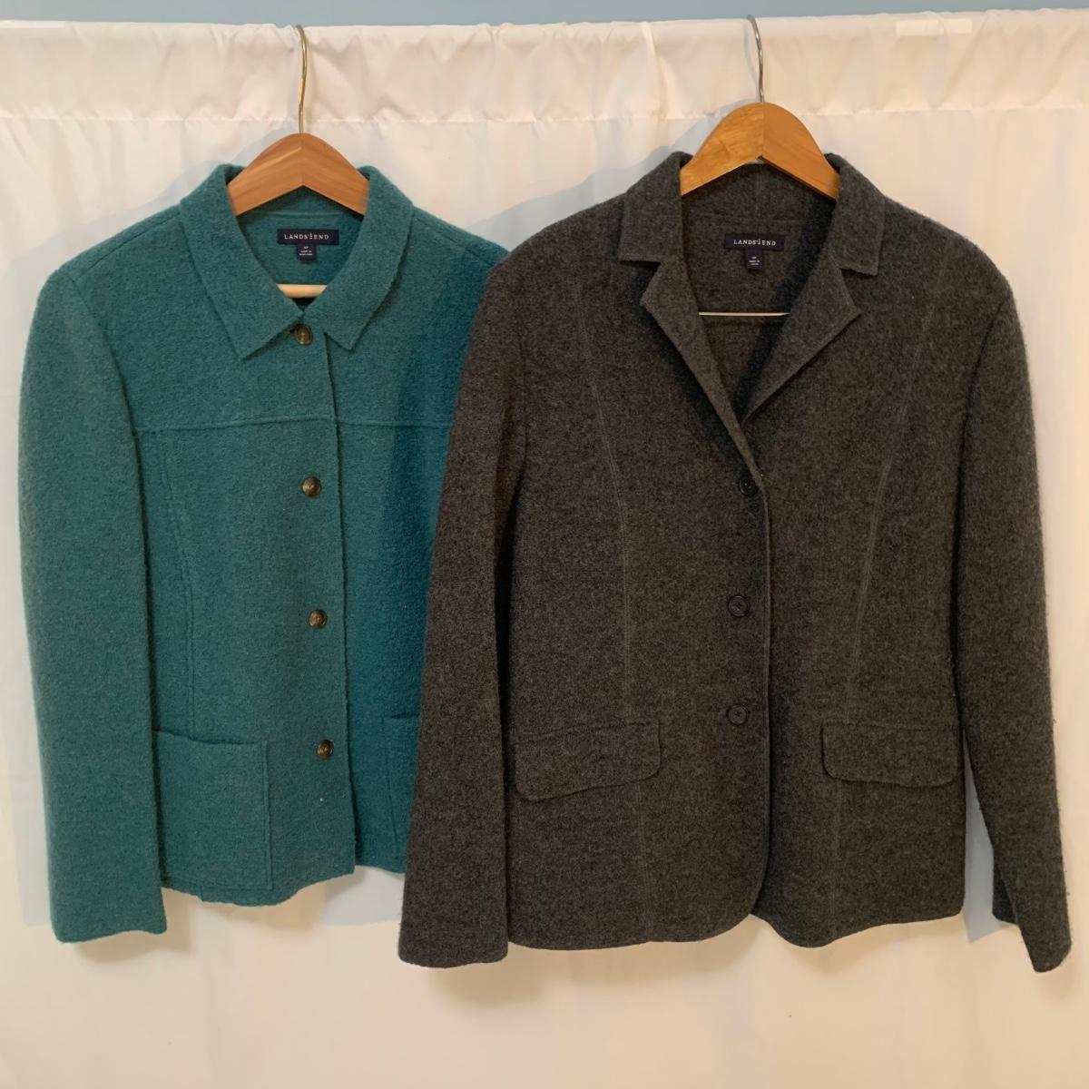 This lot includes two pant suits, one Pendleton Wool robe, and twelve other wool tops. Wool top brands include Pendleton, Norm Thompson, Inis Crafts, Flen Eagles of Scotland, and more! All items are in good condition and sizes range from medium to large. Pant suit sizes are 12P.