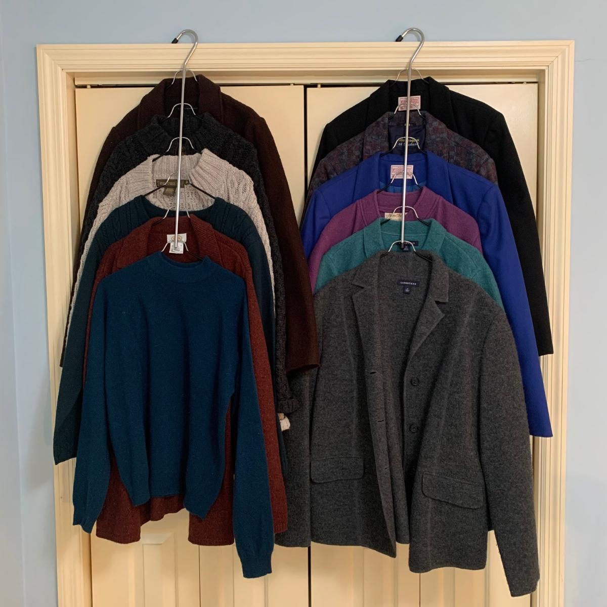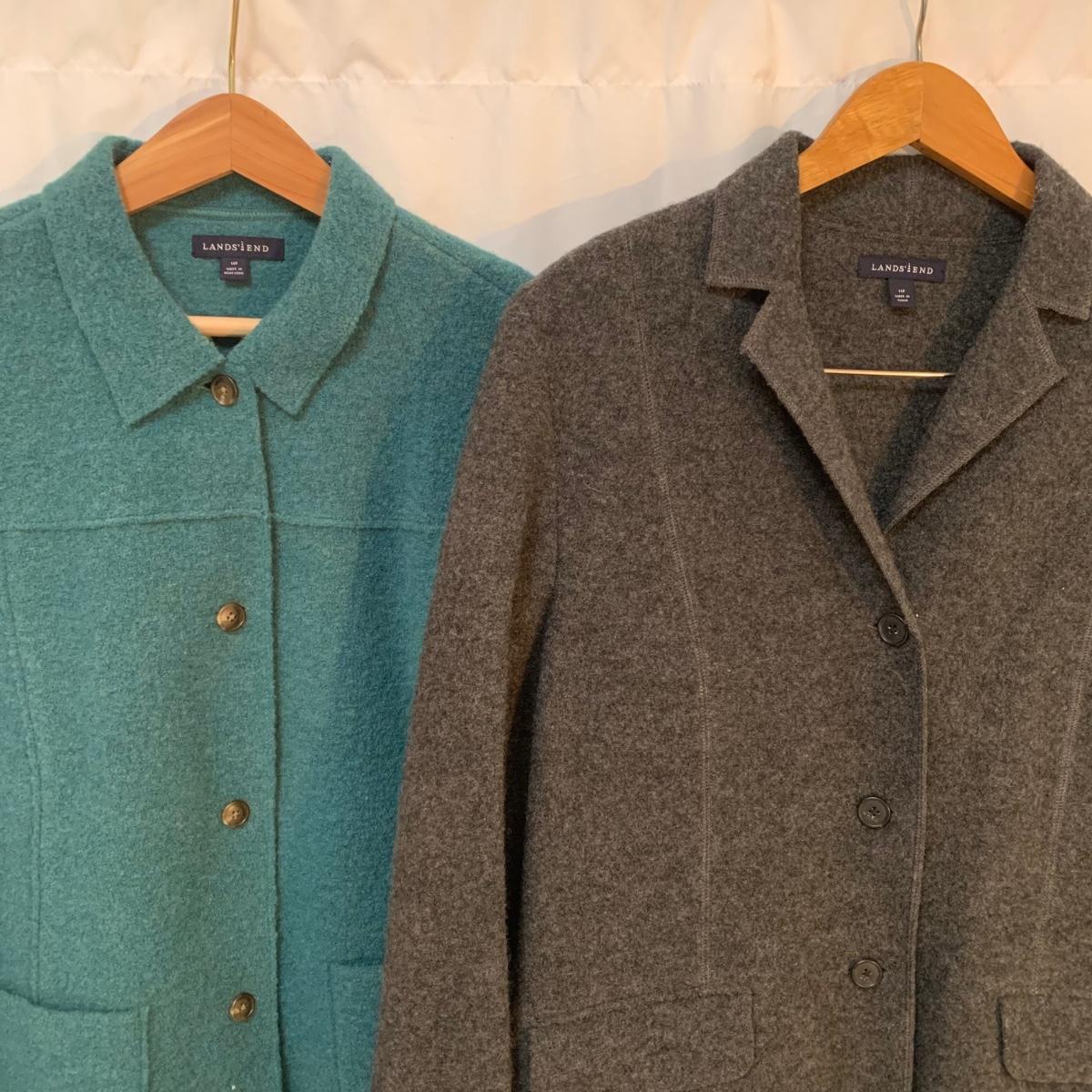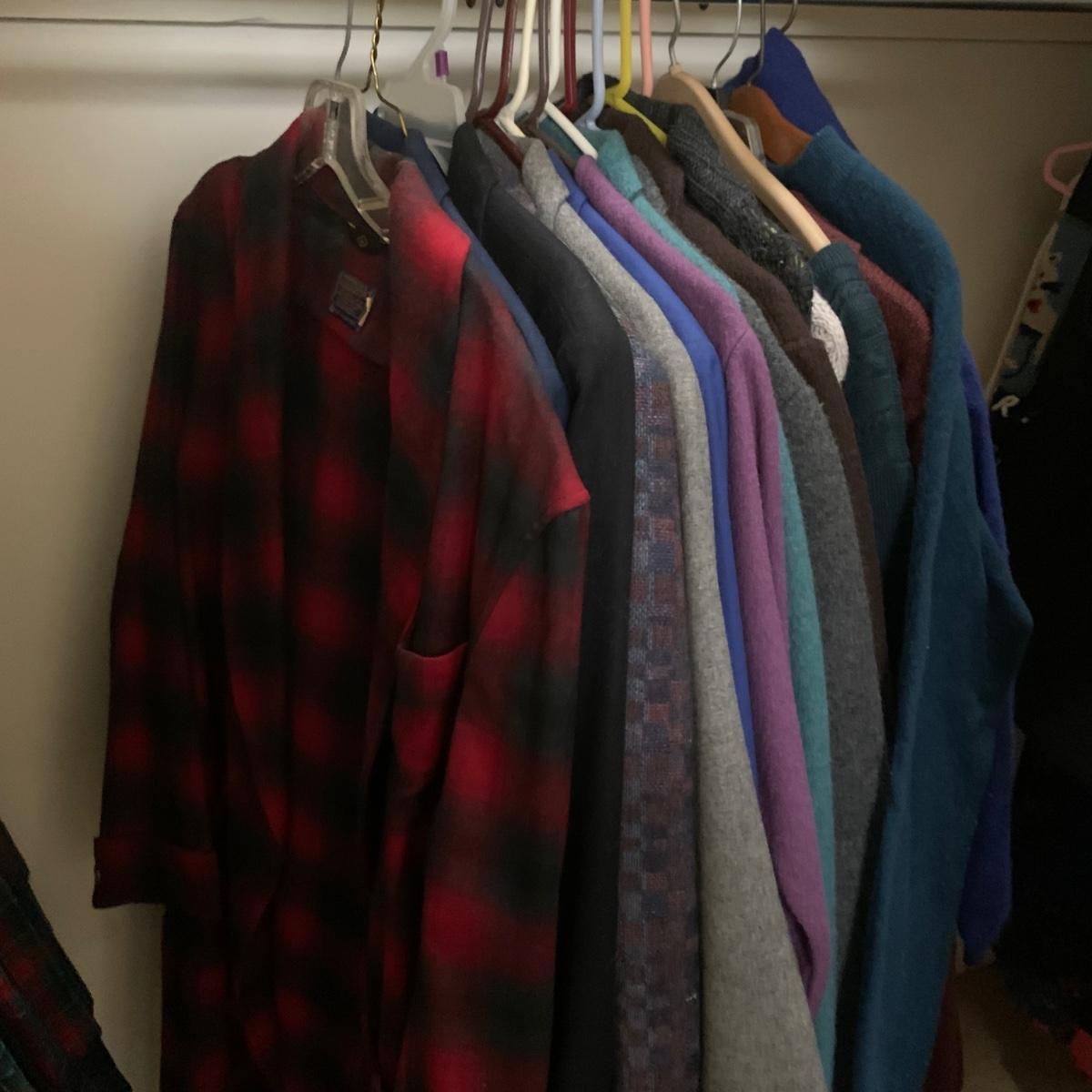 This lot includes two pant suits, one Pendleton Wool robe, and twelve other wool tops. Wool top brands include Pendleton, Norm Thompson, Inis Crafts, Flen Eagles of Scotland, and more! All items are in good condition and sizes range from medium to large. Pant suit sizes are 12P.