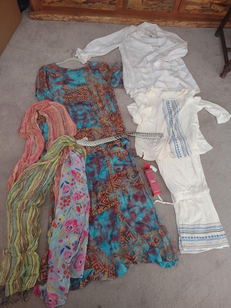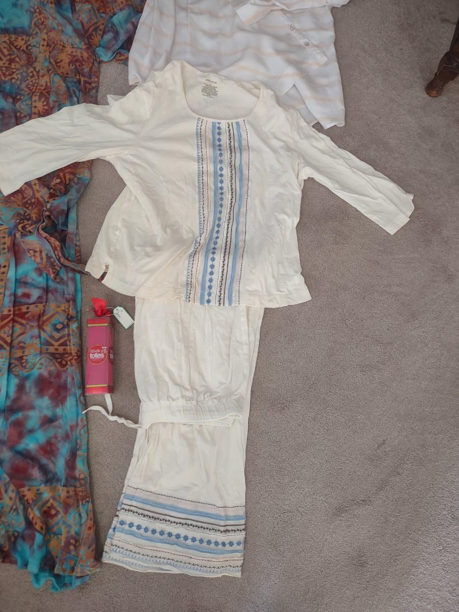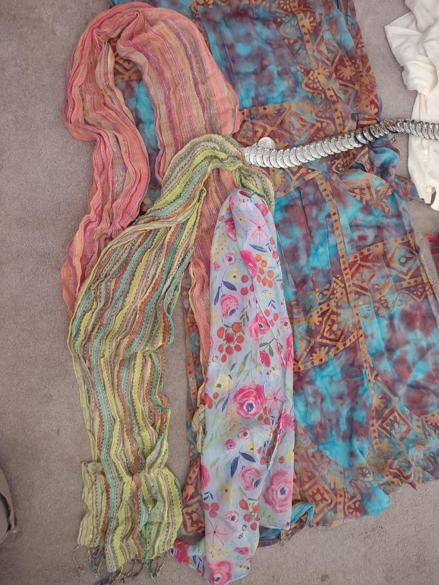 WOMENS PJ OUTFIT, COLORFUL SCARVES, MATCHING TOP AND BOTTOM