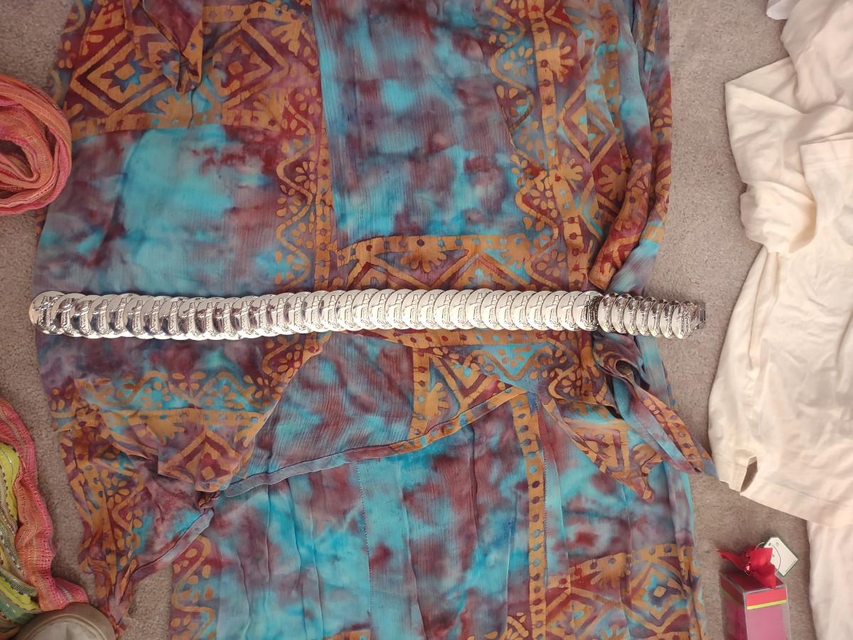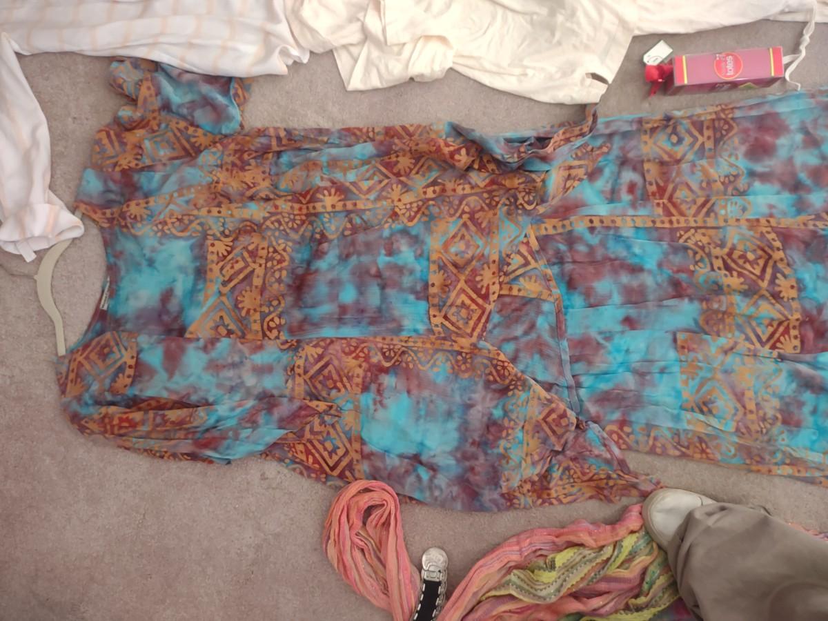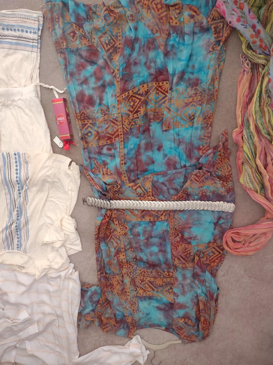 WOMENS PJ OUTFIT, COLORFUL SCARVES, MATCHING TOP AND BOTTOM