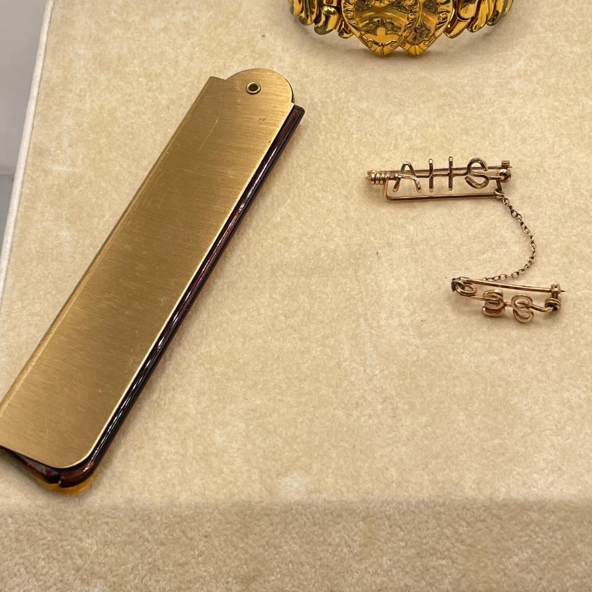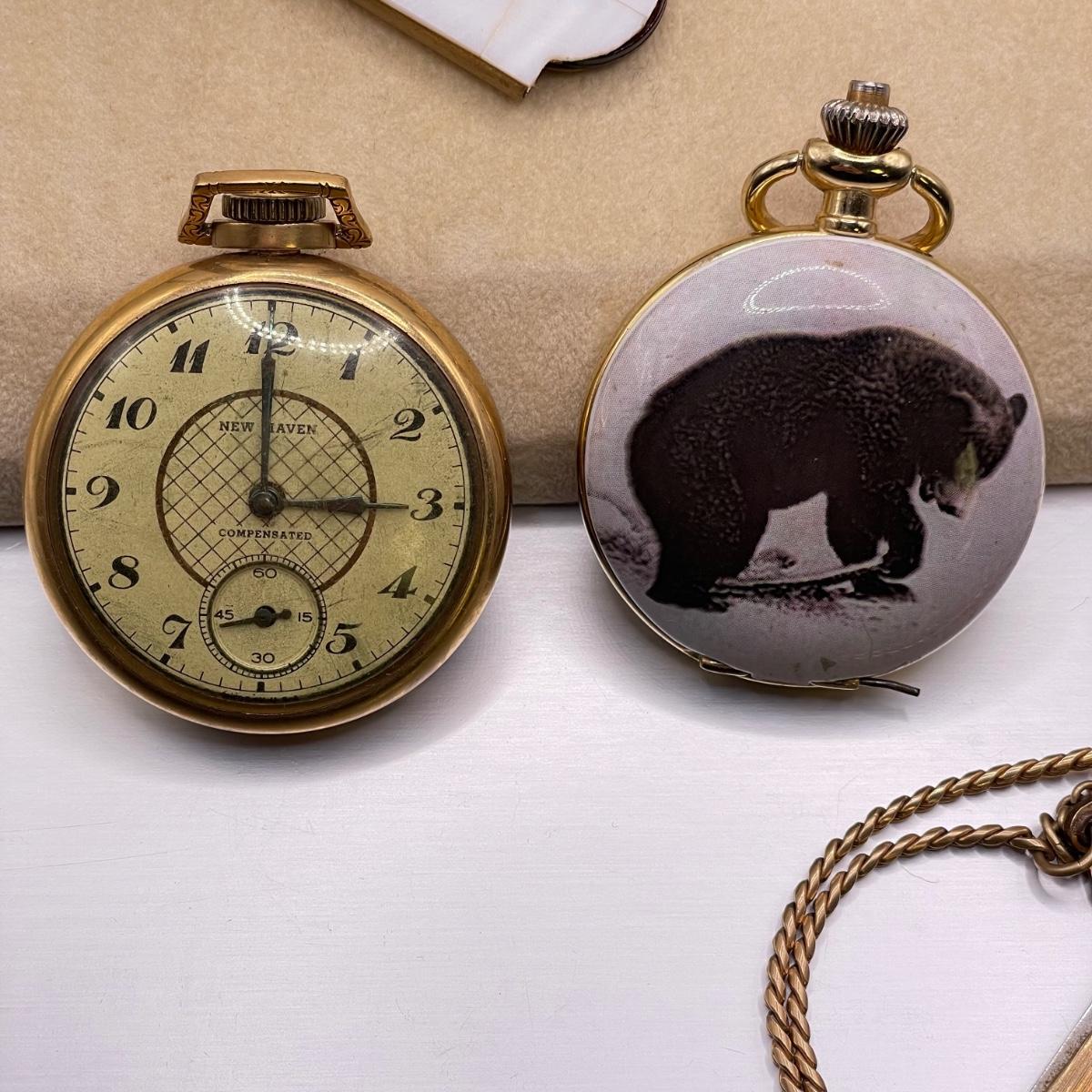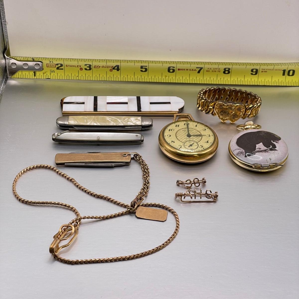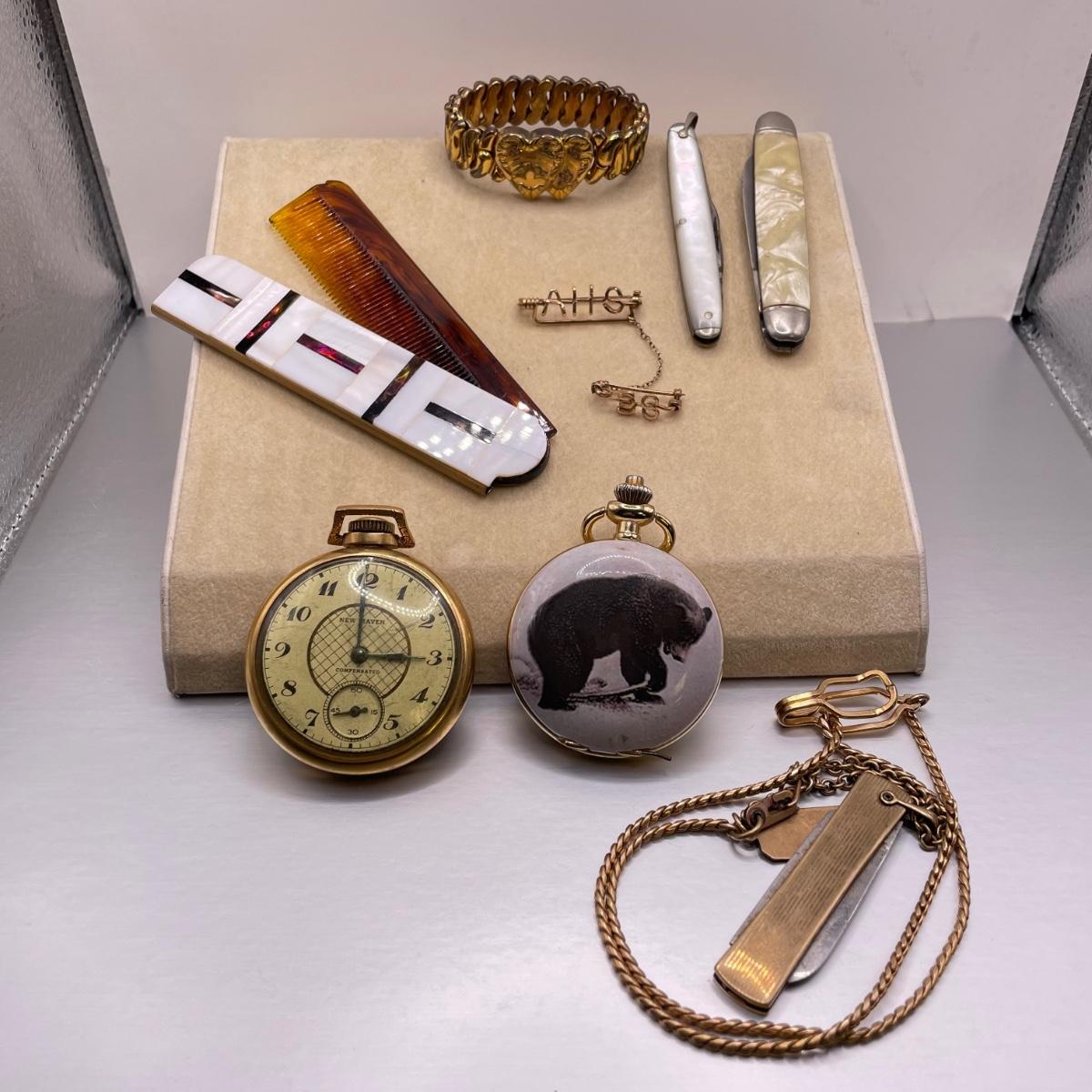 A fun selection for your pocket! Lot includes three pocket knives, one has an unmarked chain. The largest of the three did not immediately open, but it appears to have one blade. Lot includes a turtle-shell-like folding comb, a double pin “AHS” and “1938”, two pocket watches and an elastic metal bracelet. Some of the finish has worn away from the bracelet. The newer of the two pocket watches with the bear seems to have its hinge pulling out. Neither of the watches are currently working. See images. All sales are final. No returns or refunds. Please bid accordingly. Shipping available.