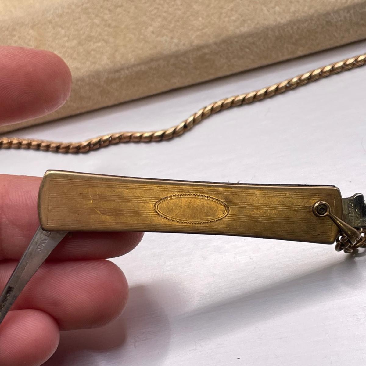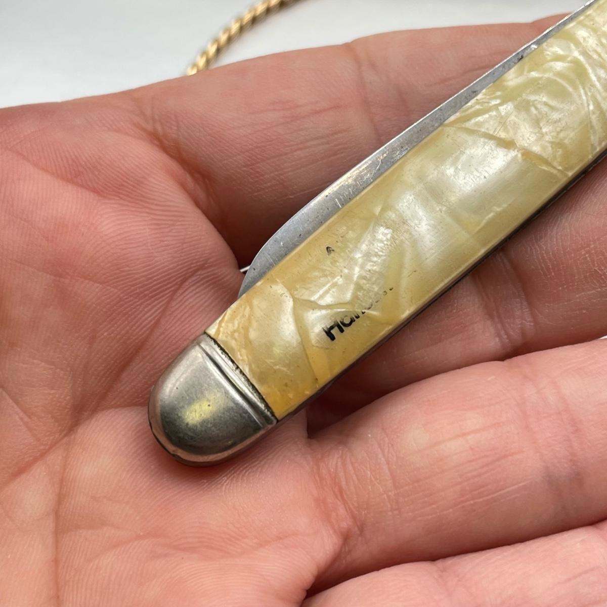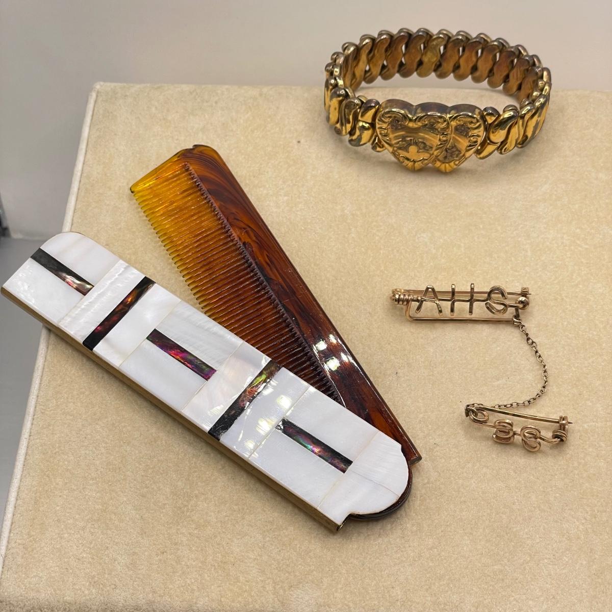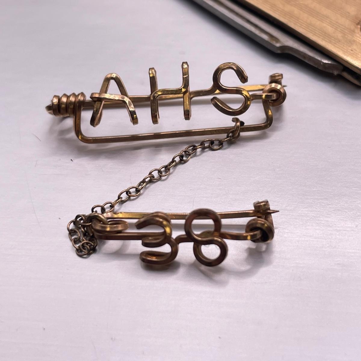 A fun selection for your pocket! Lot includes three pocket knives, one has an unmarked chain. The largest of the three did not immediately open, but it appears to have one blade. Lot includes a turtle-shell-like folding comb, a double pin “AHS” and “1938”, two pocket watches and an elastic metal bracelet. Some of the finish has worn away from the bracelet. The newer of the two pocket watches with the bear seems to have its hinge pulling out. Neither of the watches are currently working. See images. All sales are final. No returns or refunds. Please bid accordingly. Shipping available.
