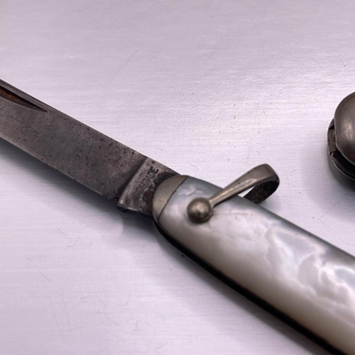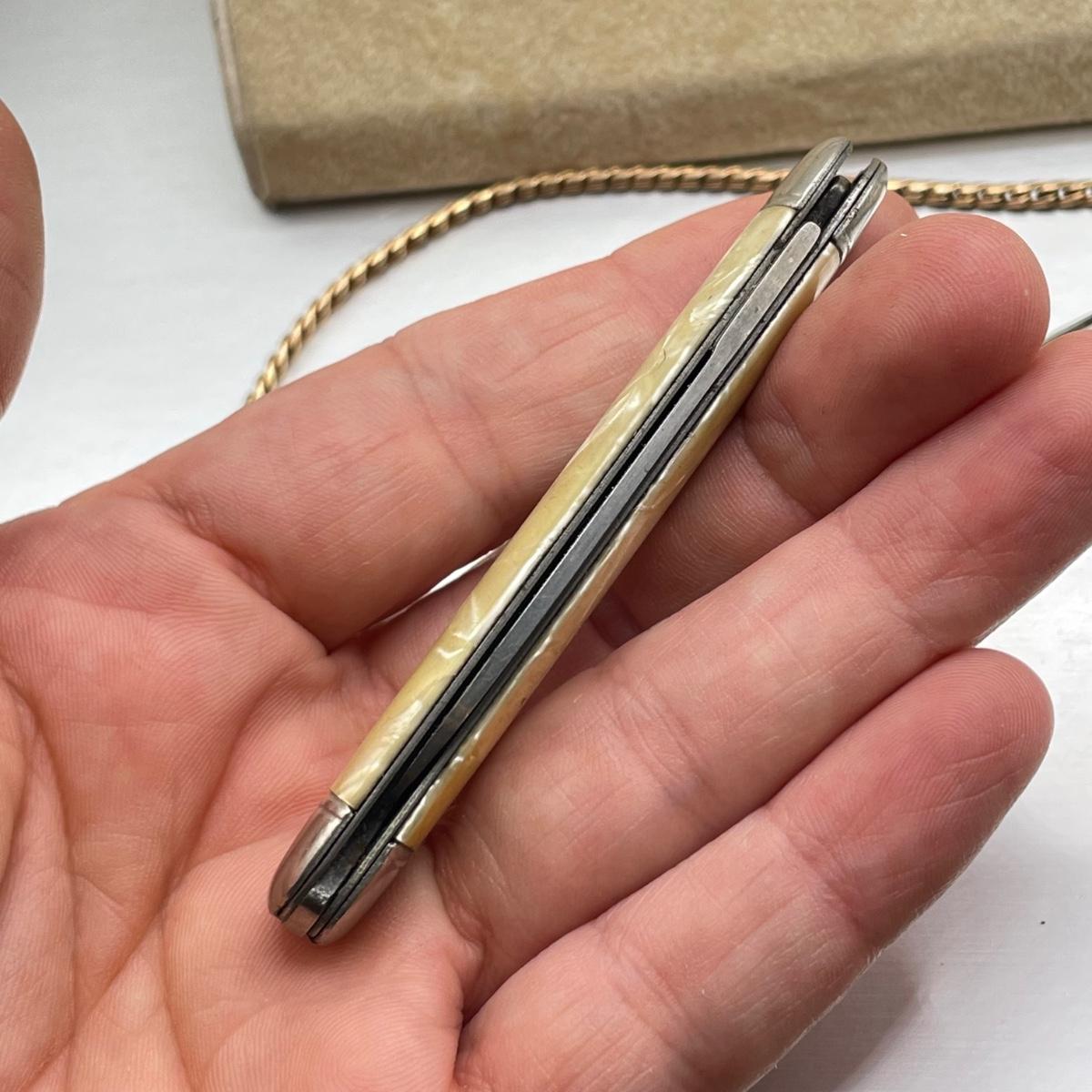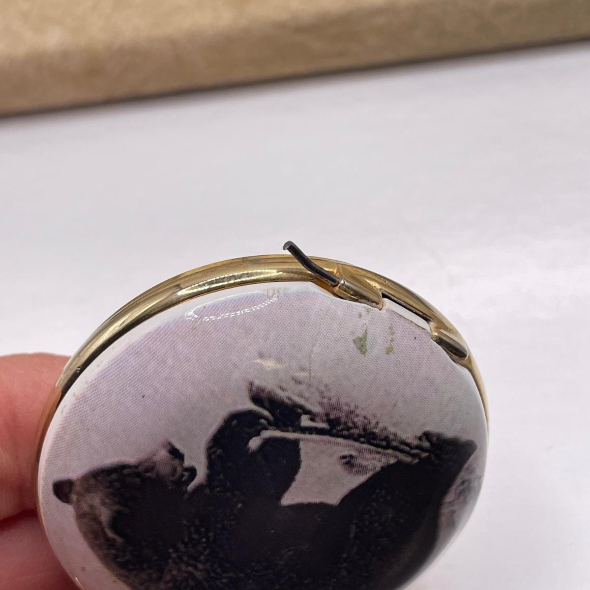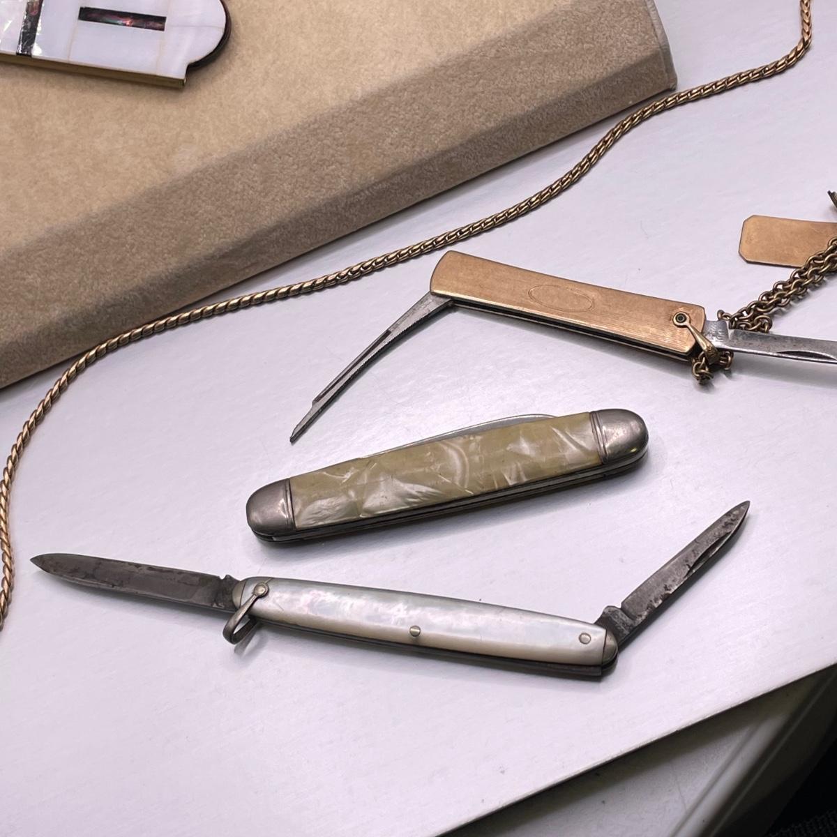 A fun selection for your pocket! Lot includes three pocket knives, one has an unmarked chain. The largest of the three did not immediately open, but it appears to have one blade. Lot includes a turtle-shell-like folding comb, a double pin “AHS” and “1938”, two pocket watches and an elastic metal bracelet. Some of the finish has worn away from the bracelet. The newer of the two pocket watches with the bear seems to have its hinge pulling out. Neither of the watches are currently working. See images. All sales are final. No returns or refunds. Please bid accordingly. Shipping available.