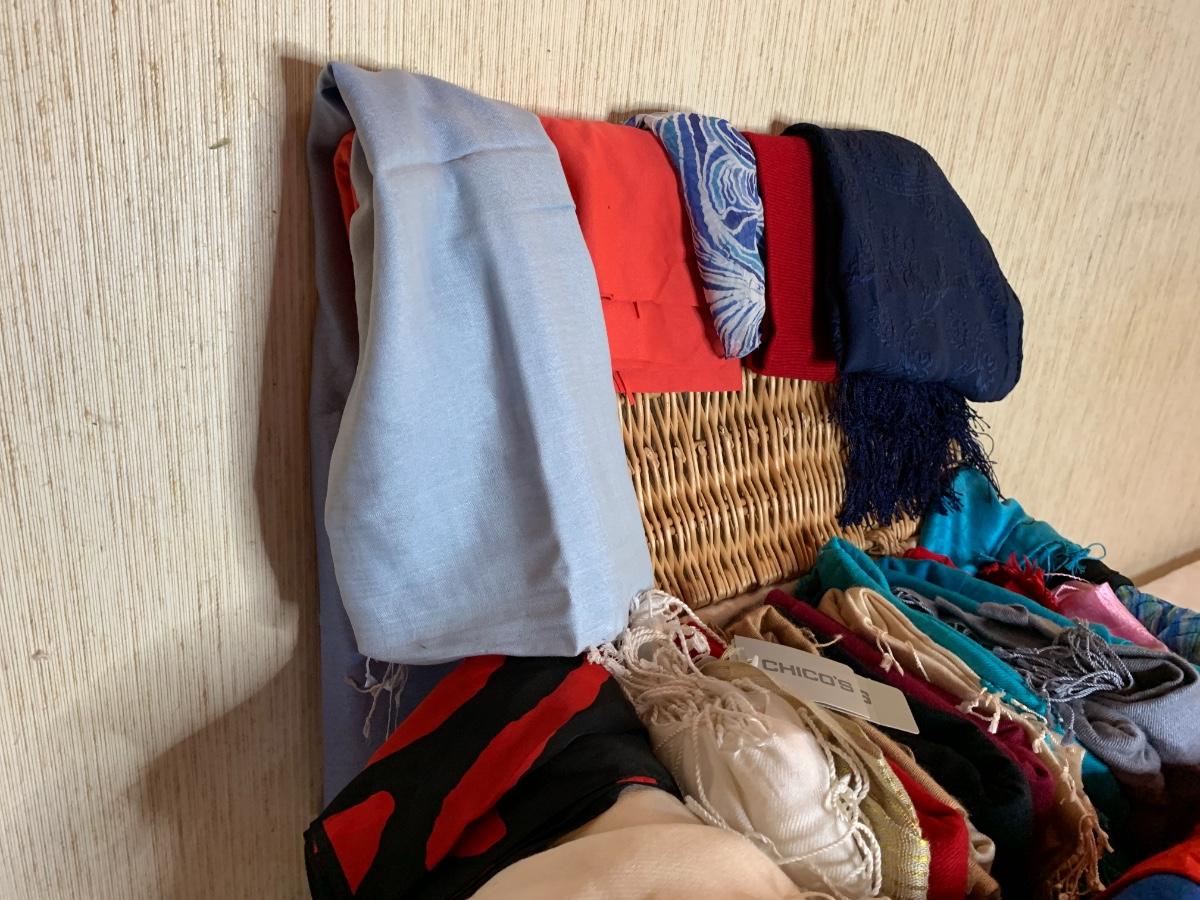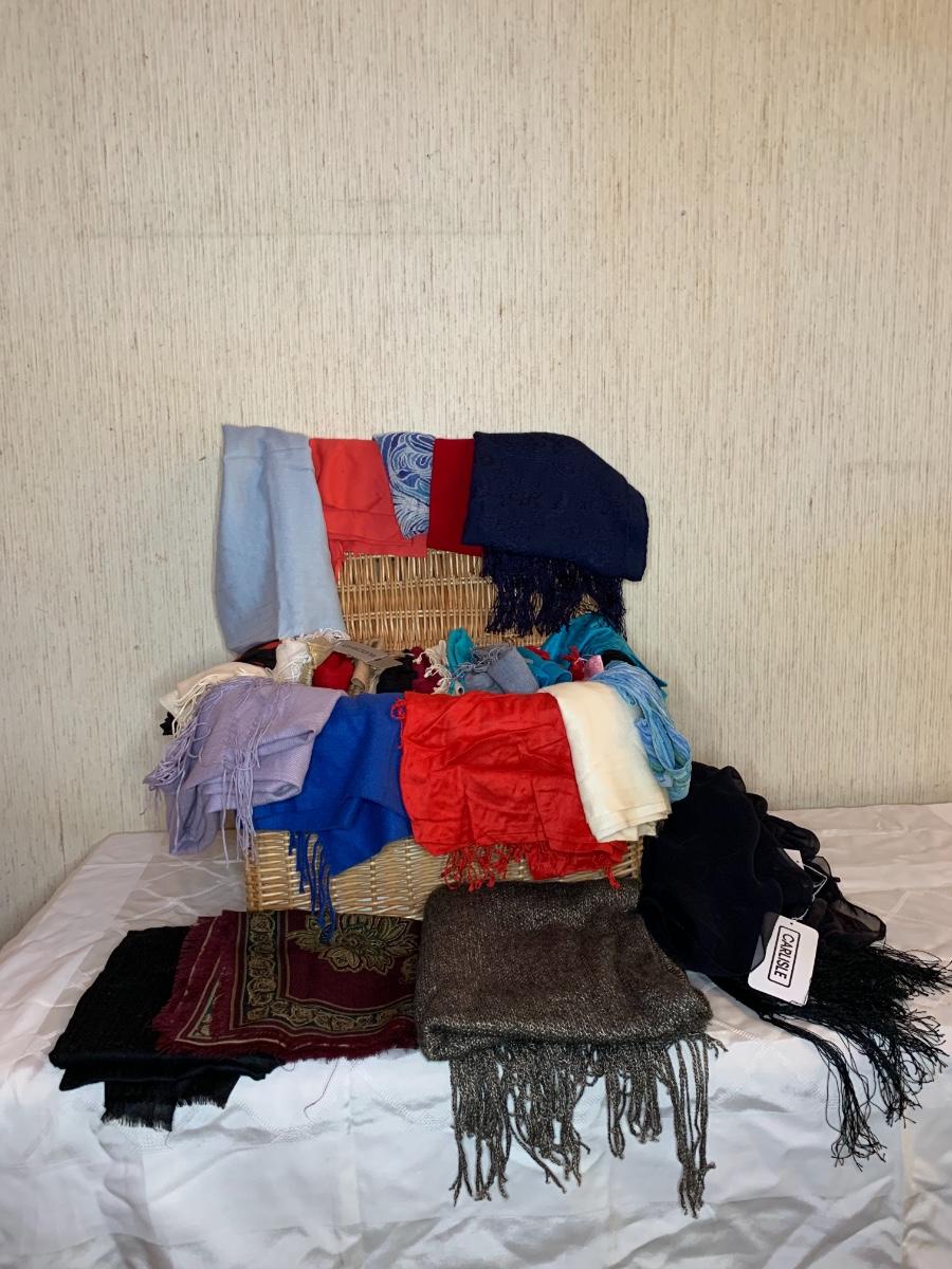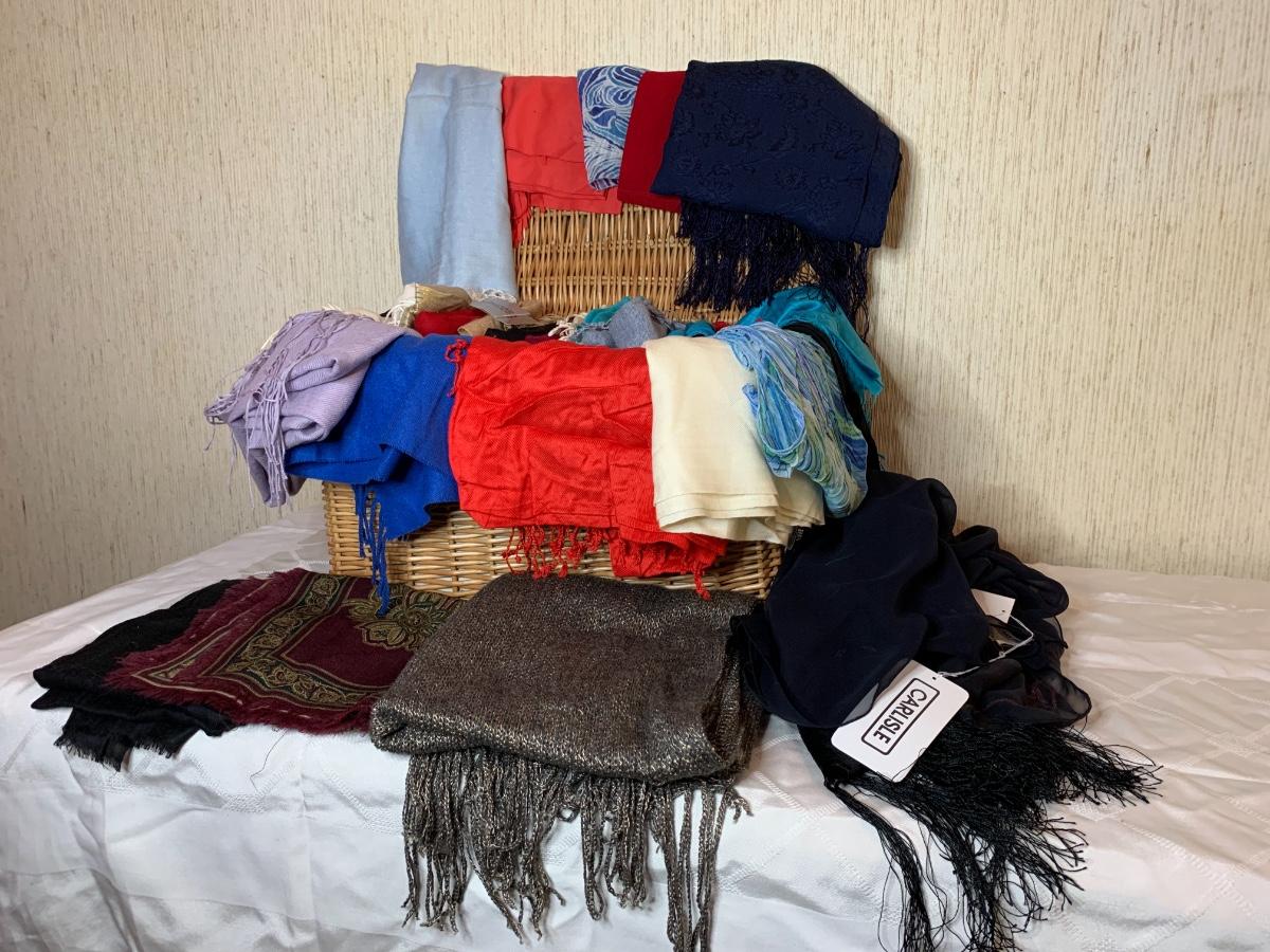 Assorted women's scarves and shawls with one whicker storage basket. All scarves and shawls in great condition some with tags still attached