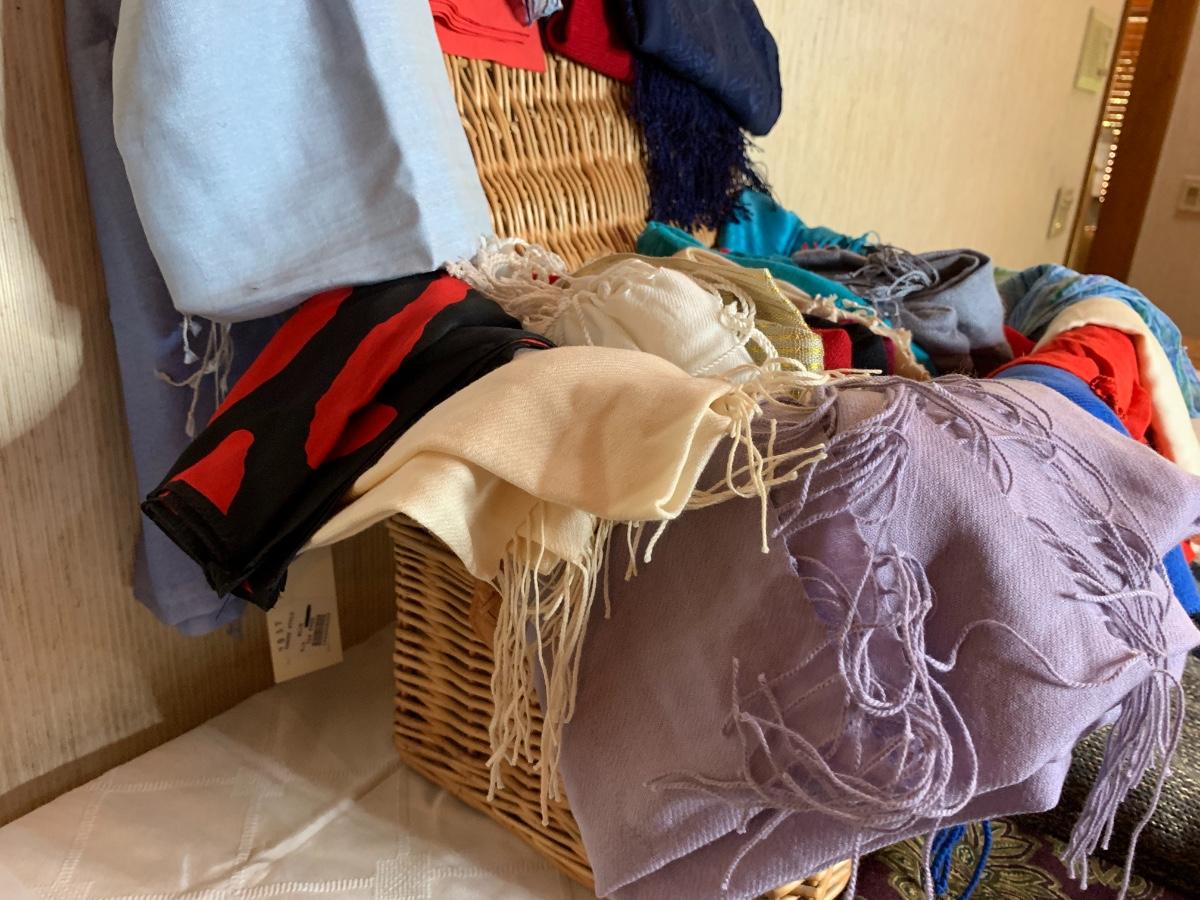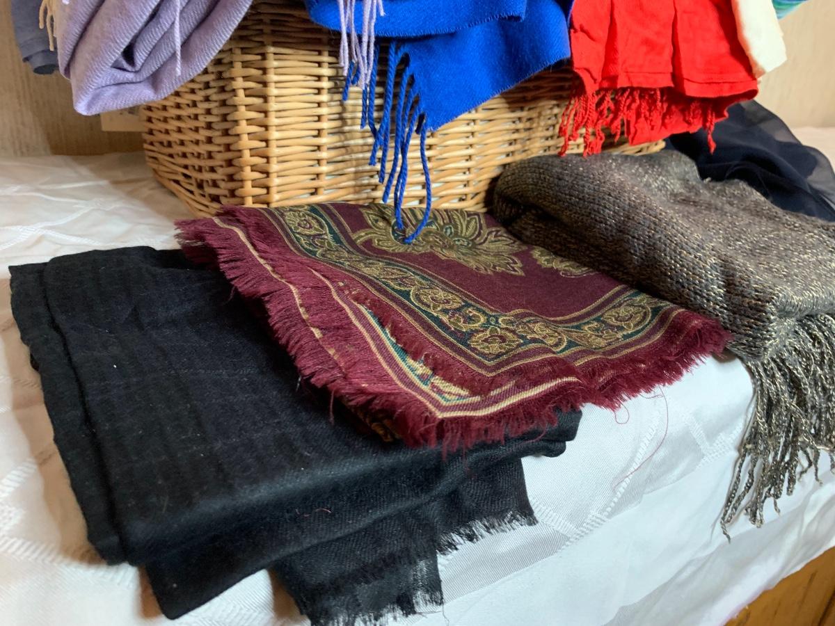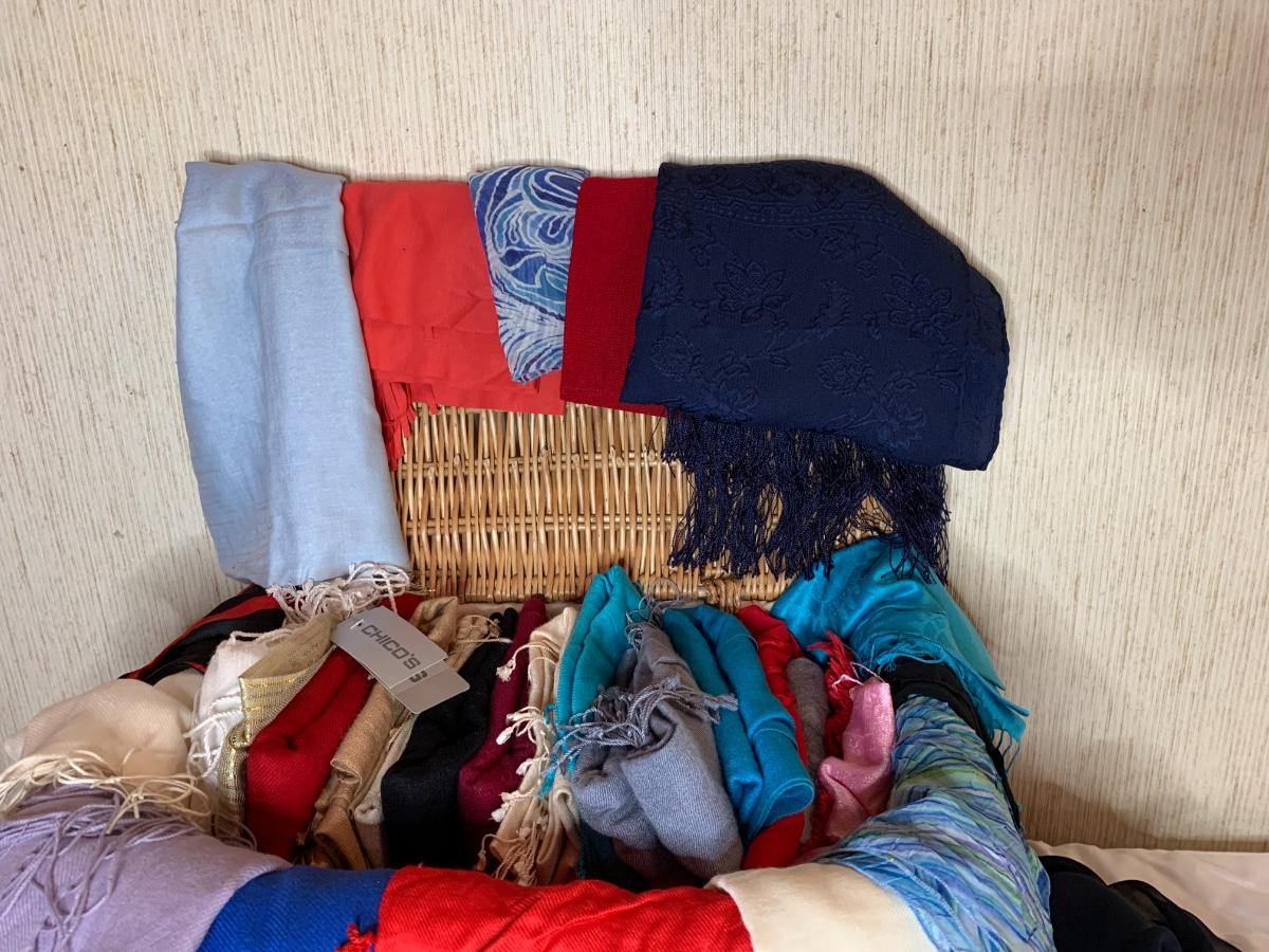 Assorted women's scarves and shawls with one whicker storage basket. All scarves and shawls in great condition some with tags still attached