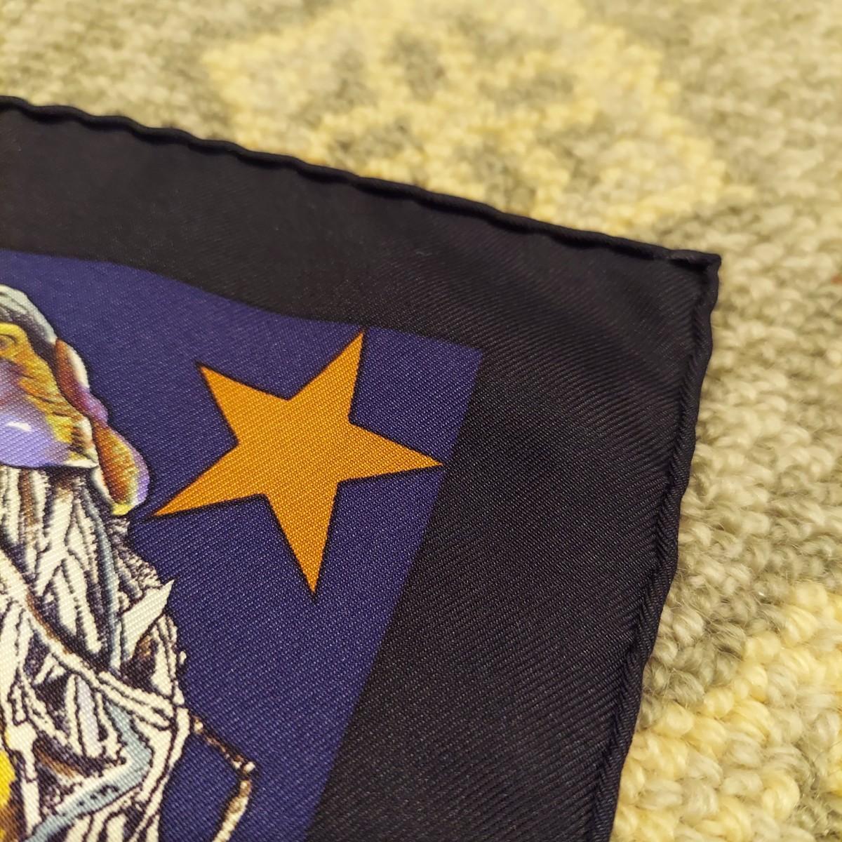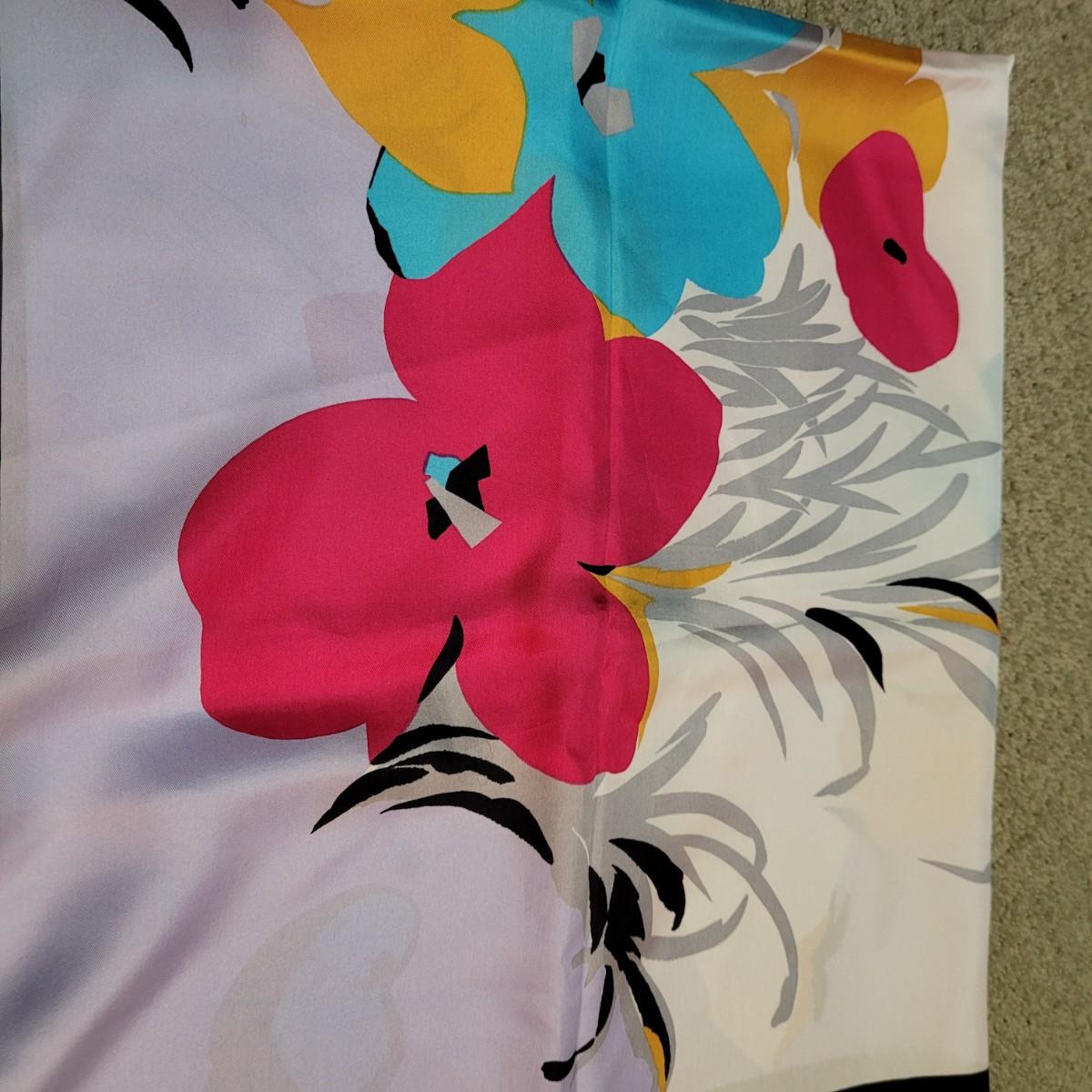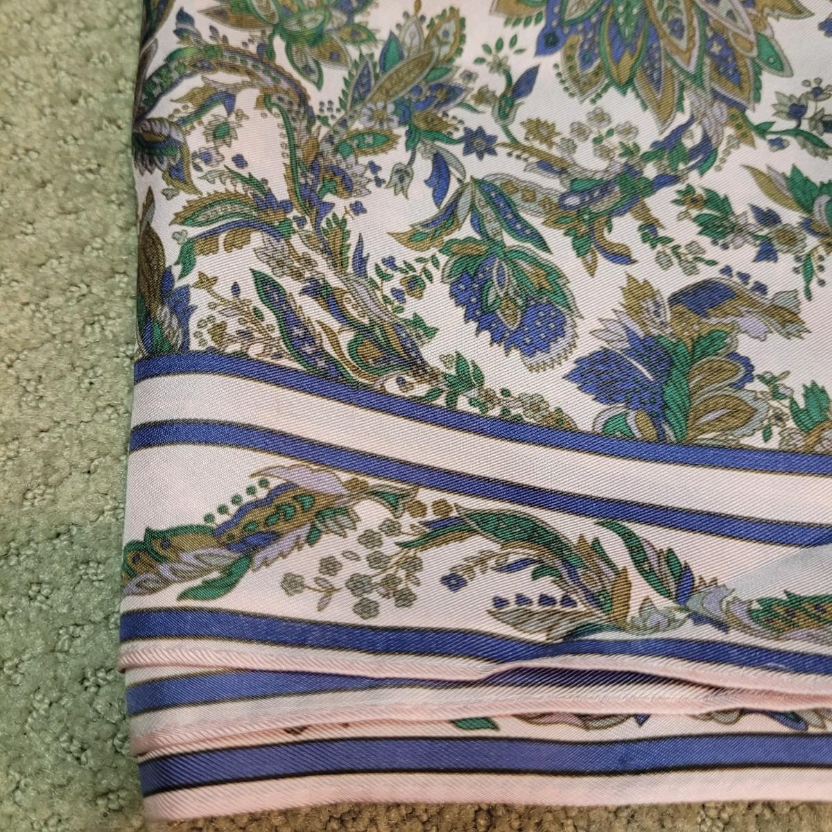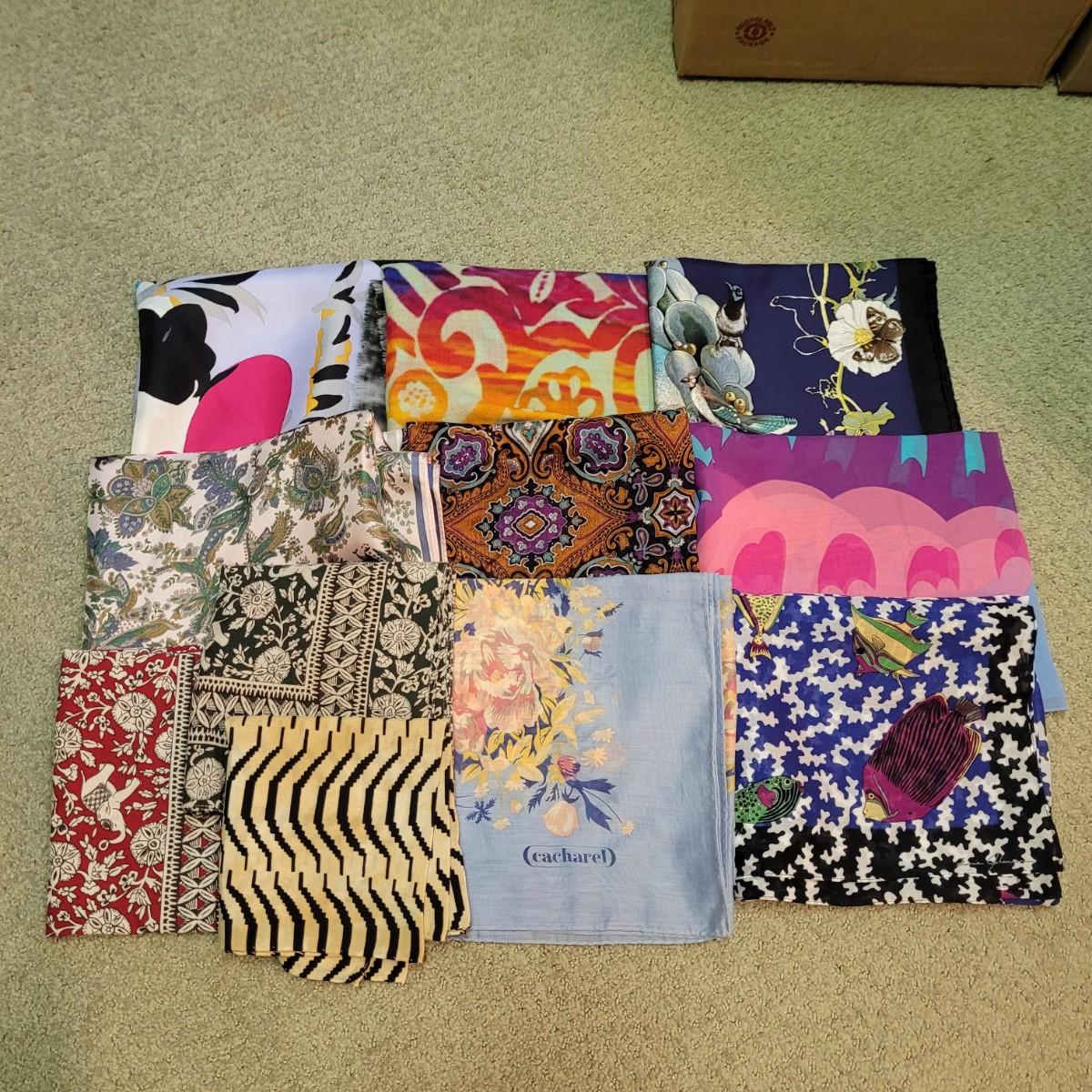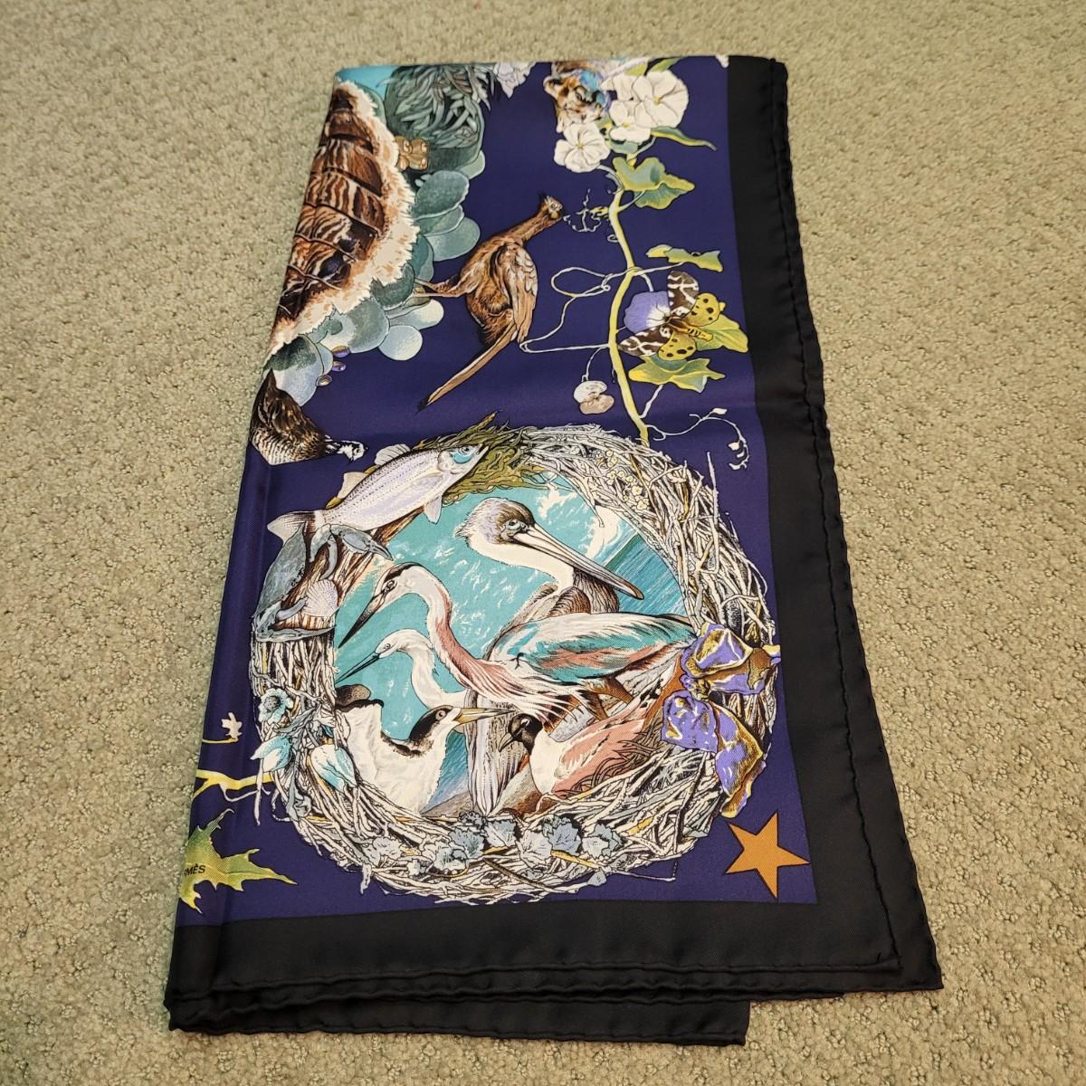Hermès square silk scarf in Texas Wildlife print. Has rolled edges and measures approximately 35"SQ. Also includes an assortment of large and small scarves that come in a variety of colors and prints. Included are five embroidered handkerchiefs. Large butterfly scarf measures approximately 34”SQ. Shipping available.