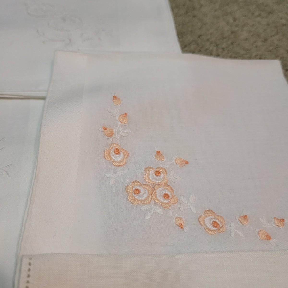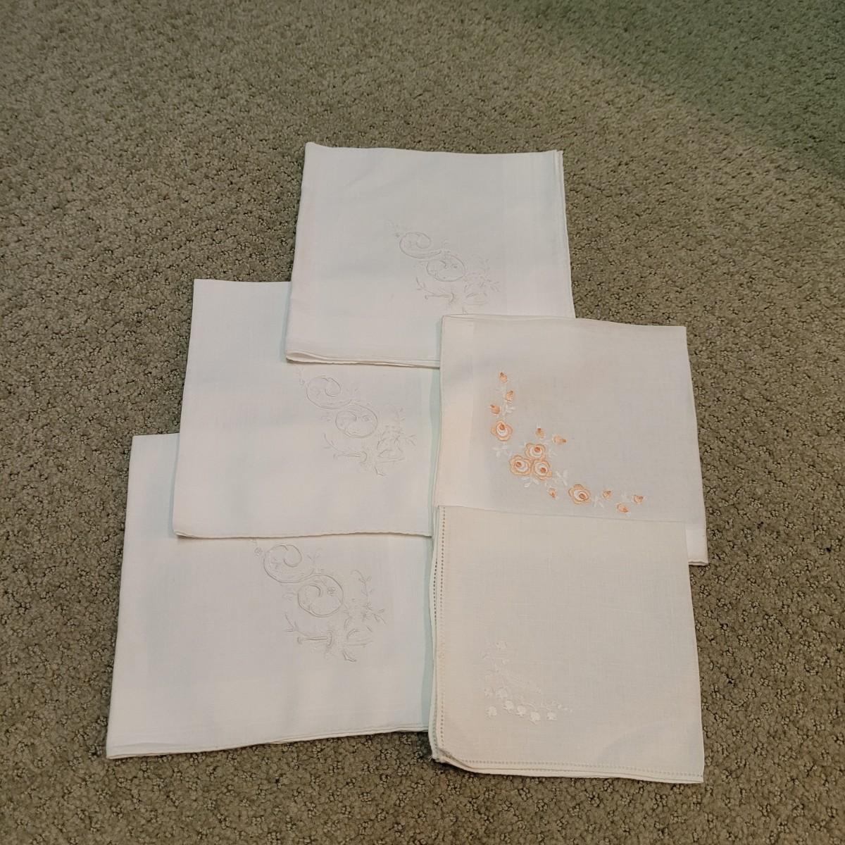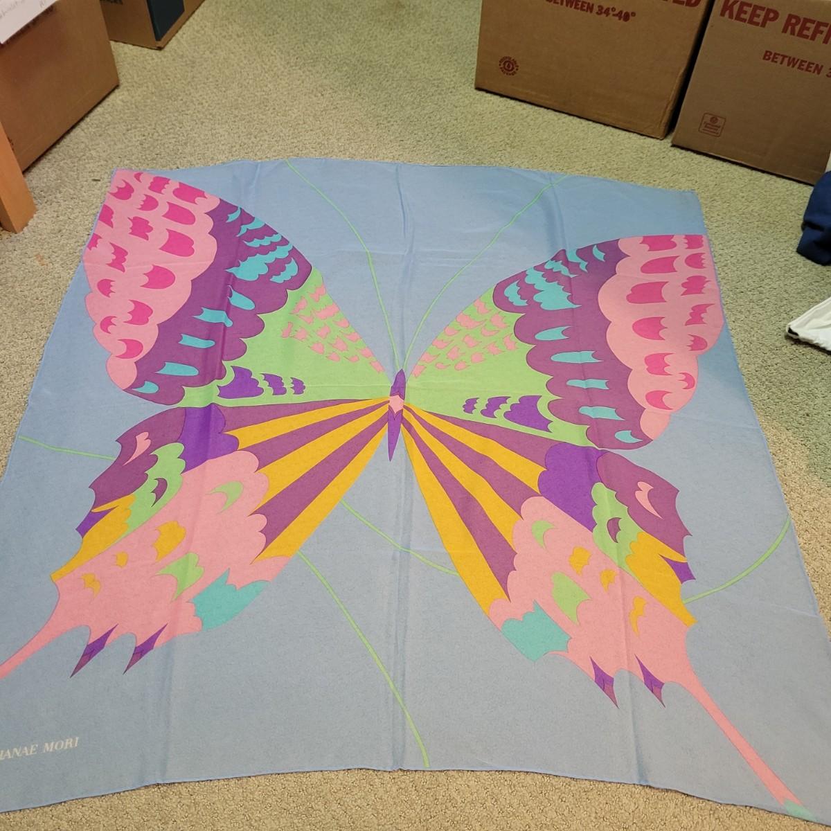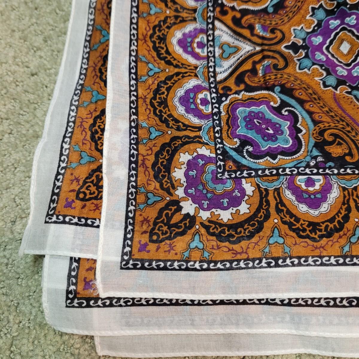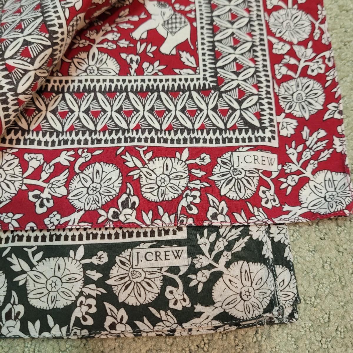 Hermès square silk scarf in Texas Wildlife print. Has rolled edges and measures approximately 35"SQ. Also includes an assortment of large and small scarves that come in a variety of colors and prints. Included are five embroidered handkerchiefs. Large butterfly scarf measures approximately 34”SQ. Shipping available.