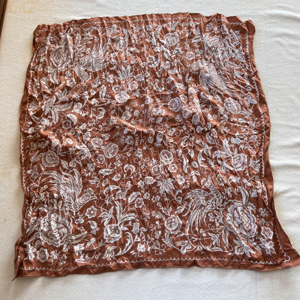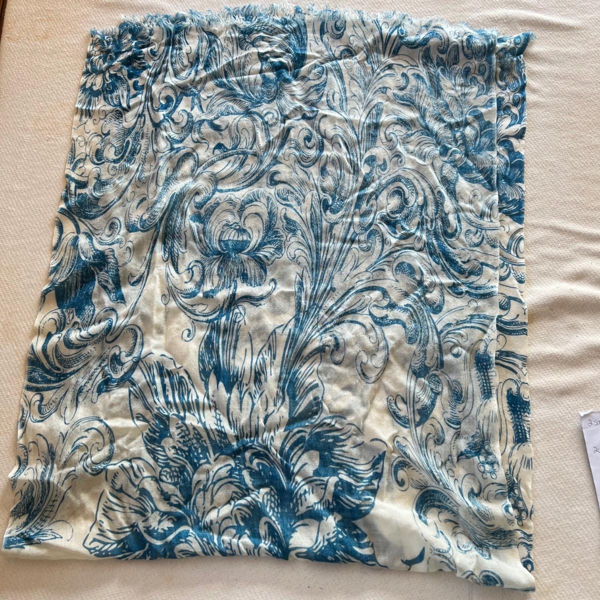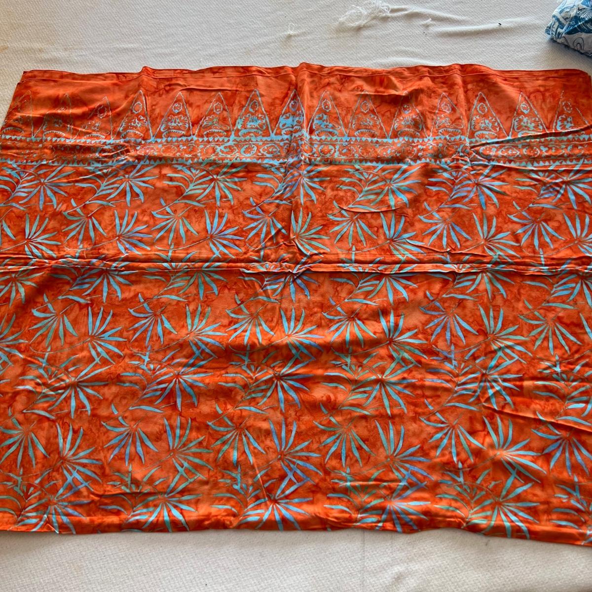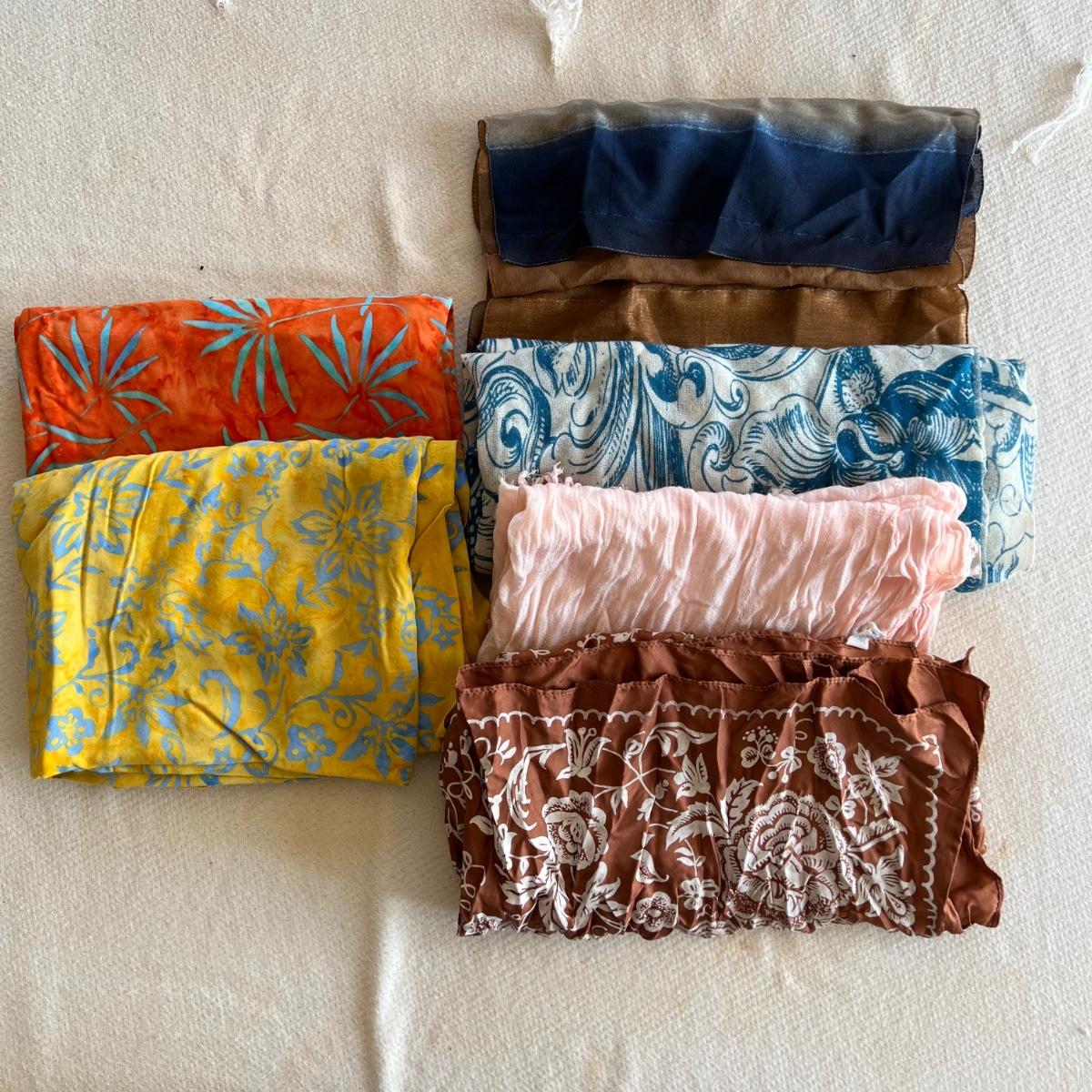 Two sarong-like garments each measuring 43” x 64”. A Blue and cream design scarf approximately 26” x 70”. Do note snags in garment as photographed. A brown and blue scarf measuring 24” x 12.5”. A pink scarf measuring 22” x 60” and a 30” x 30” brown square scarf. All garments gently used.