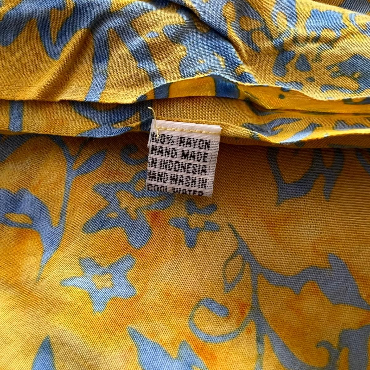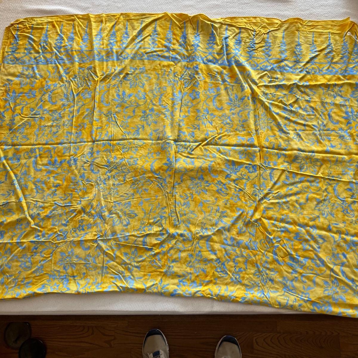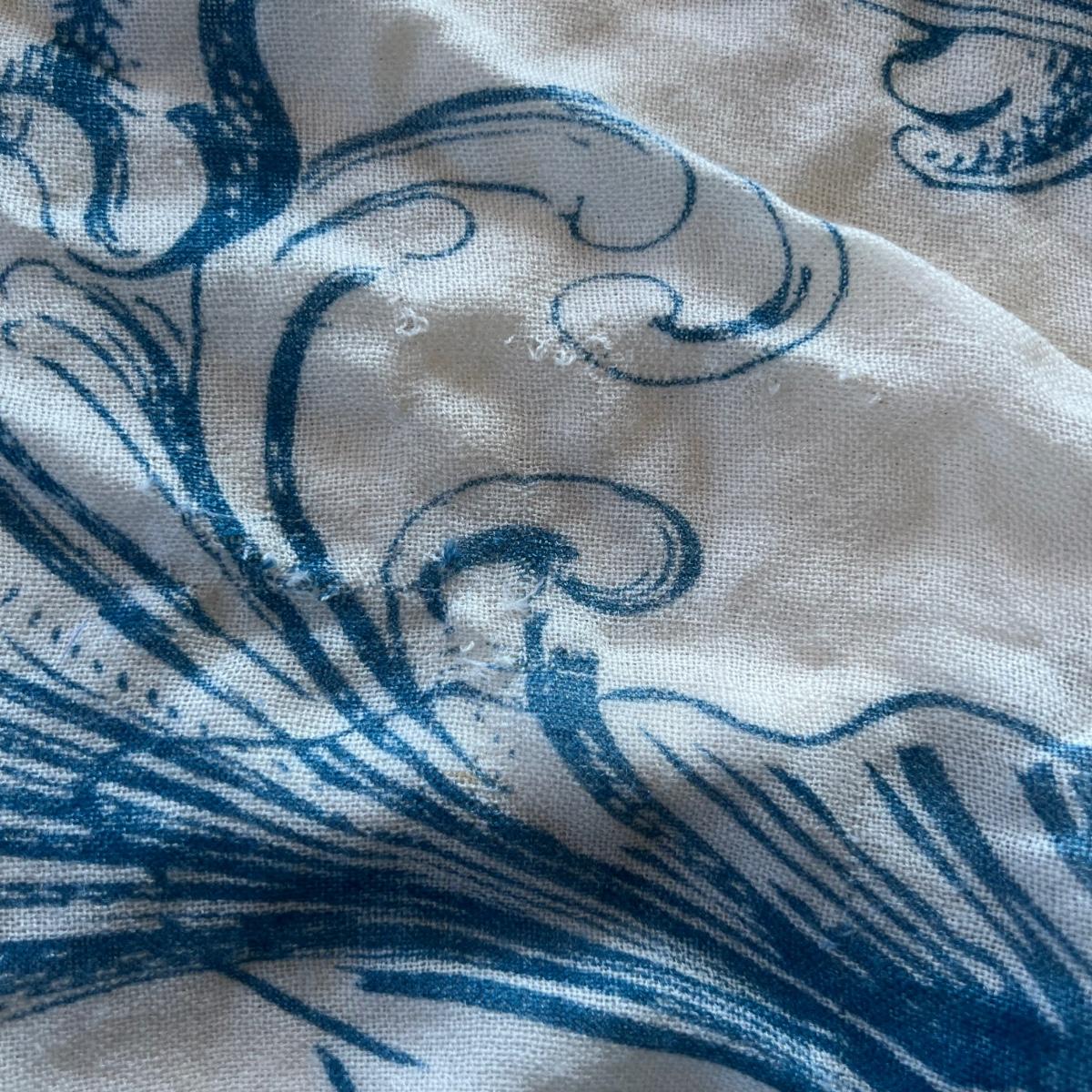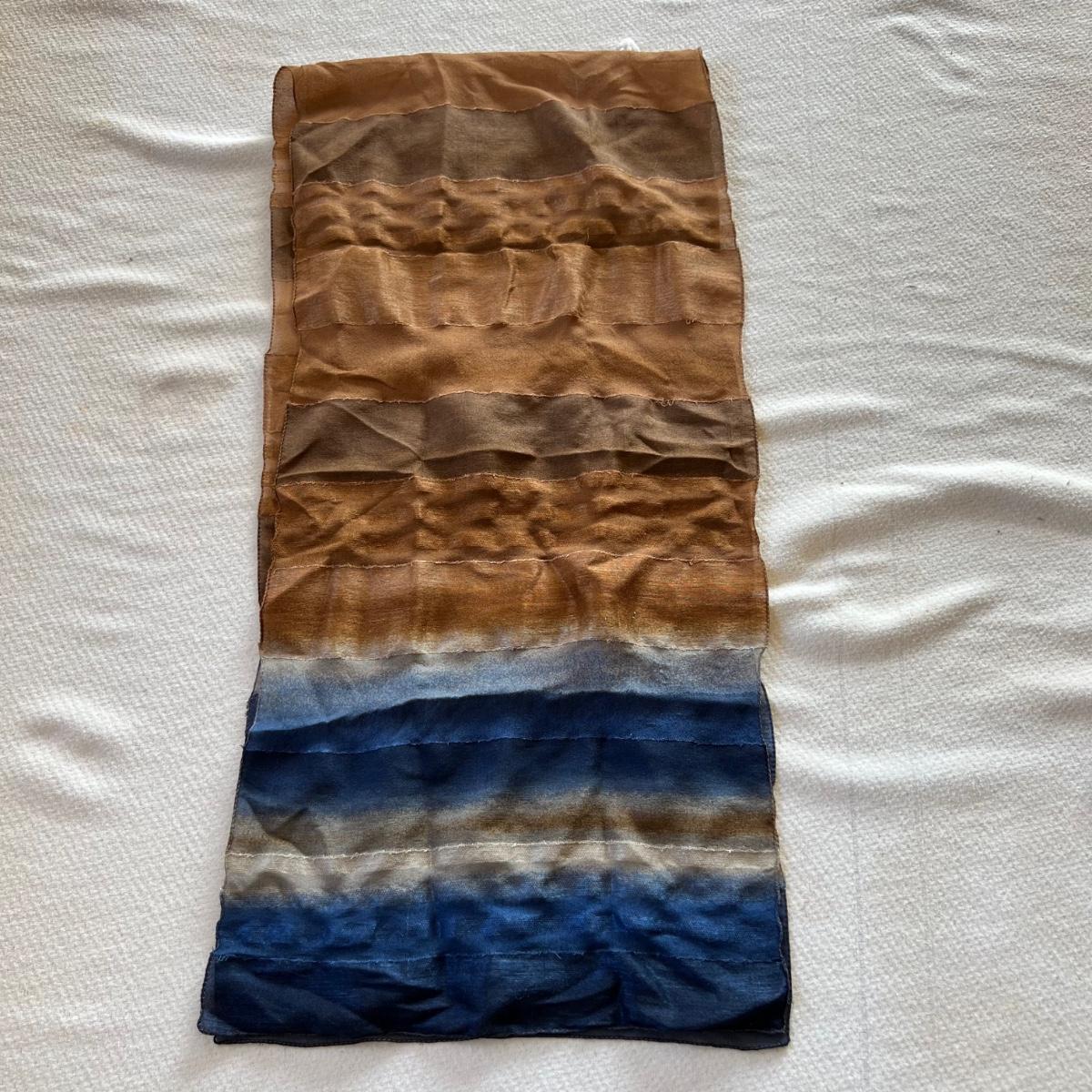 Two sarong-like garments each measuring 43” x 64”. A Blue and cream design scarf approximately 26” x 70”. Do note snags in garment as photographed. A brown and blue scarf measuring 24” x 12.5”. A pink scarf measuring 22” x 60” and a 30” x 30” brown square scarf. All garments gently used.