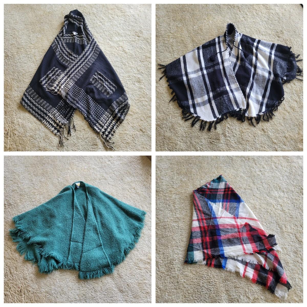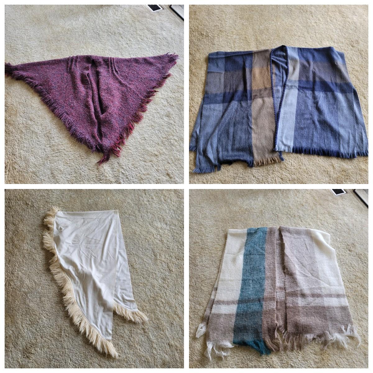 This large variety of women’s shawls includes Irish wool shawls, acrylic shawls and more, in many colors and styles. Slight staining on some (see photos). Shipping available.